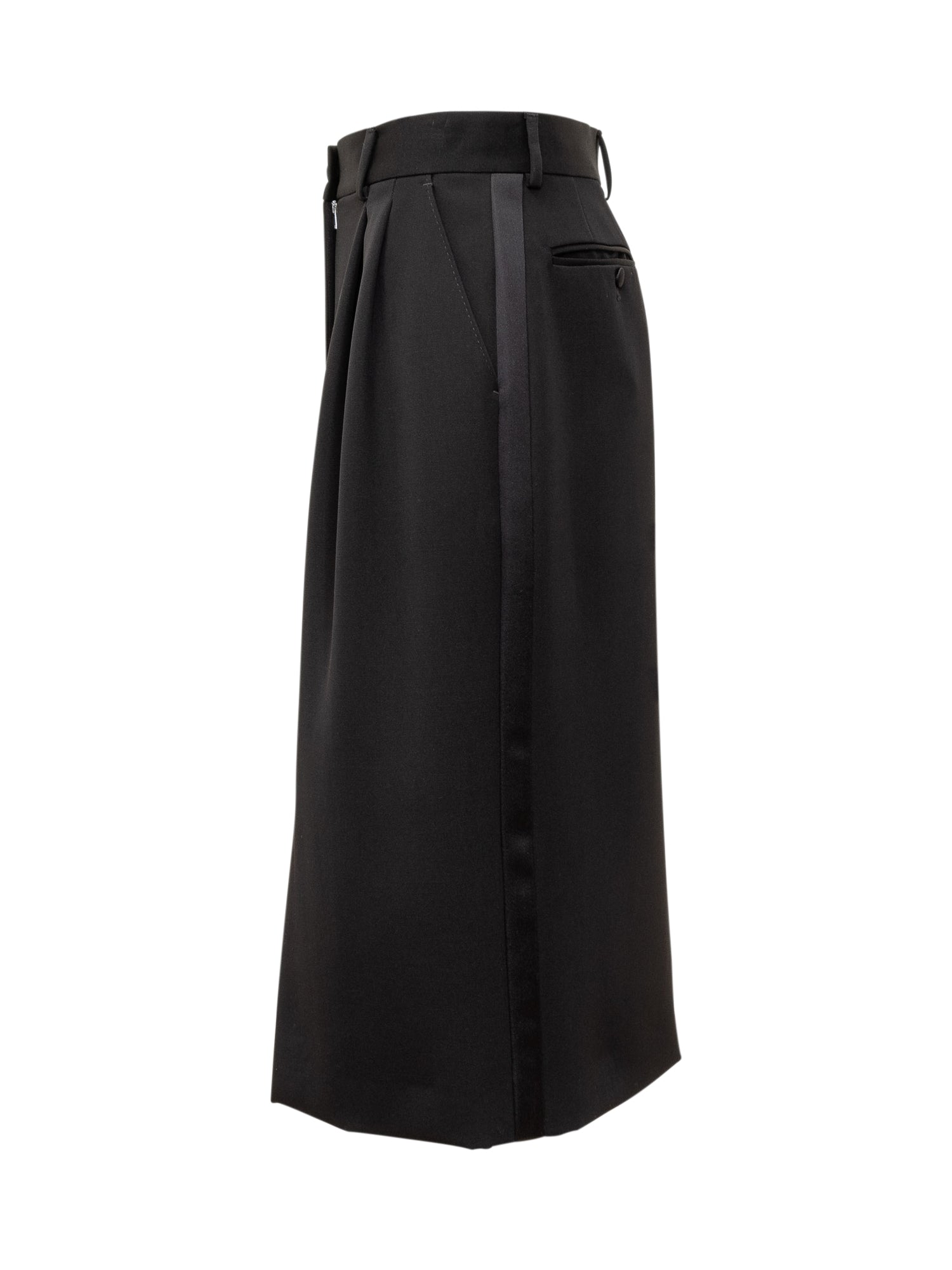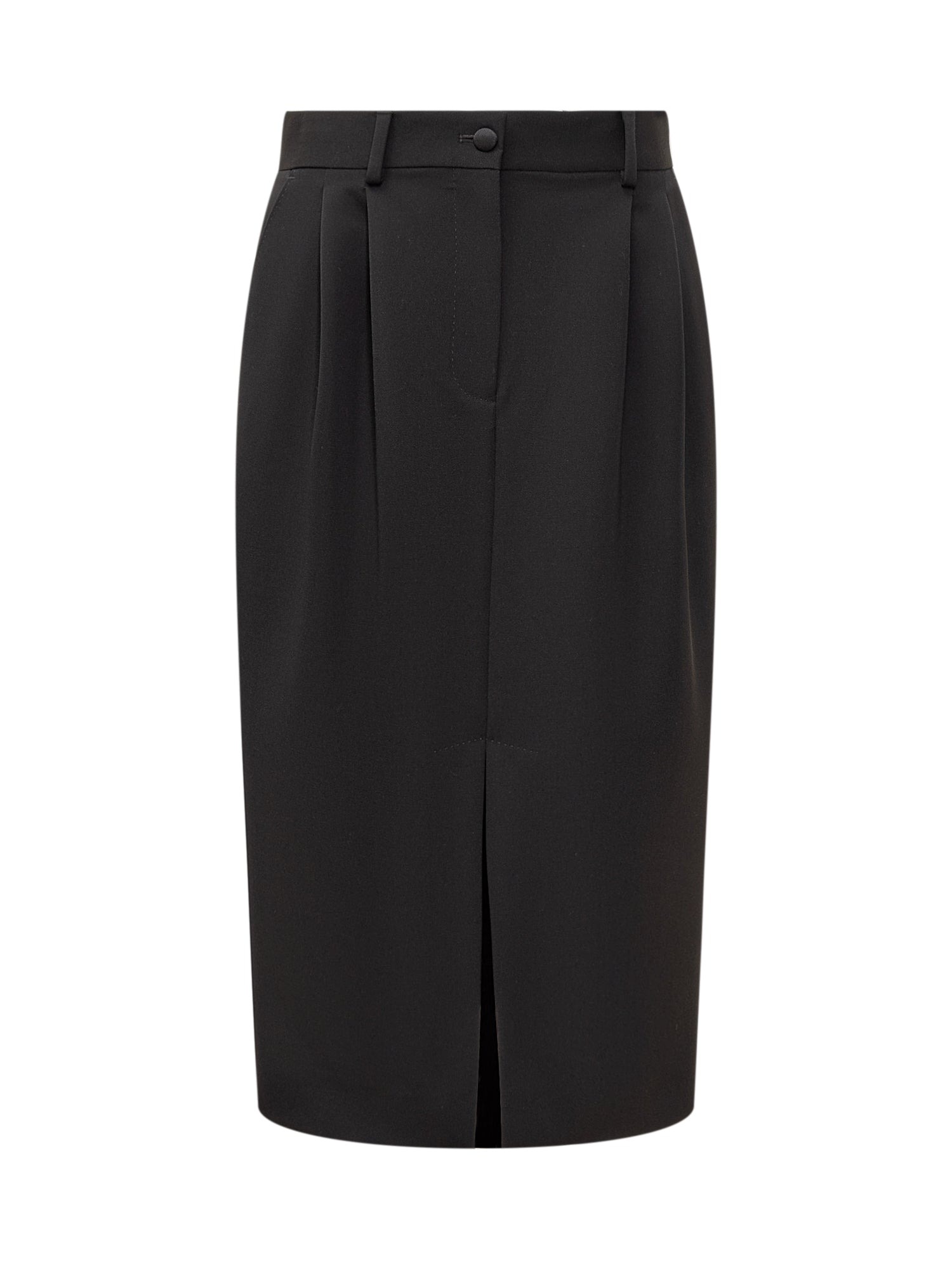 Long skirt with button and zipper closure. Belt loops. Four pockets.