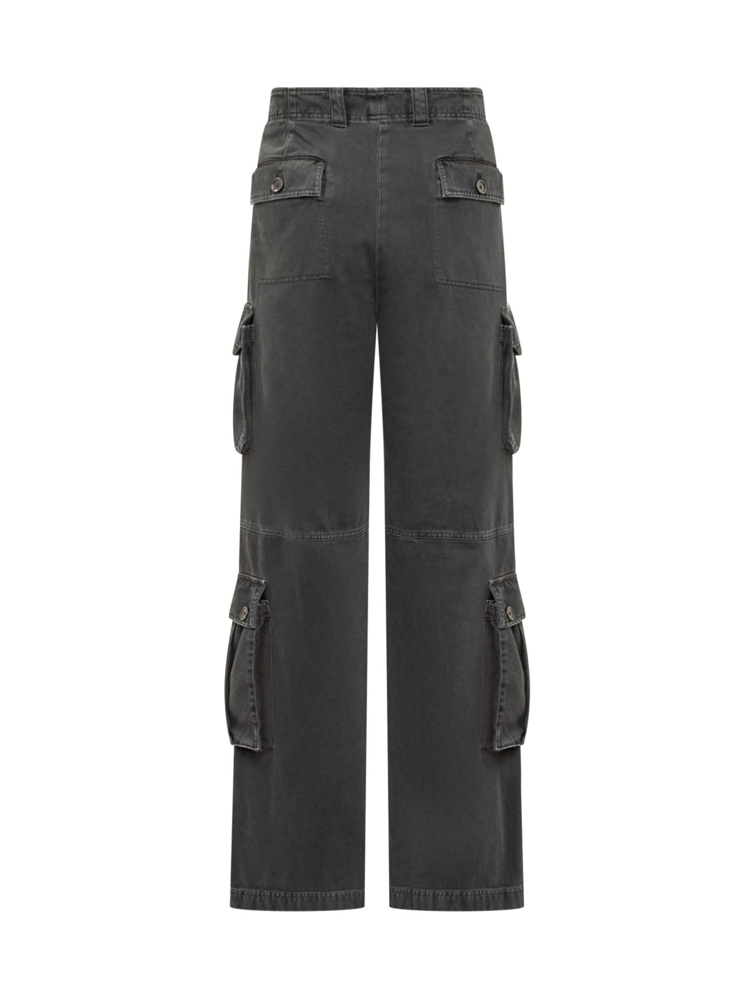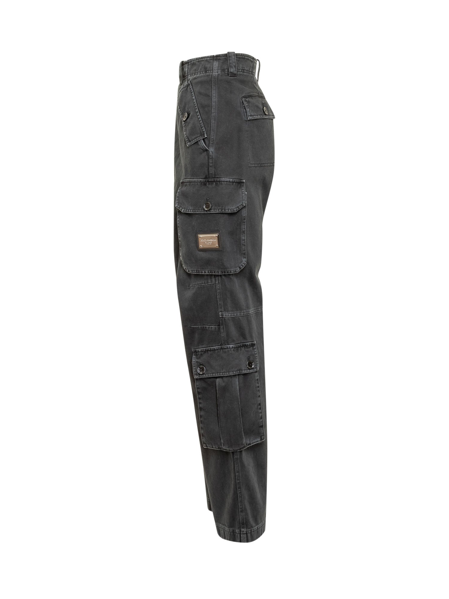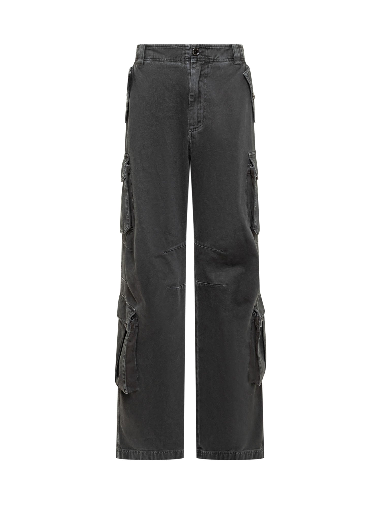 Wide leg cargo pants. Zipper and button closure. Belt loops. All-over pockets. Applied logo tag on one pocket.