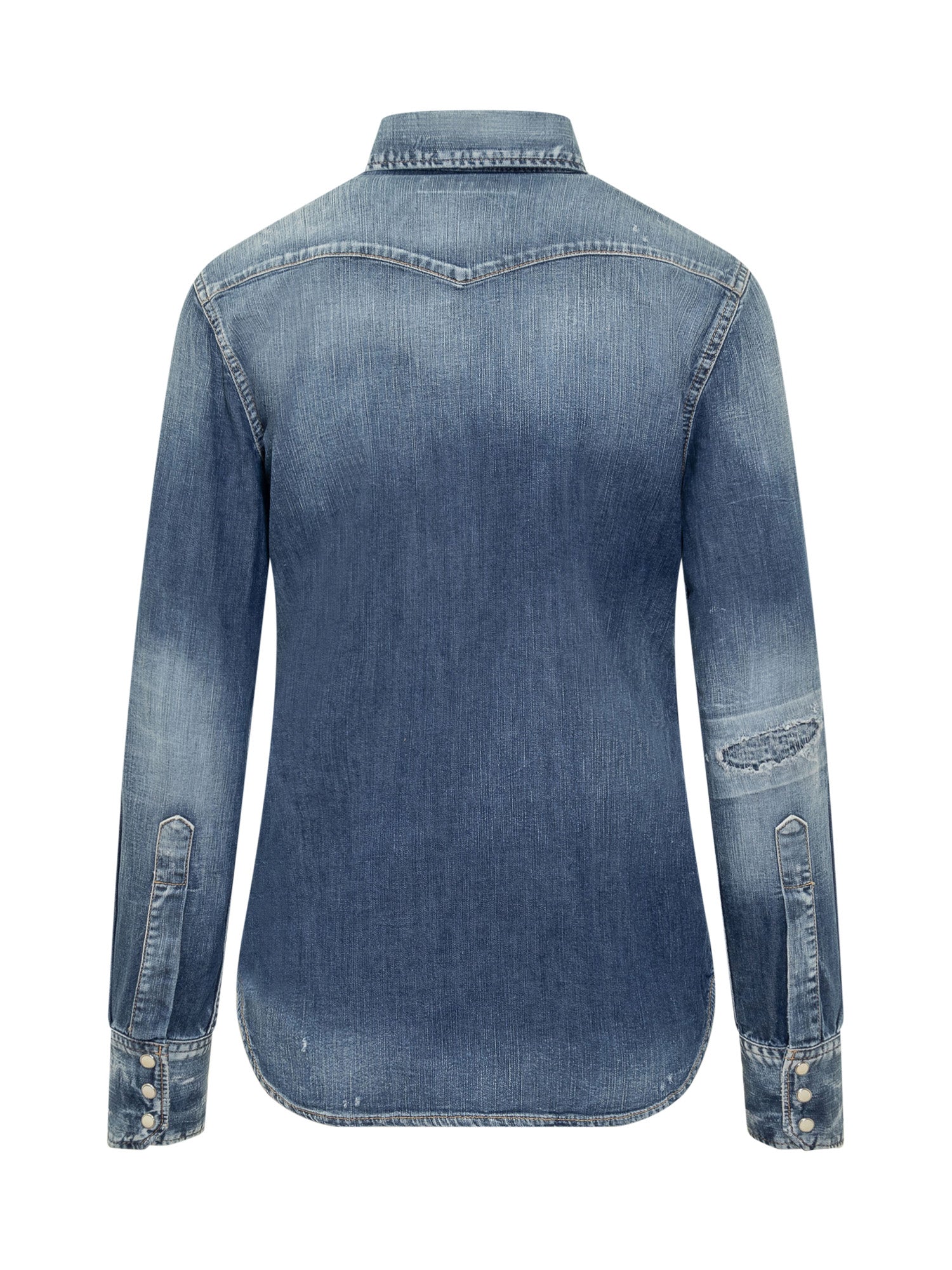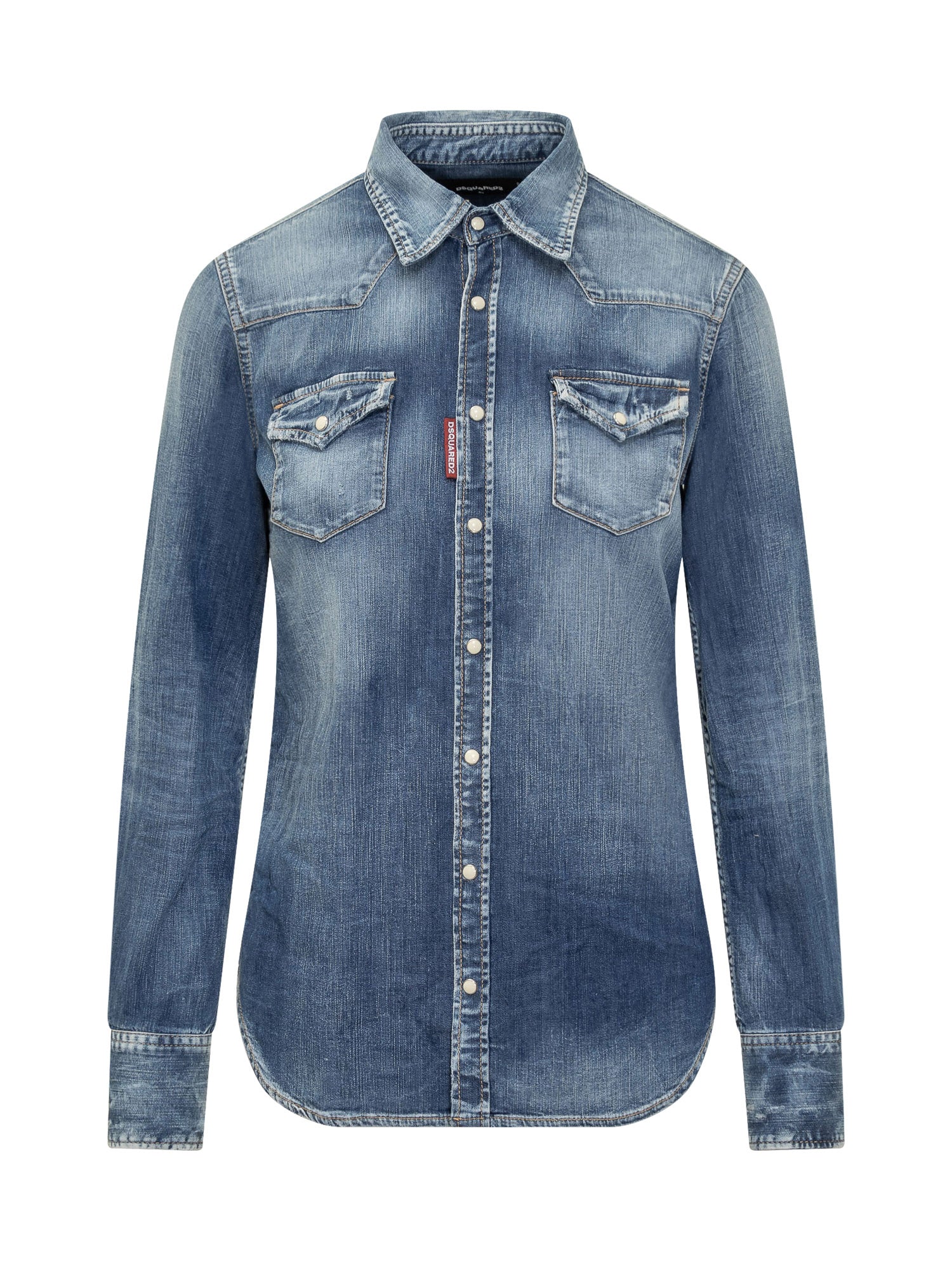 Faded denim shirt by Dsquared2 with snap buttons, flap pockets and iconic red logo tag.