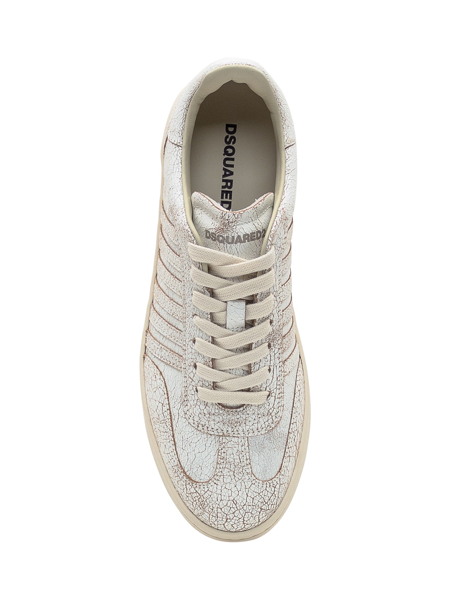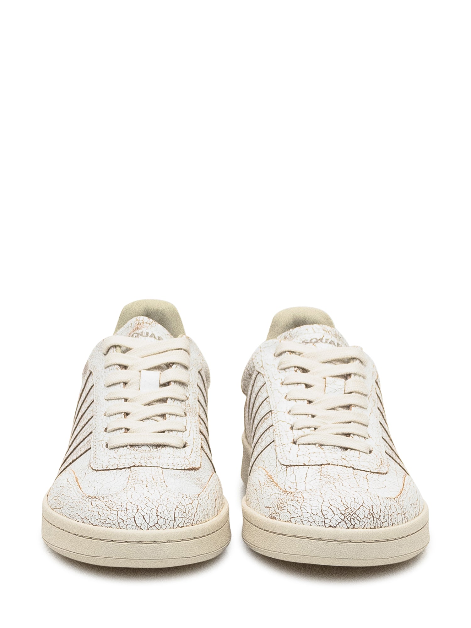 White leather sneaker. Front closure with laces. Logo on the heel. Side striped detail. Embroidery pattern. Tongue with printed logo. Blunt toe. Sole with logo. Flat rubber sole. Logo on the sole.