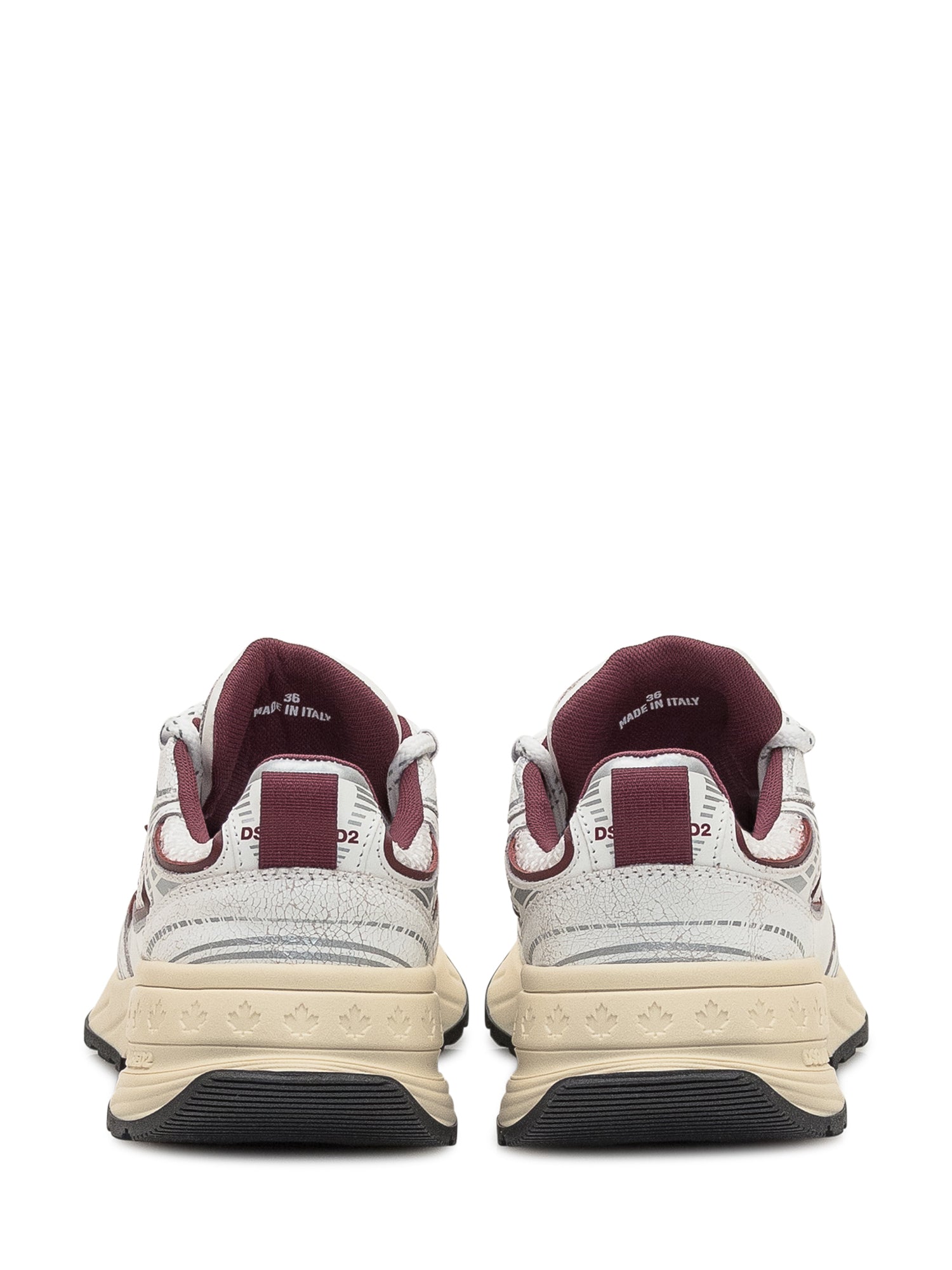 Dsquared2 sneakers in leather and mesh with burgundy details and iconic maple leaf. Chunky sole with logo and leaf pattern, lace-up closure.
