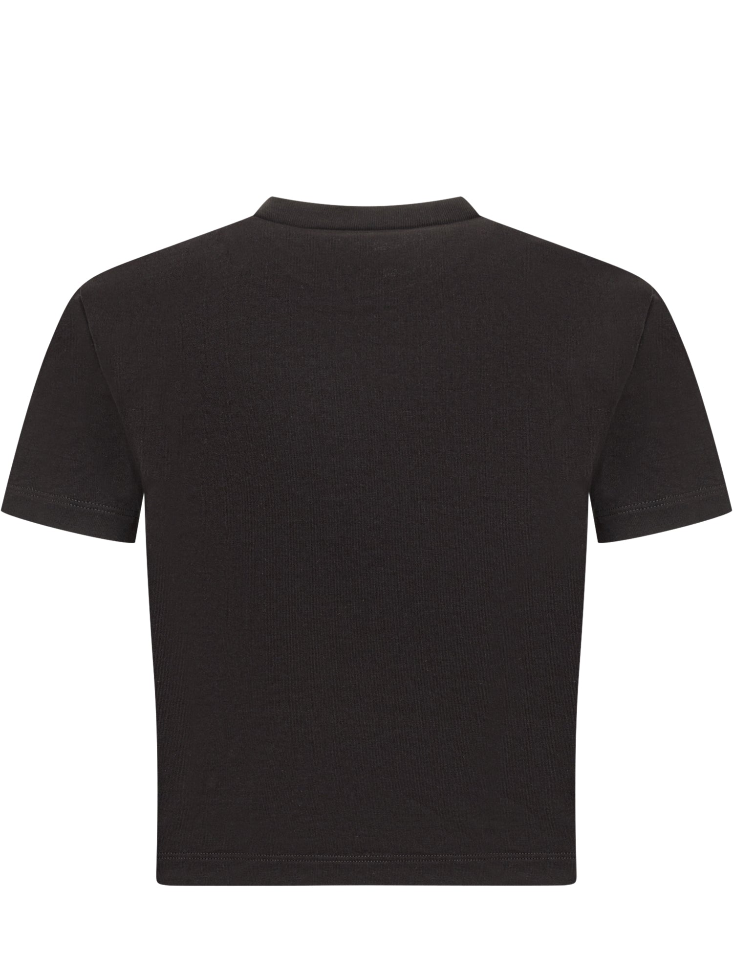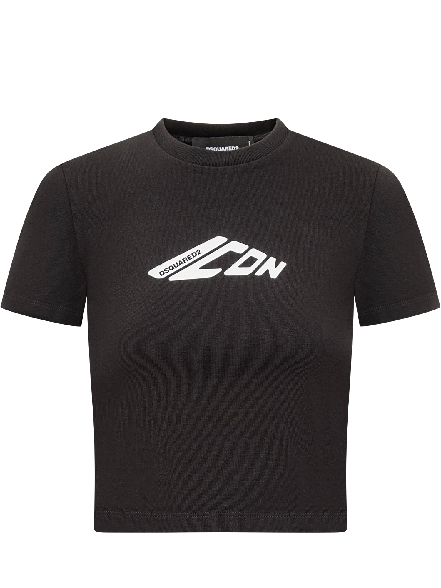 Dsquared2 Mini Fit Tee for women in stretch black cotton with logo print on the chest. Fitted silhouette and cropped cut.