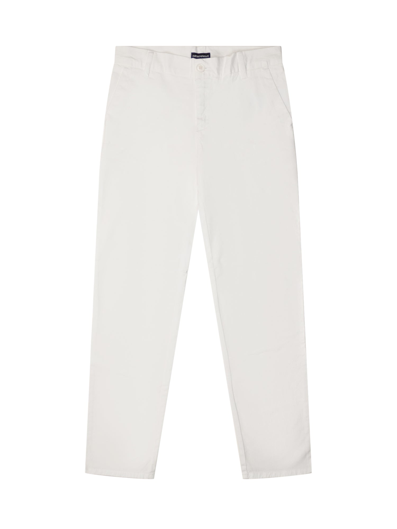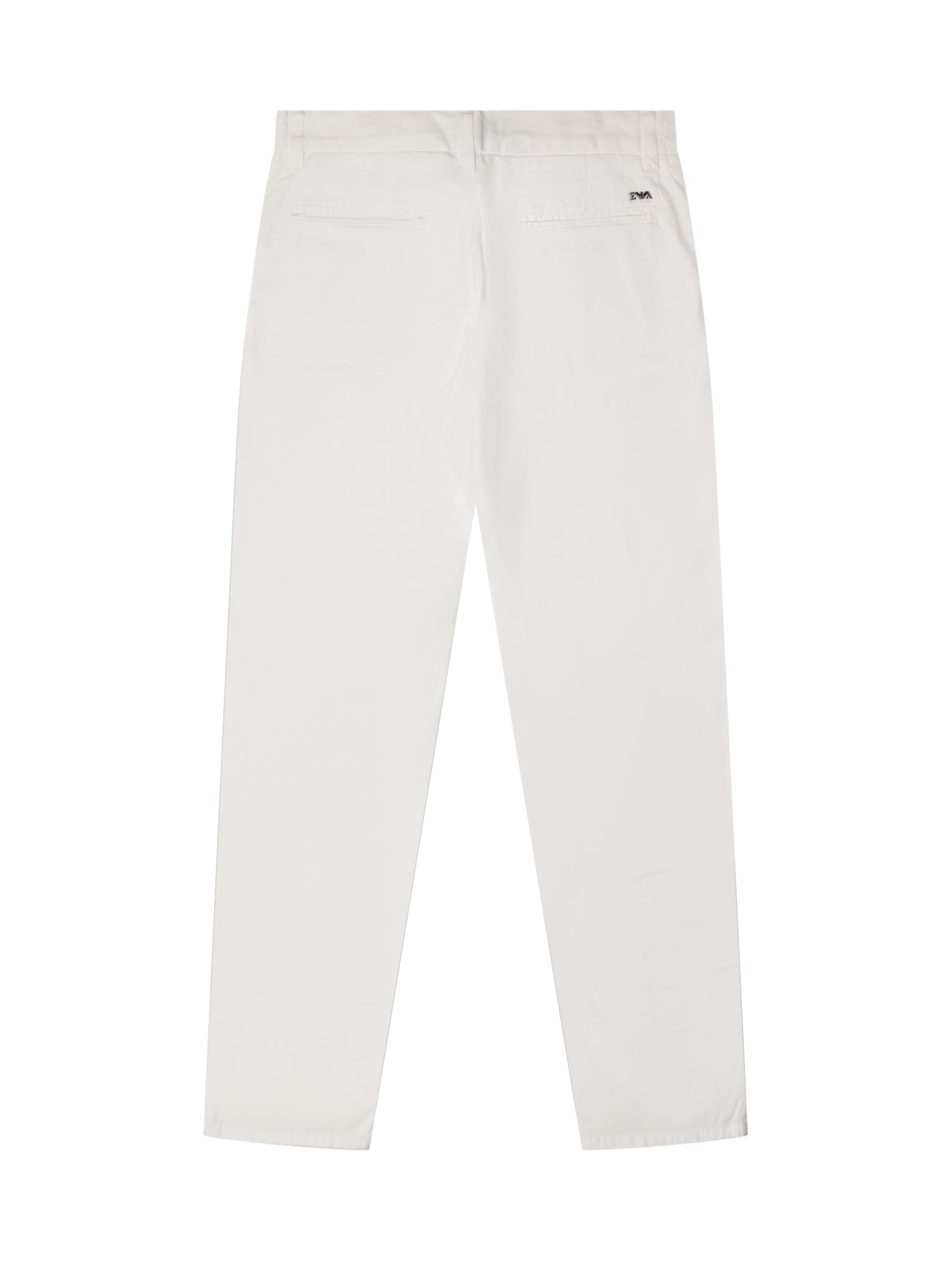 White straight fit pants. Belt loops. Zipper and button closure. Two front pockets and two back pockets. Logo on the back.