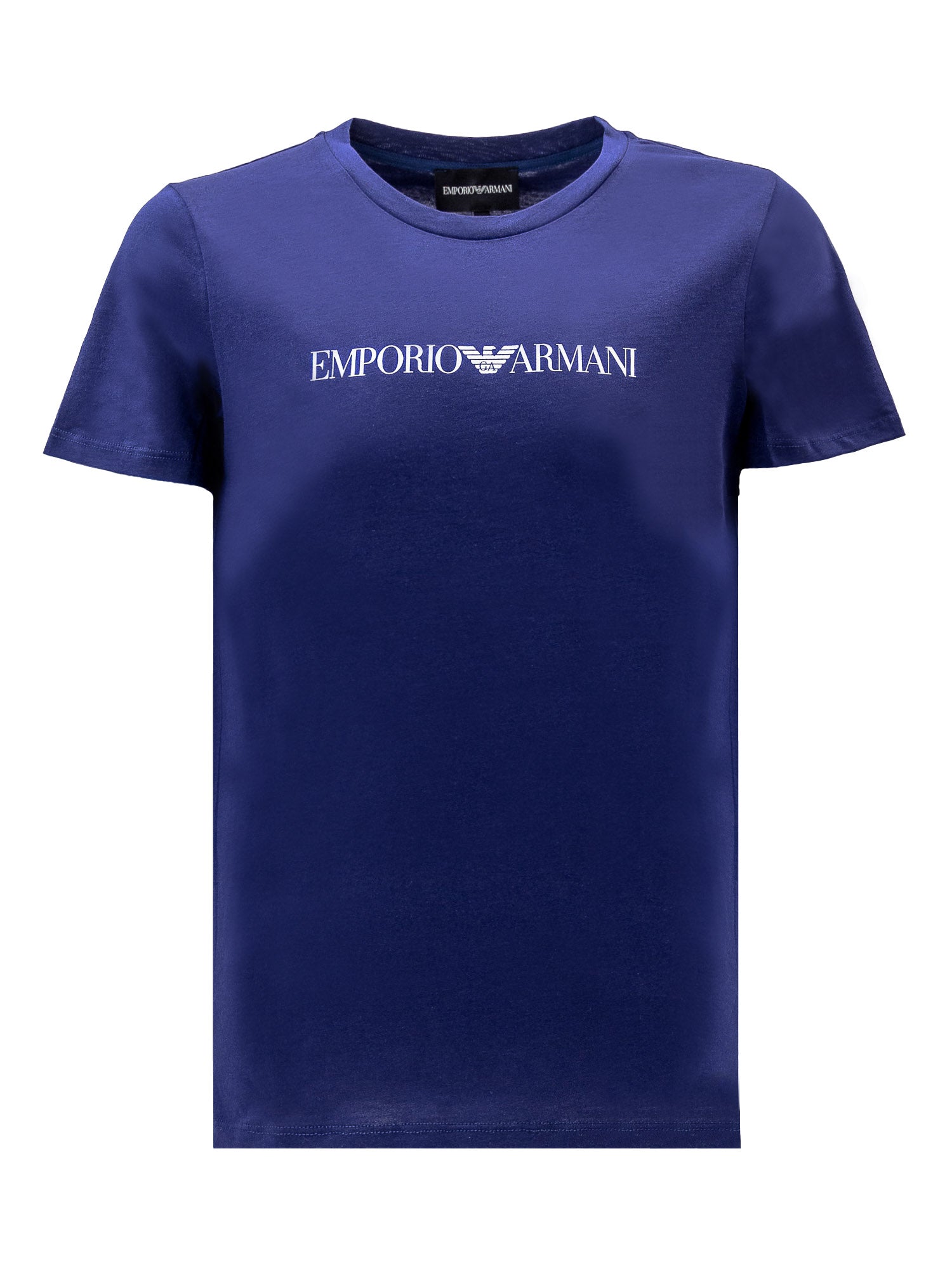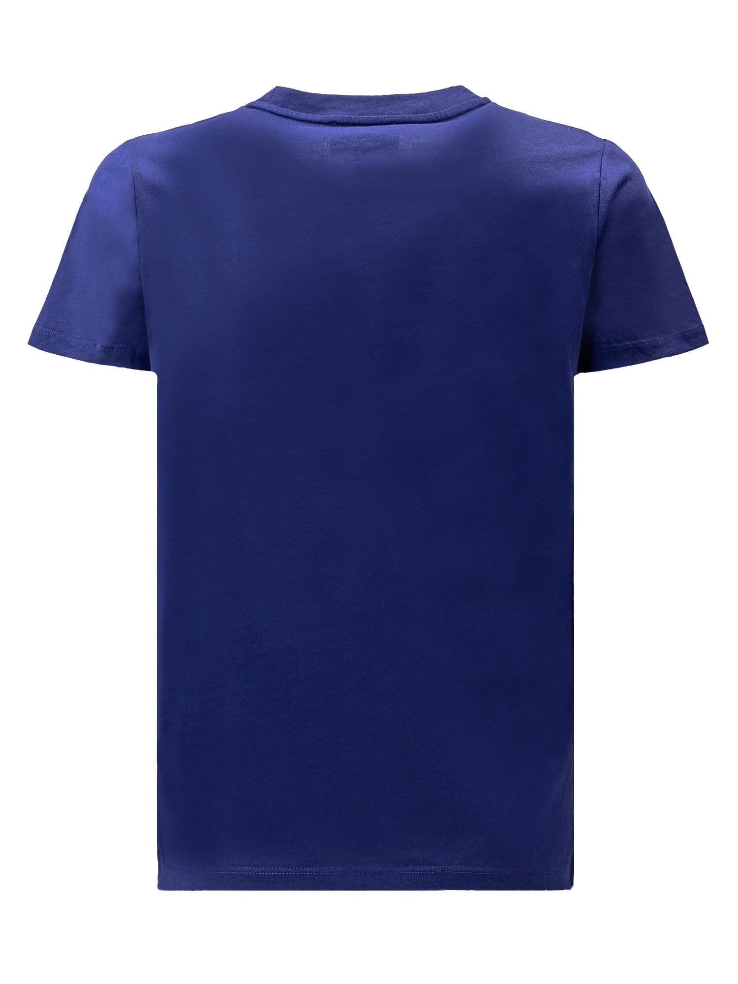 Blue T-shirt with short sleeves. Crew neck. Ribbed collar. Logo printed on front.