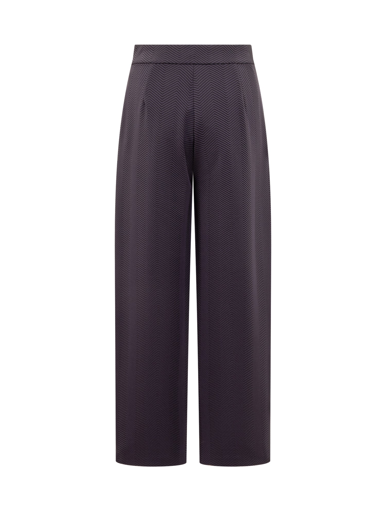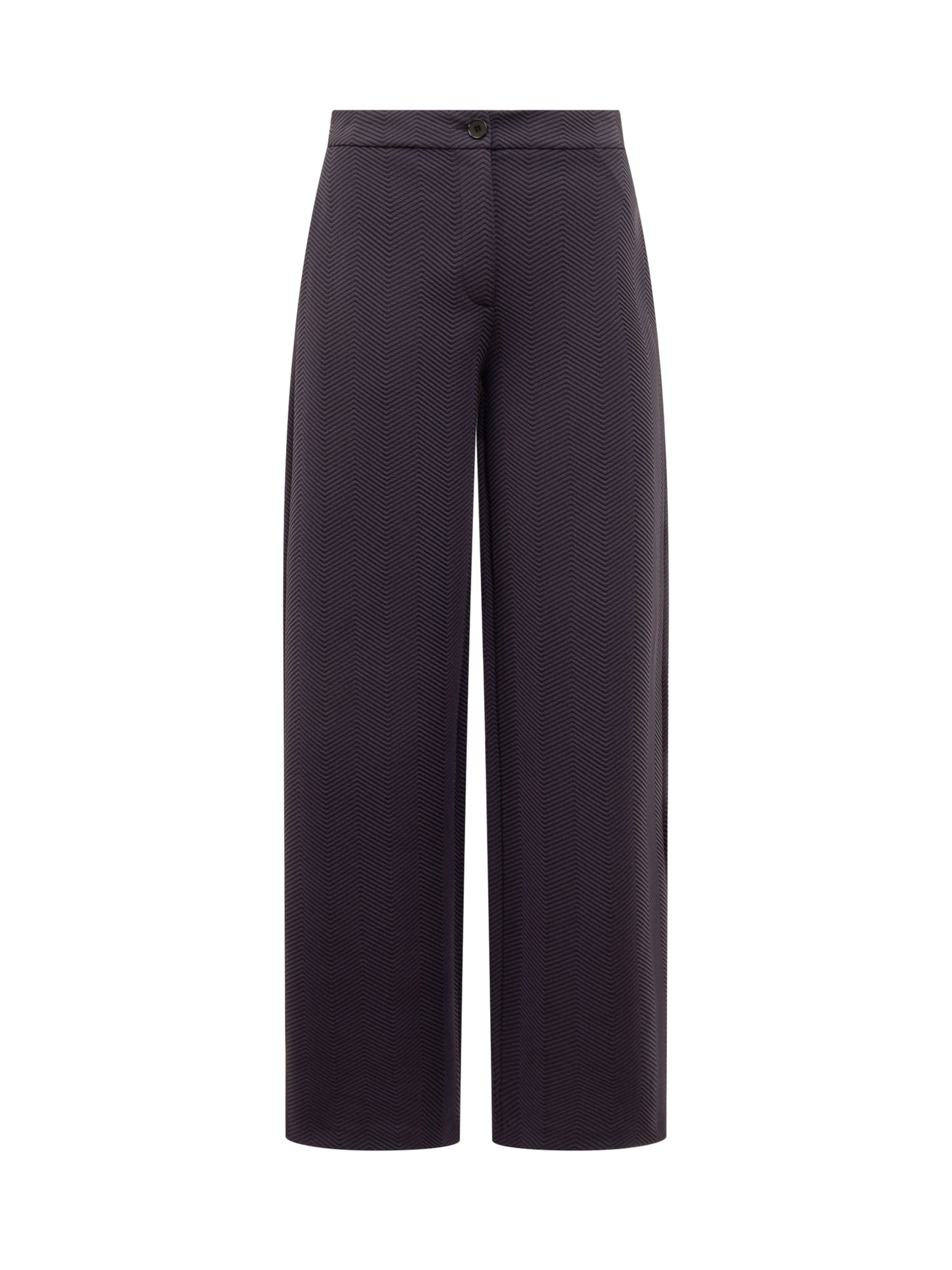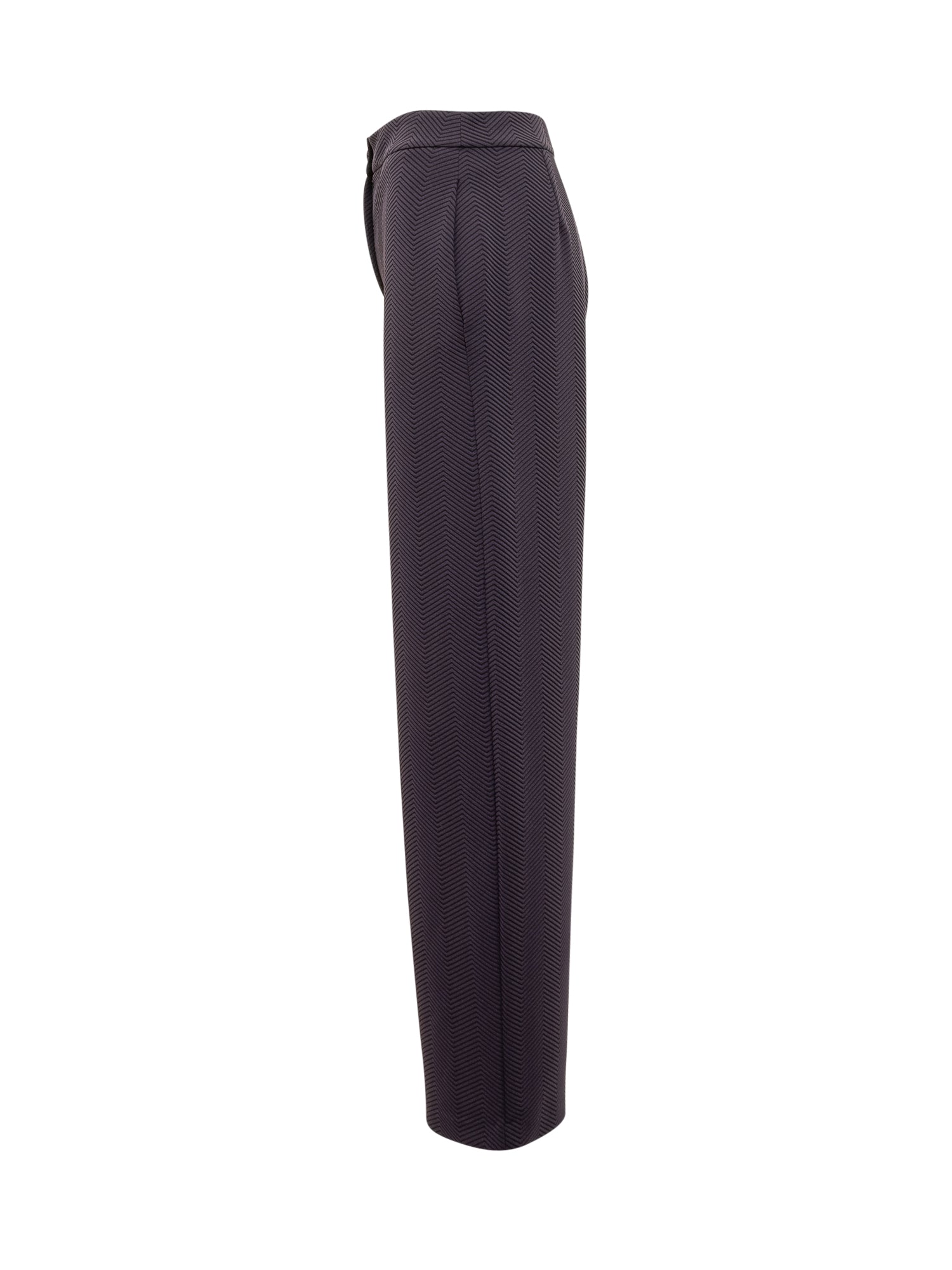 Pants with slightly oval leg. Made of knitted-effect stretch jersey fabric. Button and zipper closure. Two slanted pockets on the sides. All-over embossed chevron pattern.