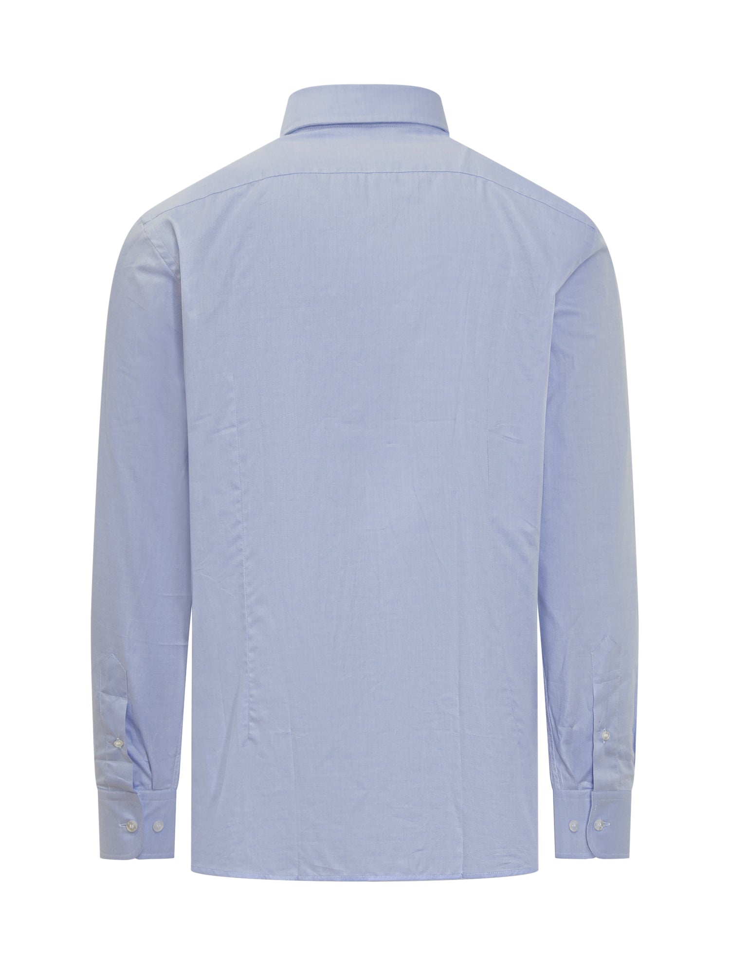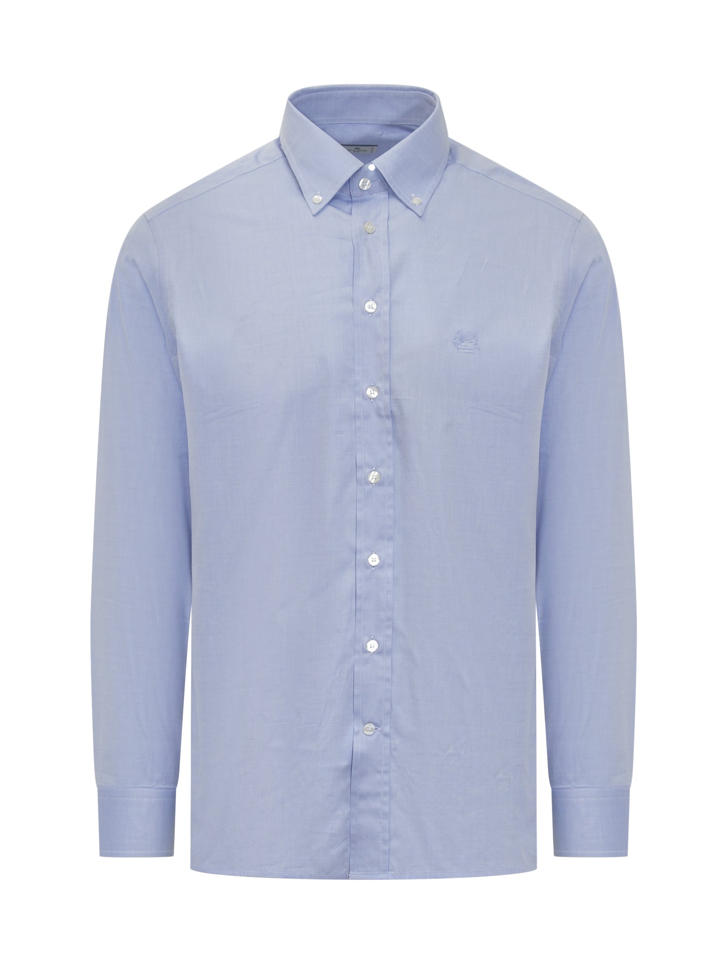 Light blue shirt. Button fastening. Logo embroidery on chest. Cuffs with buttons.