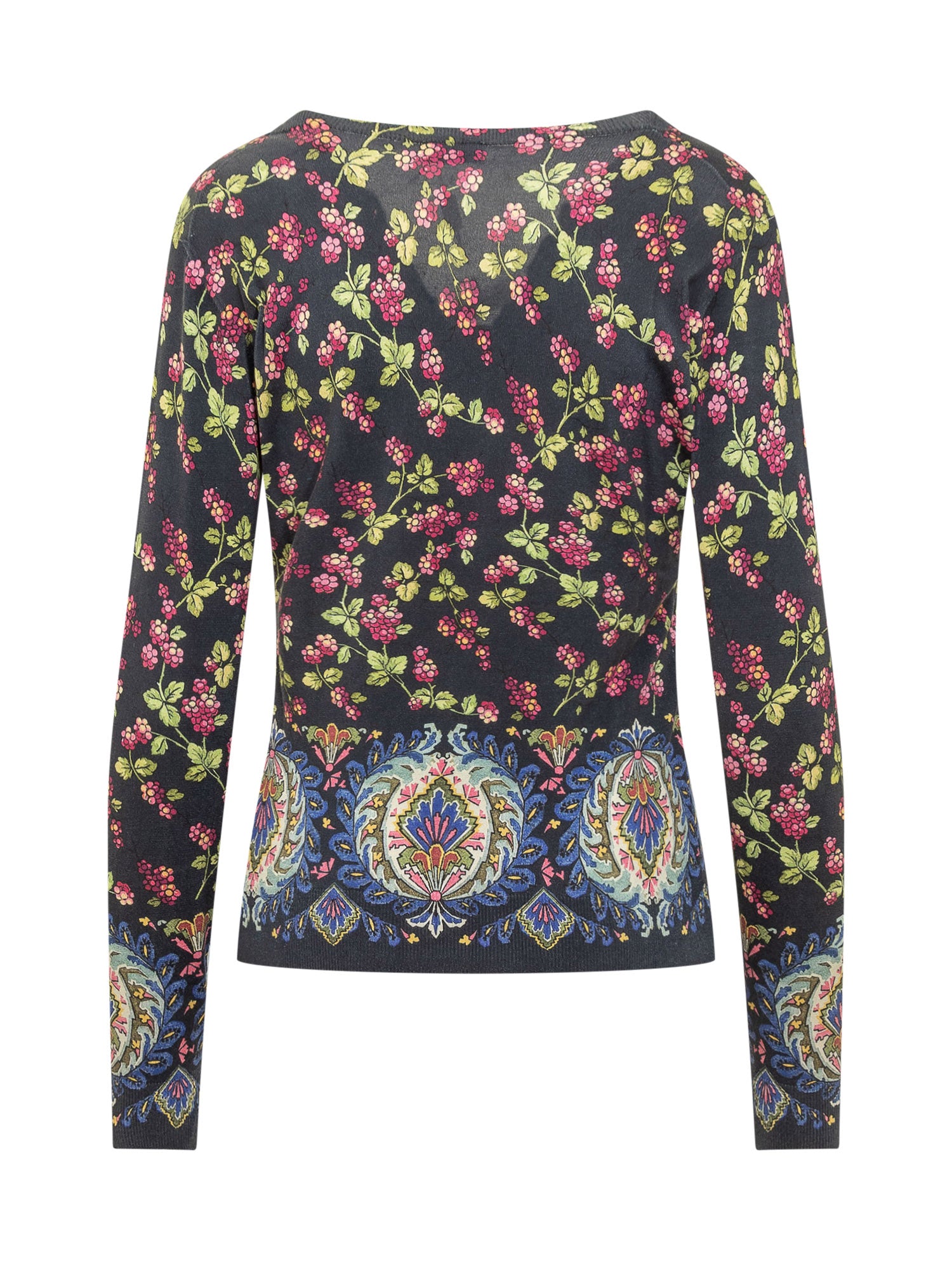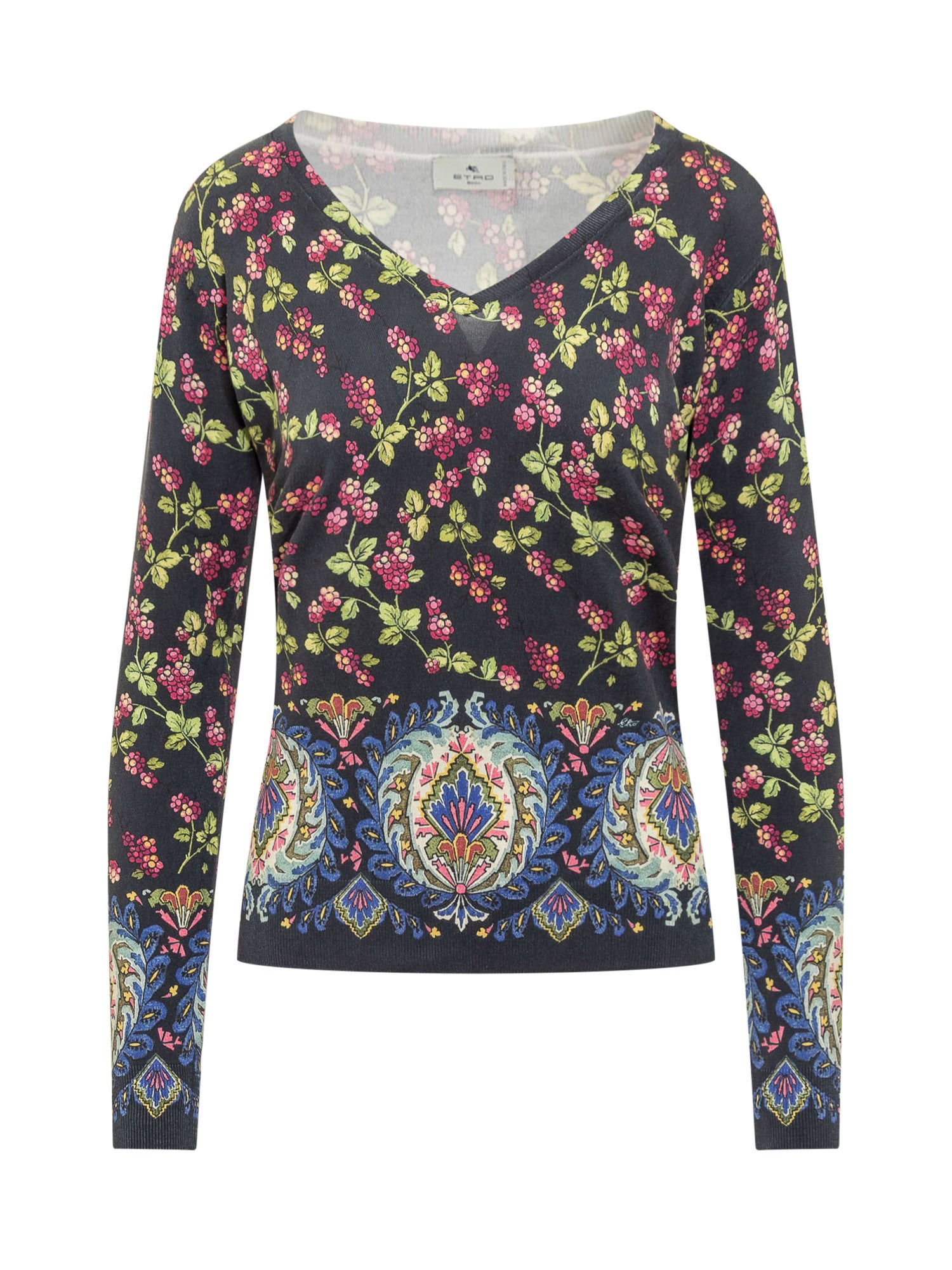 Silk-blend sweater with long sleeves. V-neckline. Berries print and ornamental Paisley background.