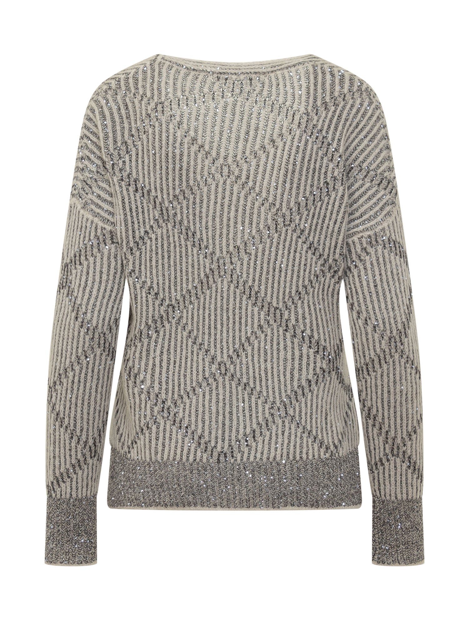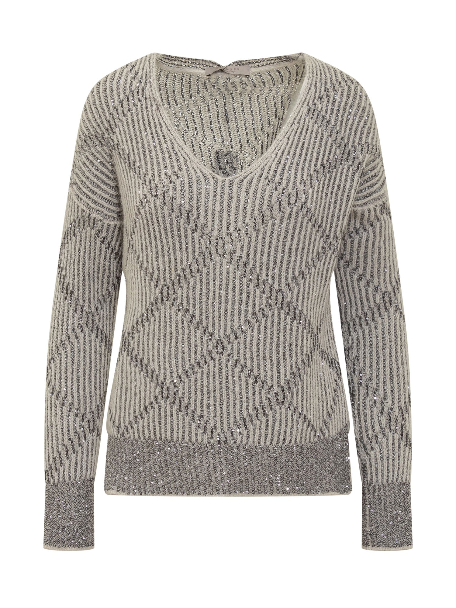 Exterior sweater featuring a striped geometric pattern with lurex details. Its shimmering design and soft fit.