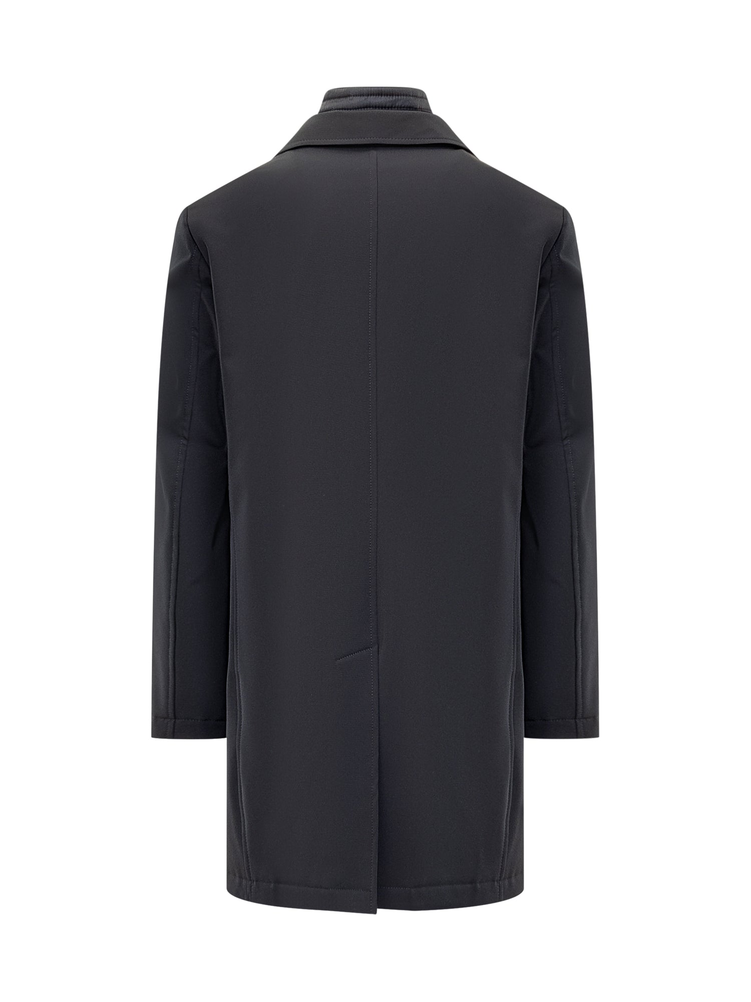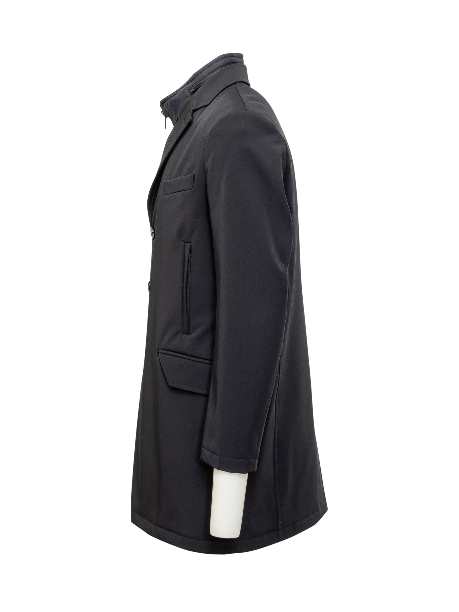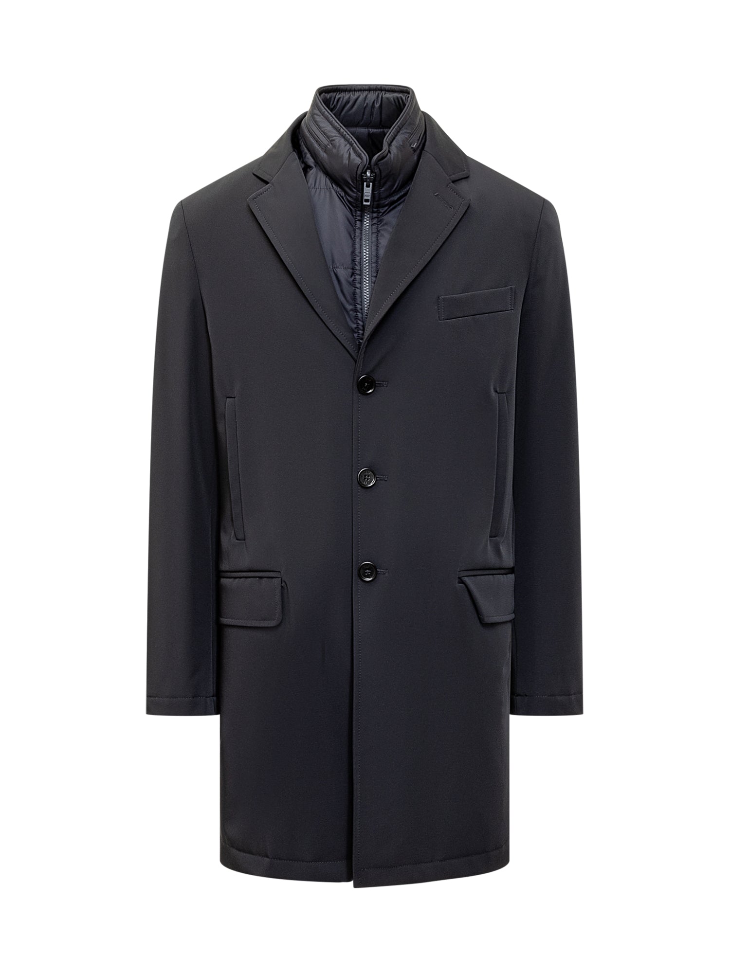Blue coat with vest. Five pockets. Closure with buttons and zip.