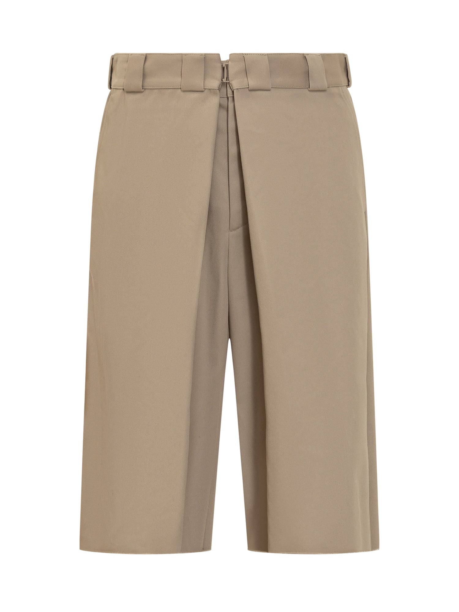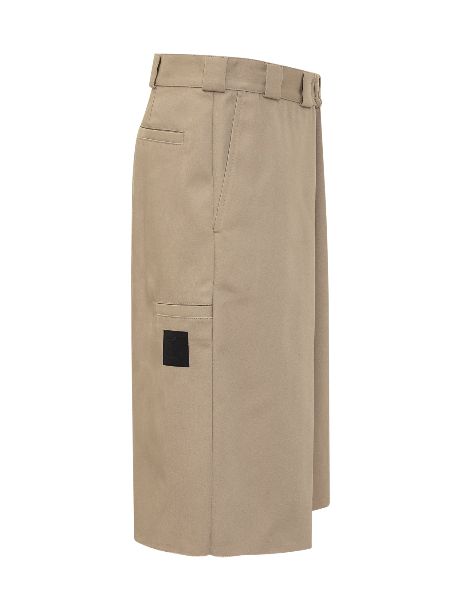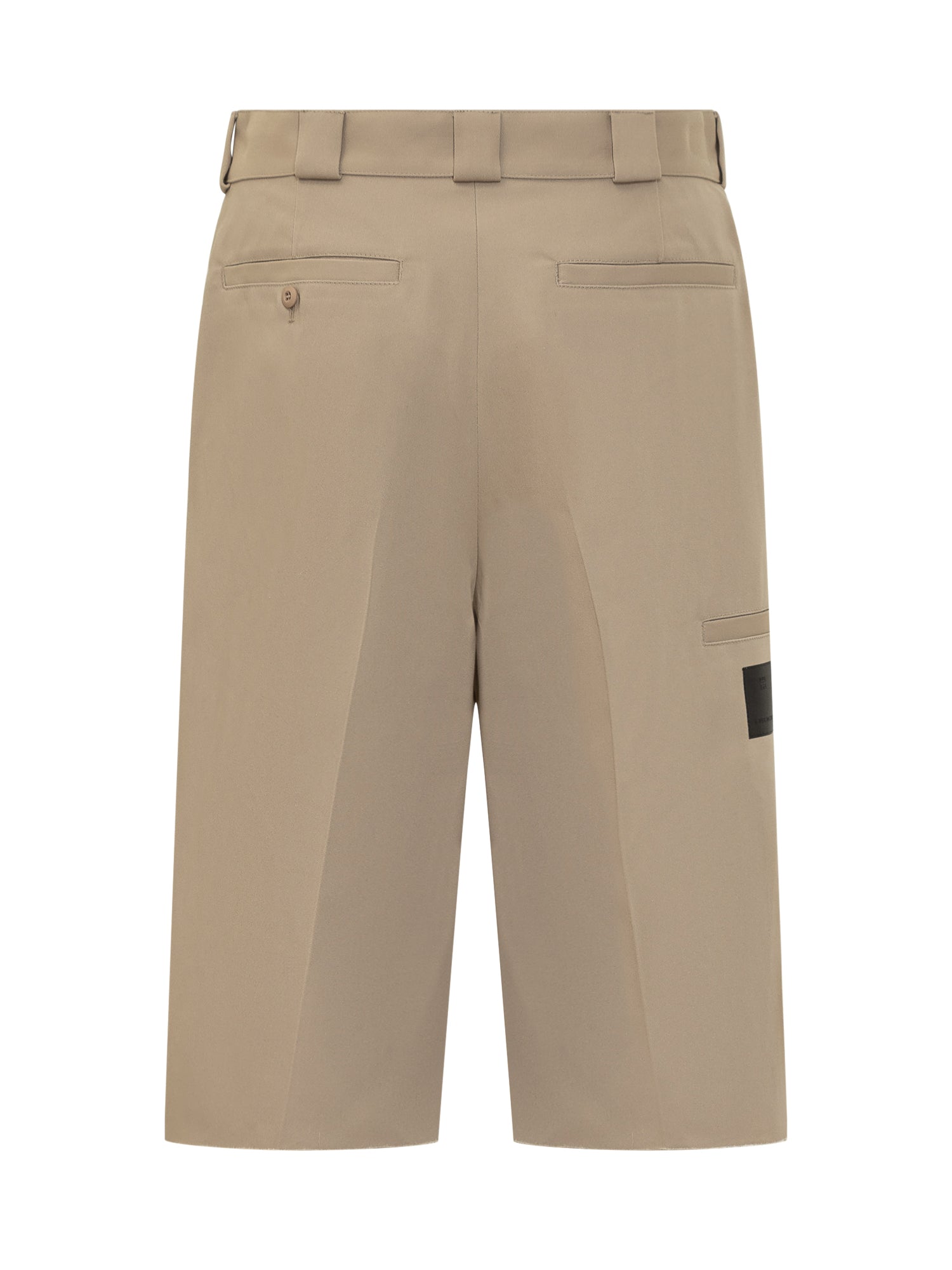 Long canvas chino bermuda shorts. Zipper, button and double hook-and-eye closure. Belt loops. Overlap system to adjust size. Two slant pockets on front. Two welt pockets on the back. One side welt pocket.