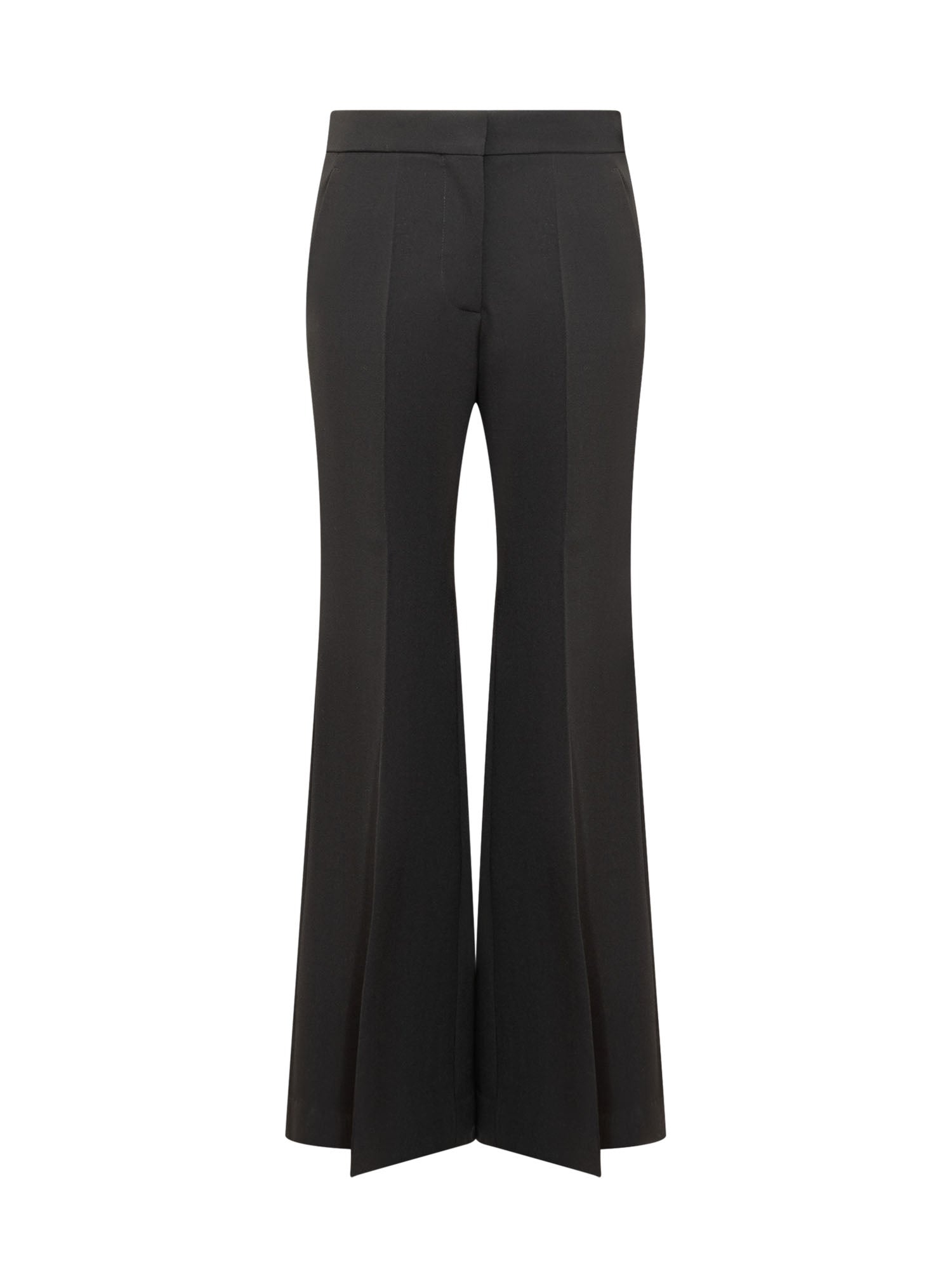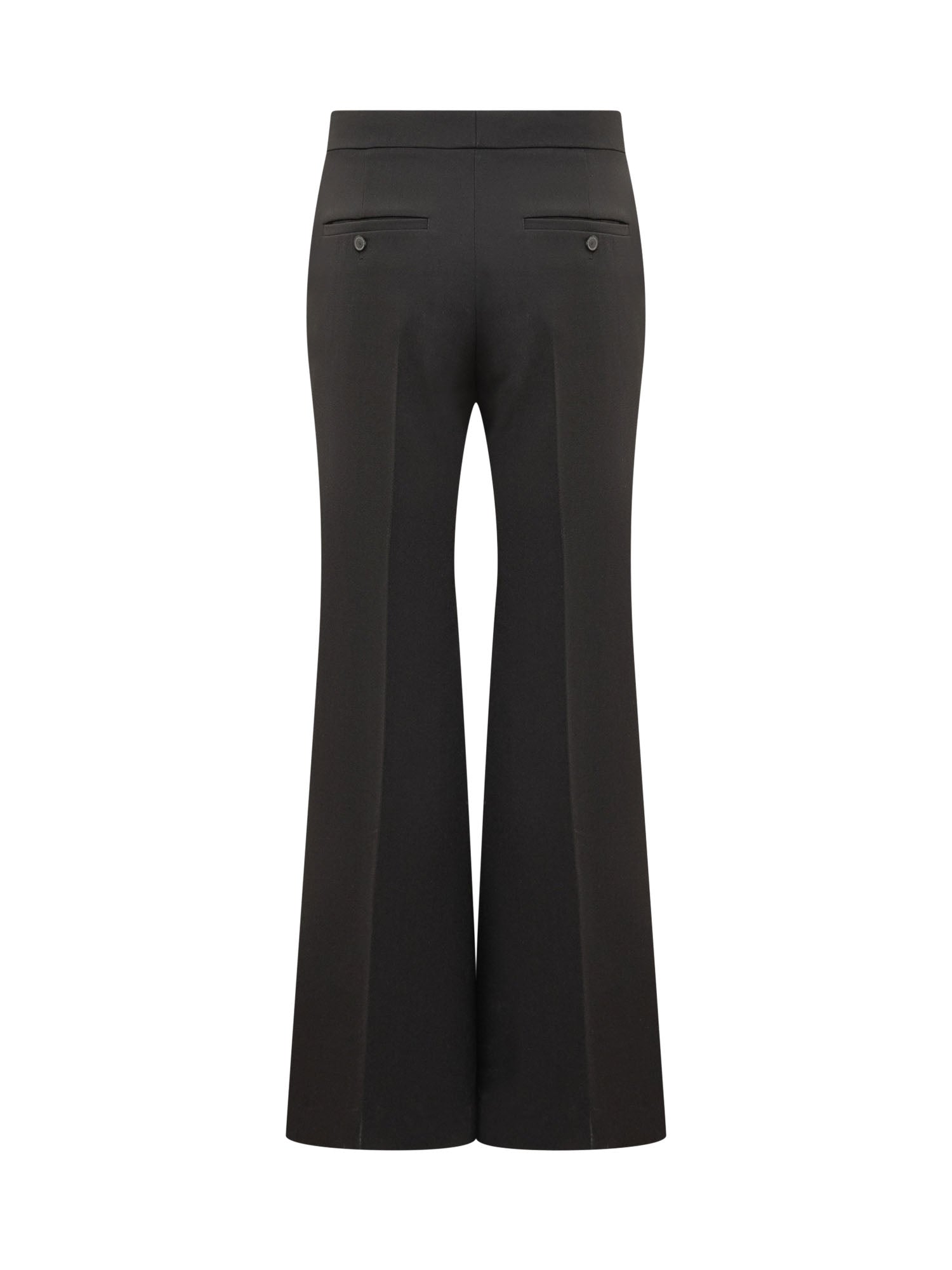 Long black trousers. Flared bottom. Back pockets. Closure with button, hooks and zip.