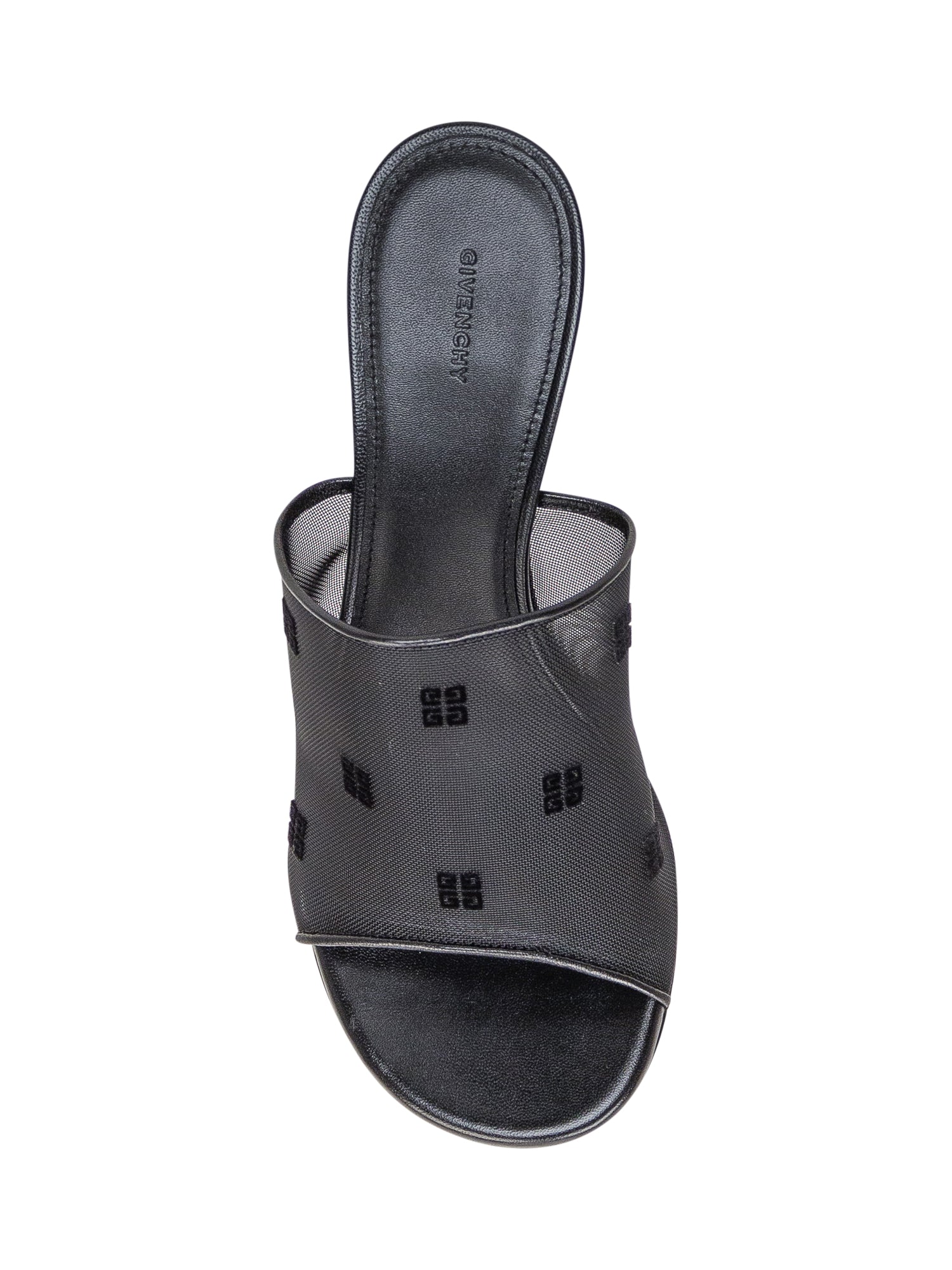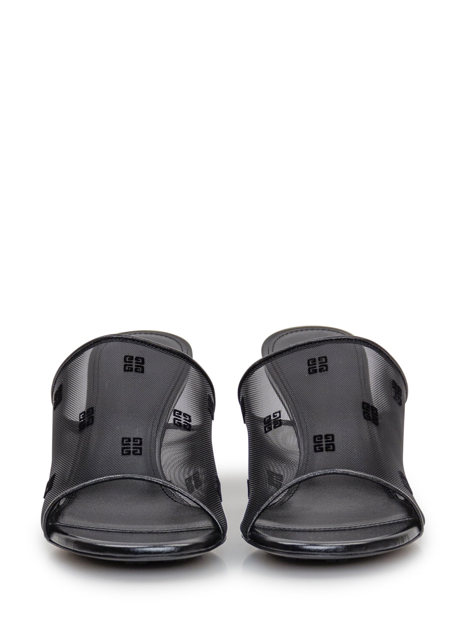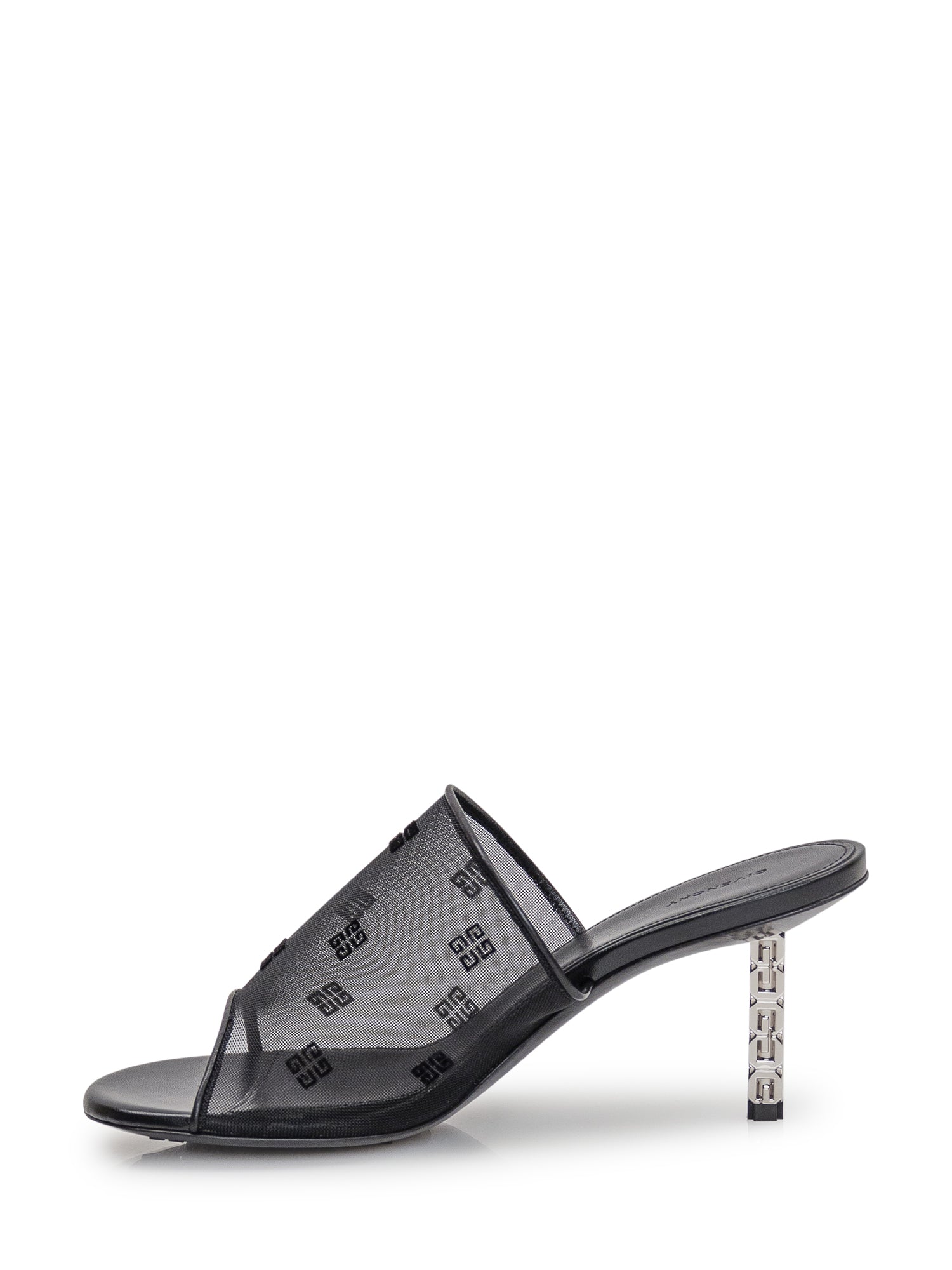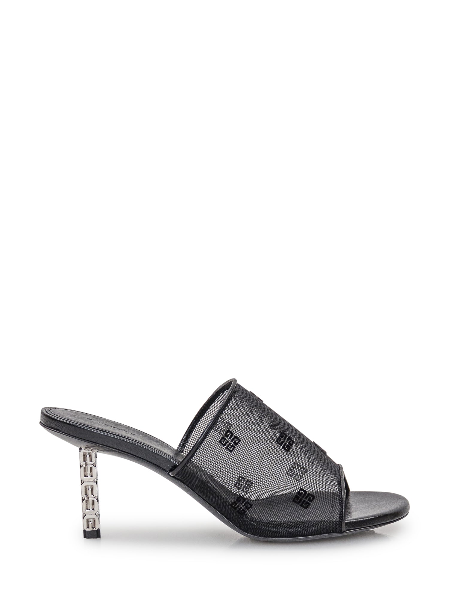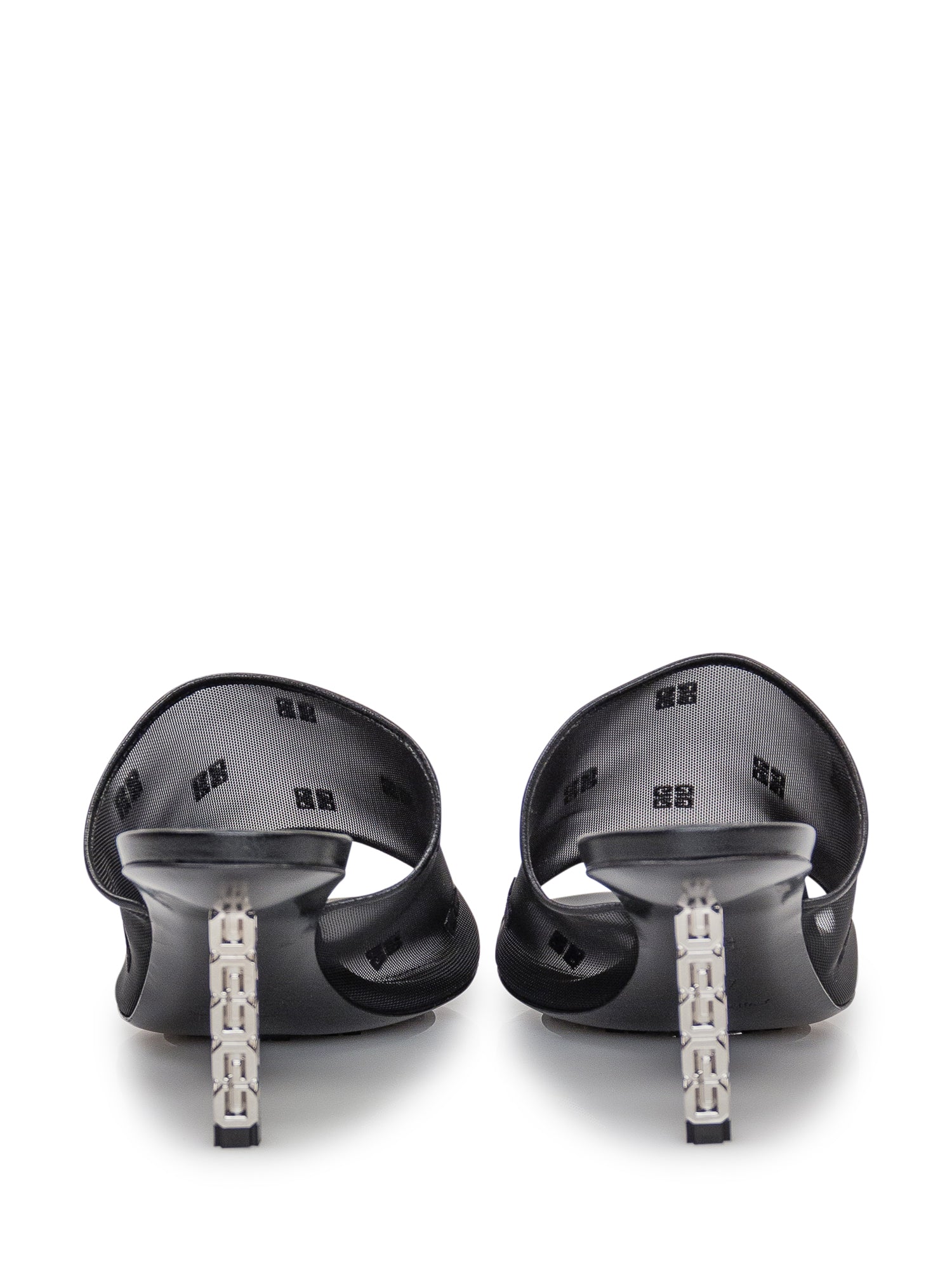 Black mule sandal. G Cube silver heel. 4G mesh band. Logo on the sole.
