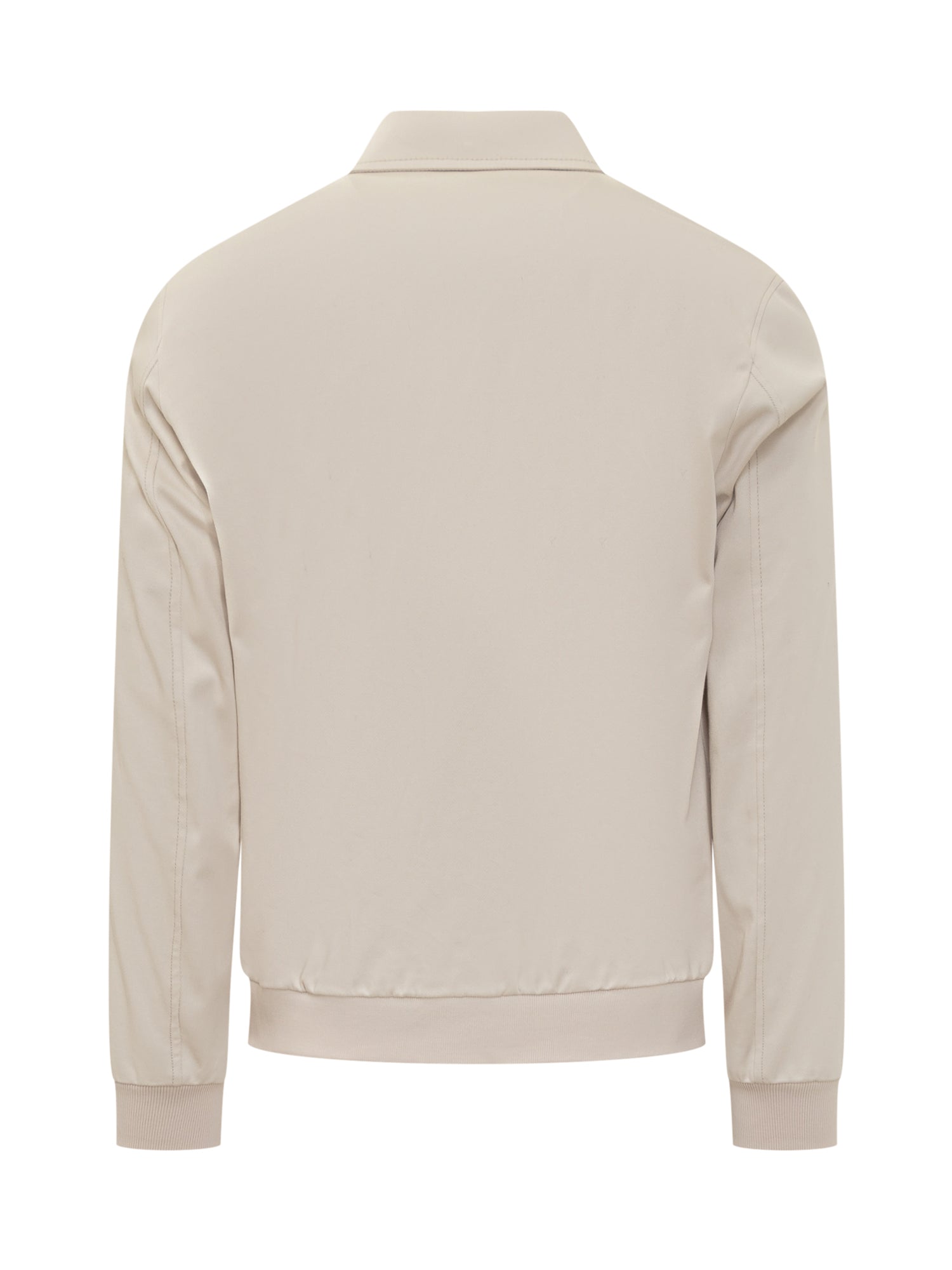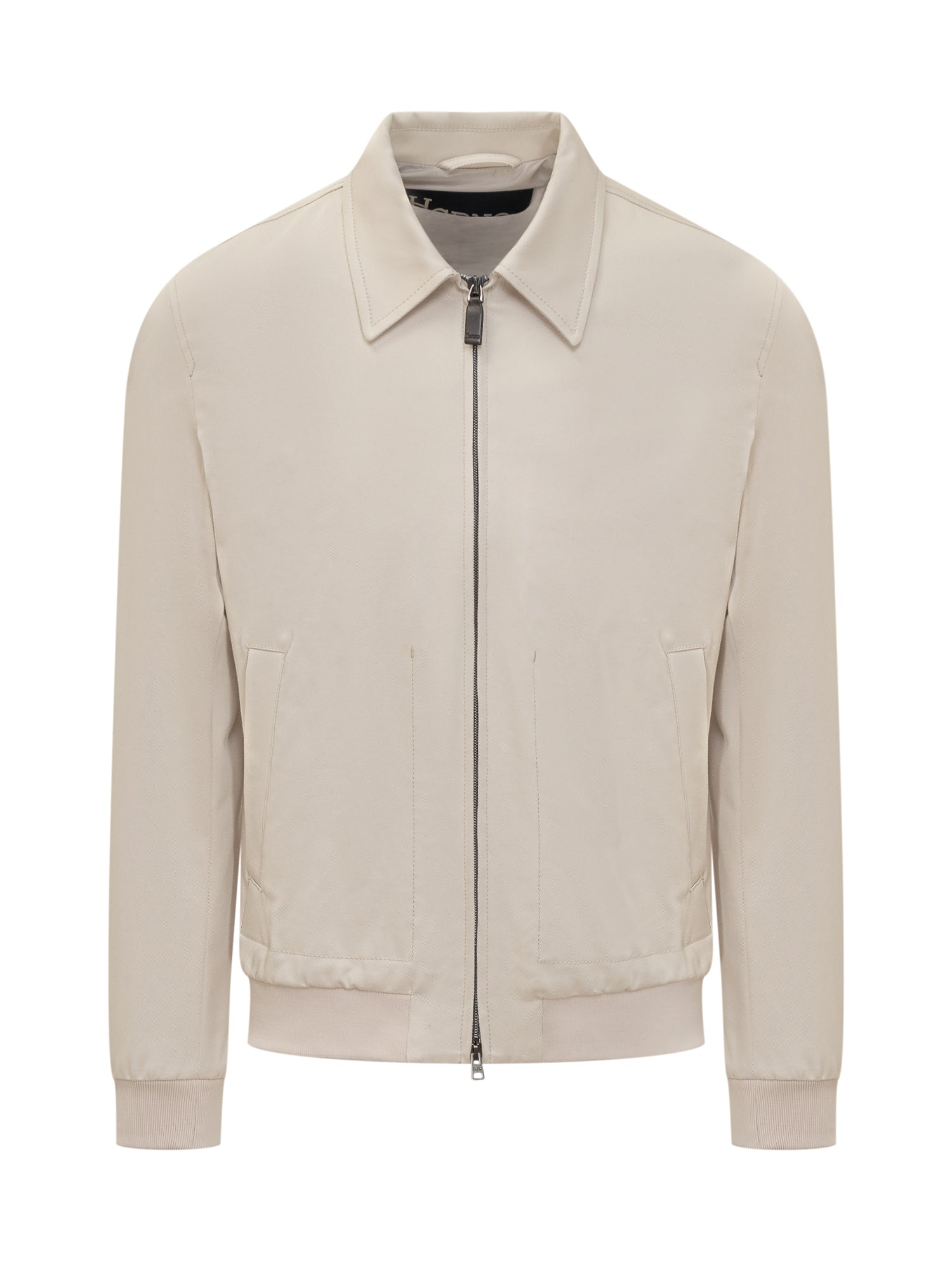 Shirt collar. Zip fastening. Stitched flap pockets. Ribbed knit hem and cuffs.