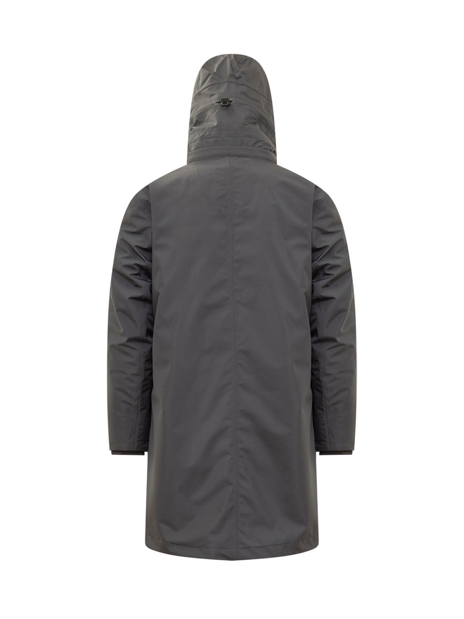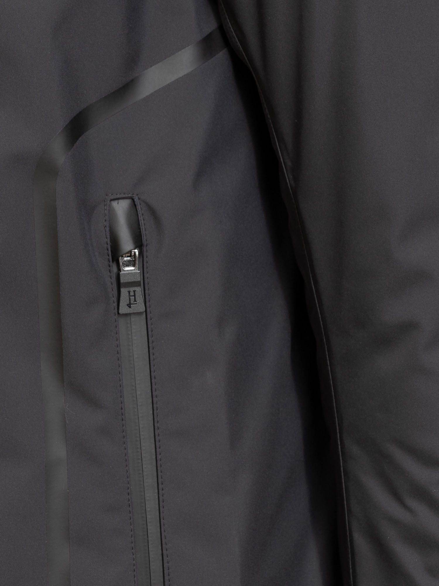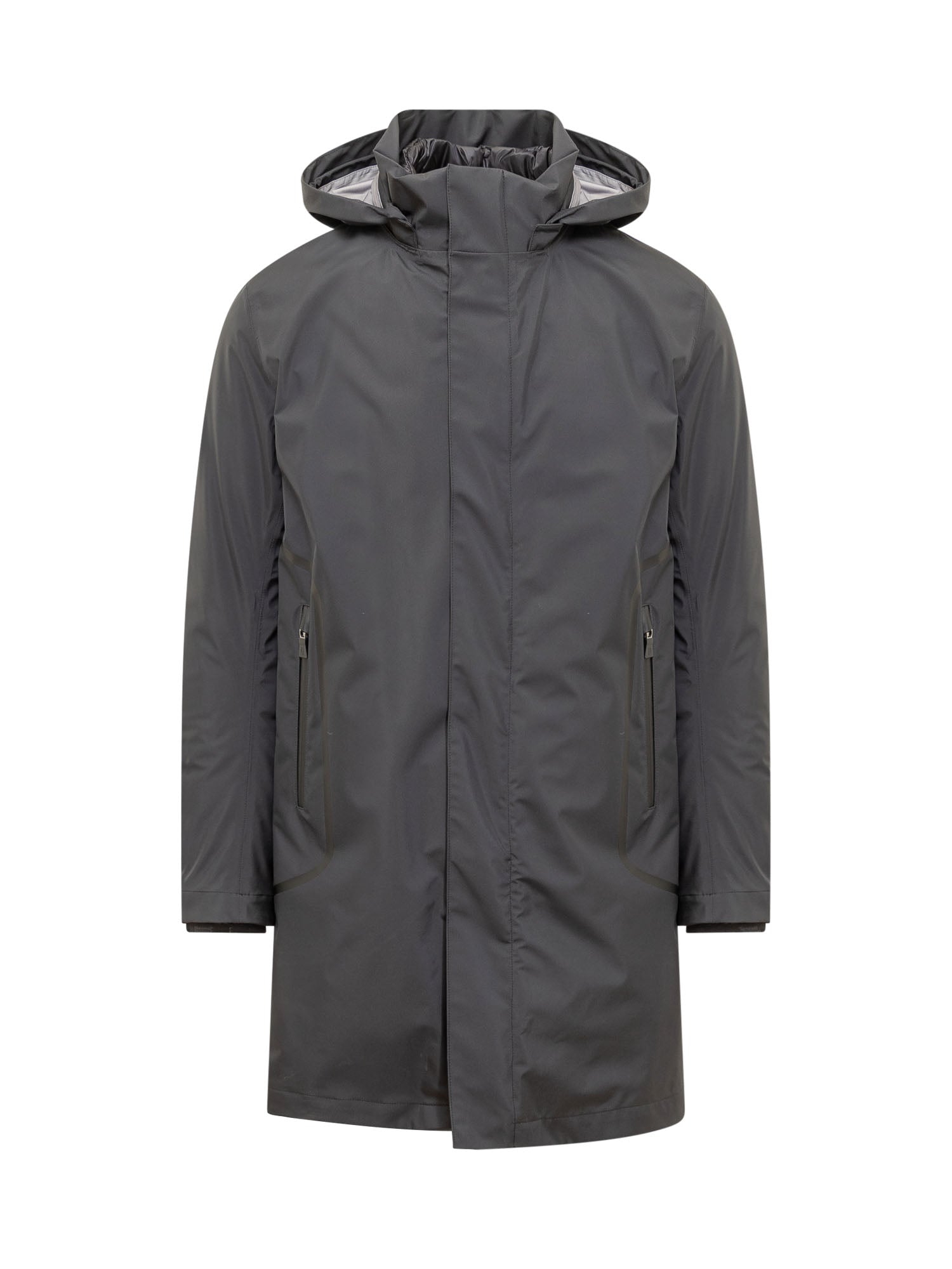 Long-sleeved jacket with hood. High collar. Zipper closure. Two pockets on front. Inside pocket.