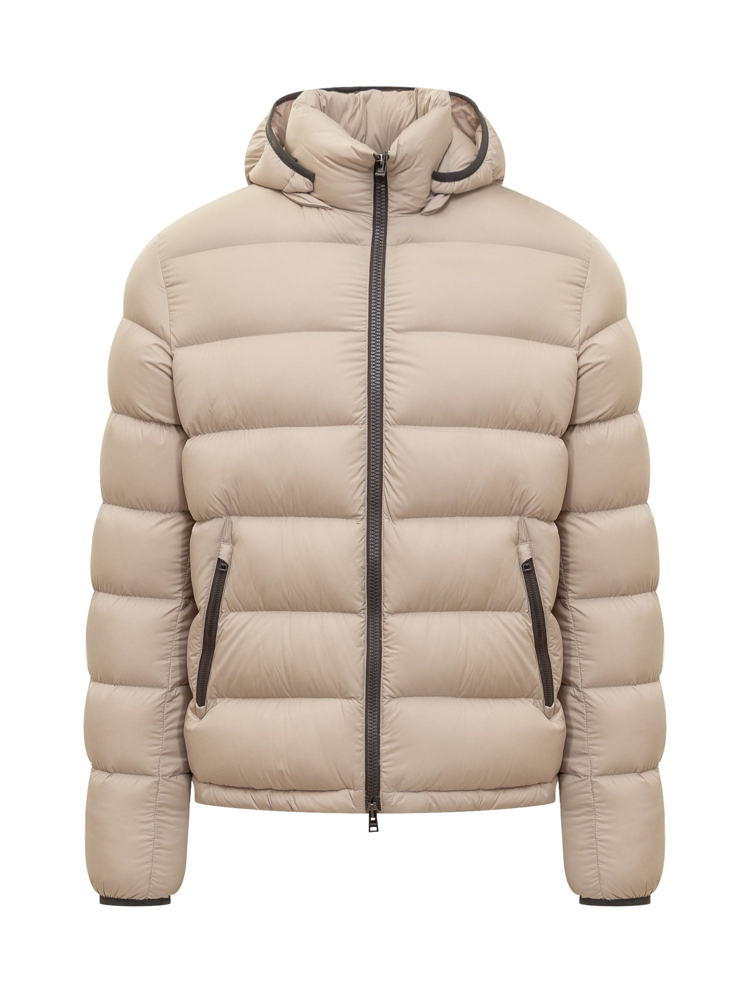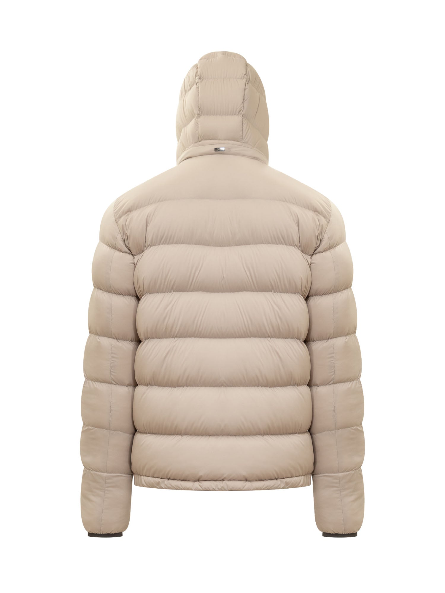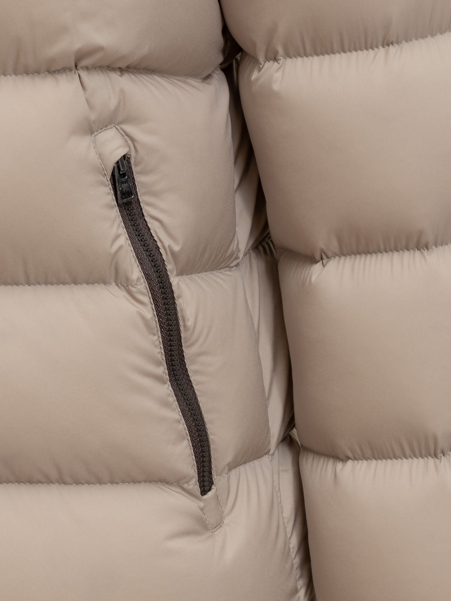 Long-sleeved down jacket with hood. Zipper closure. Elasticized cuffs. Two pockets on front. Inside pocket.