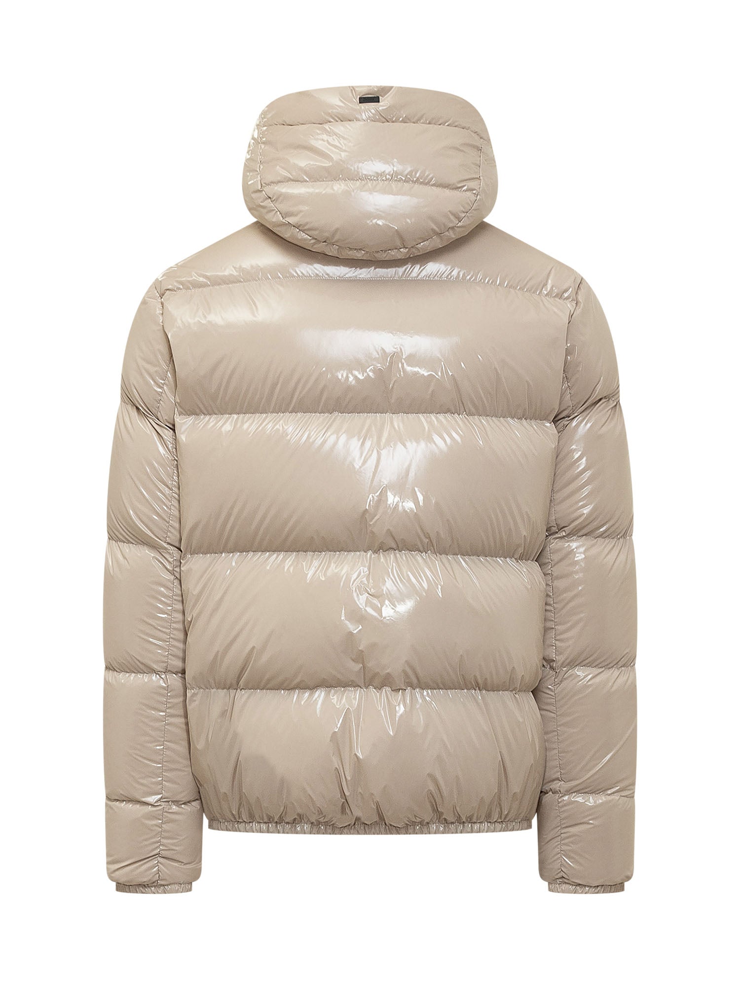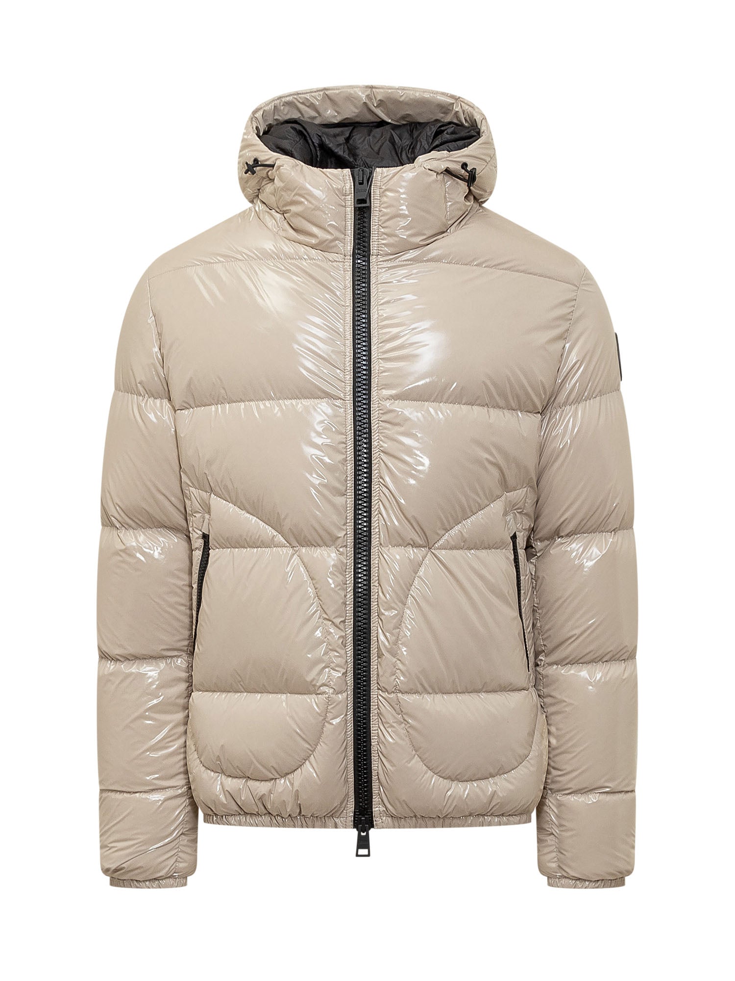 Bomber jacket. Drawstring hood. Zipper closure. Two zippered pockets. Elasticized cuffs and bottom. Two inside pockets.