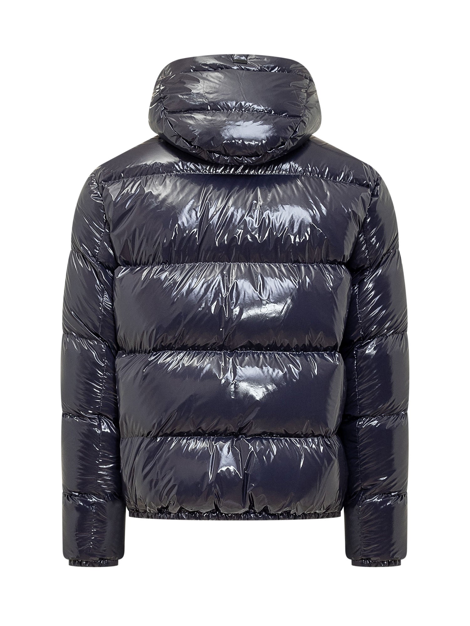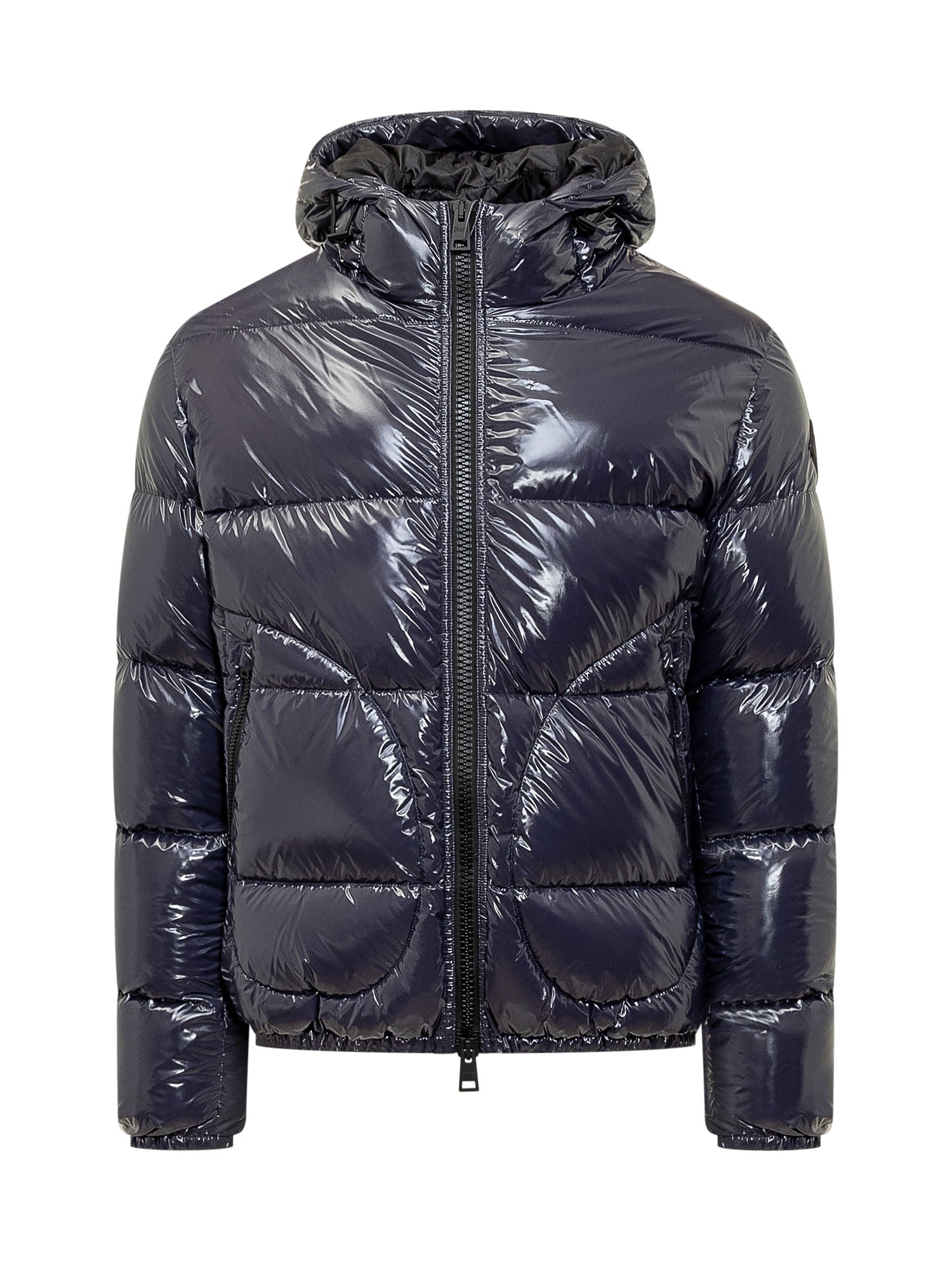 Bomber jacket. Drawstring hood. Zipper closure. Two zippered pockets. Elasticized cuffs and bottom. Two inside pockets.