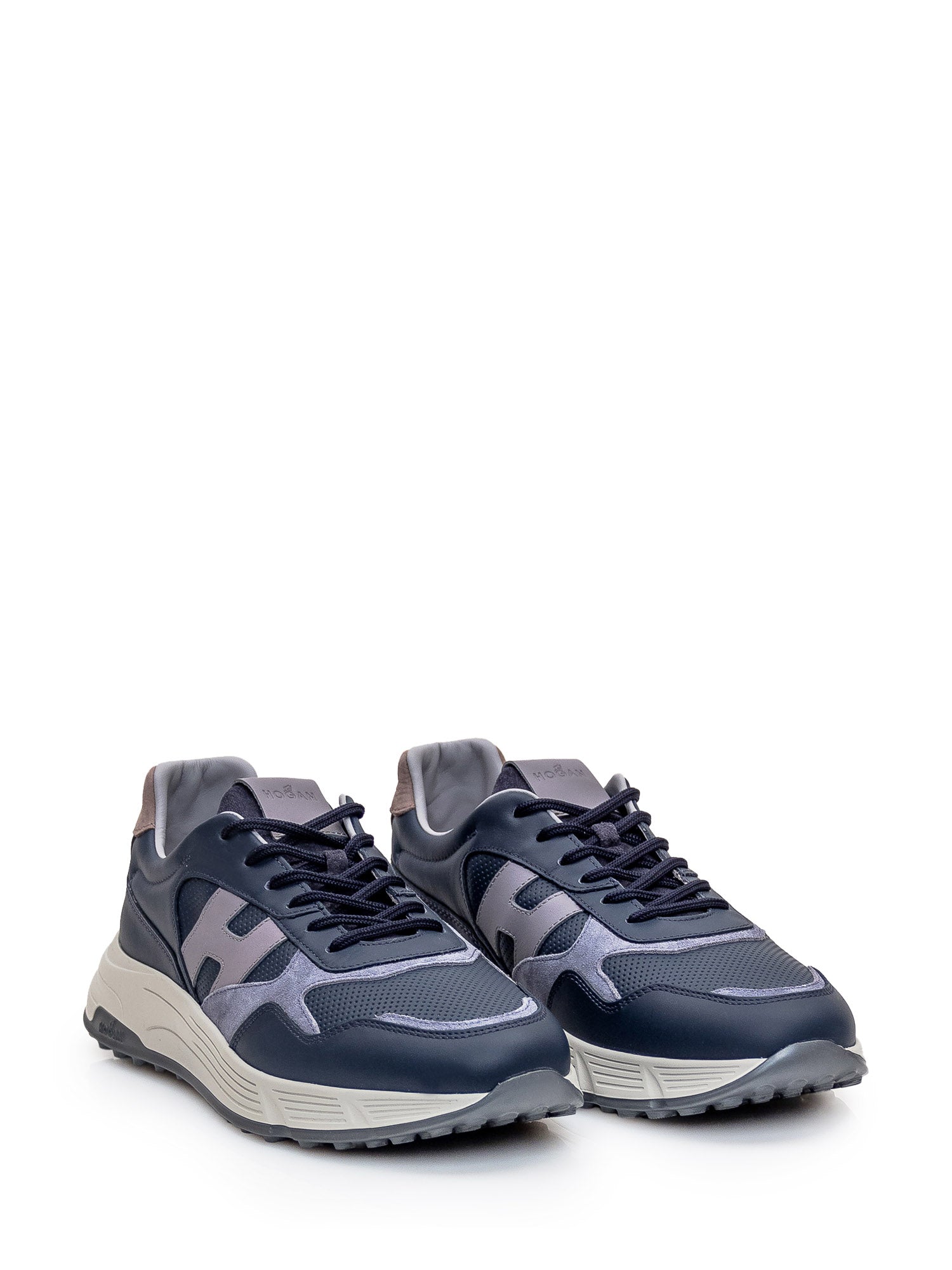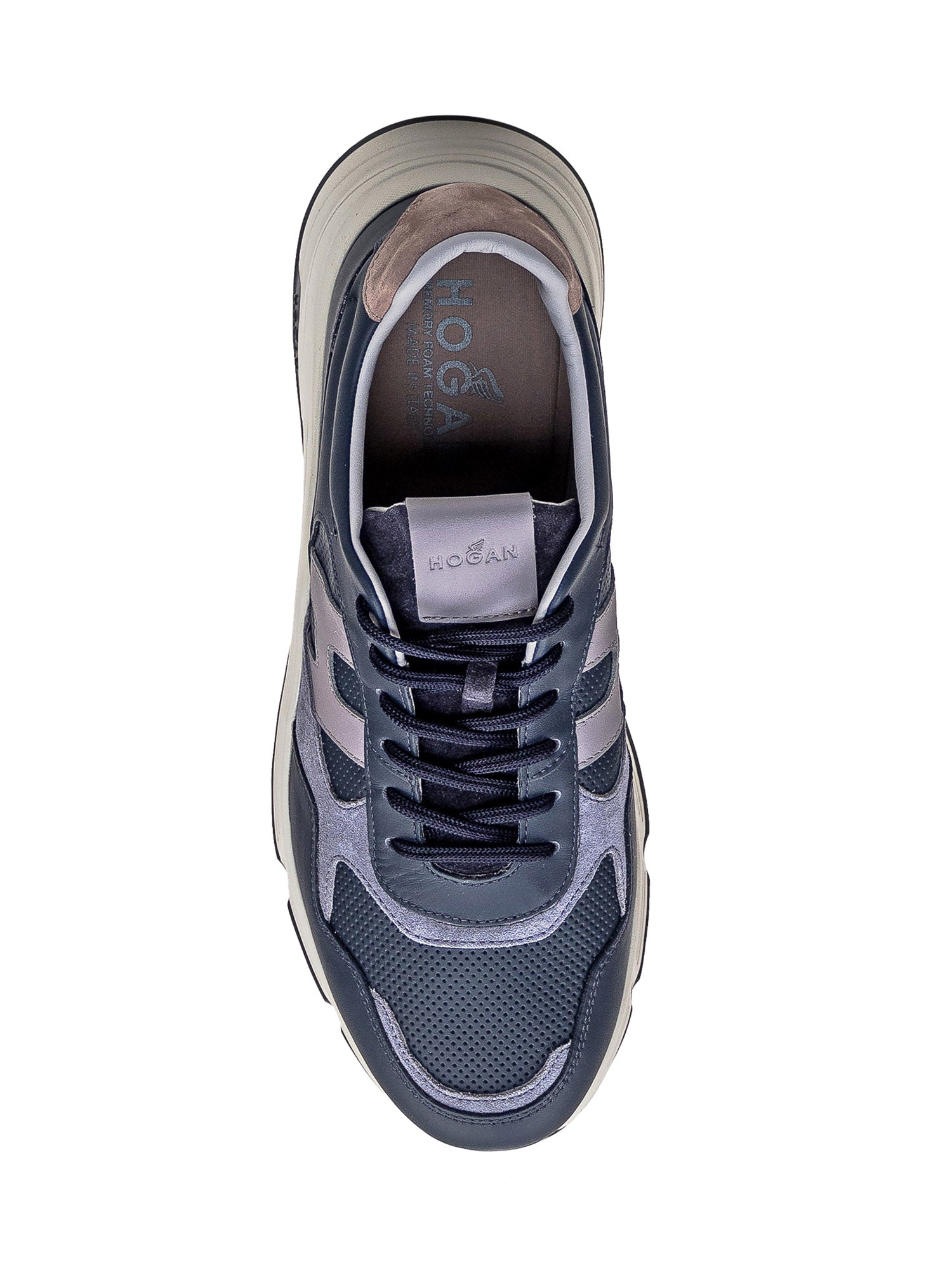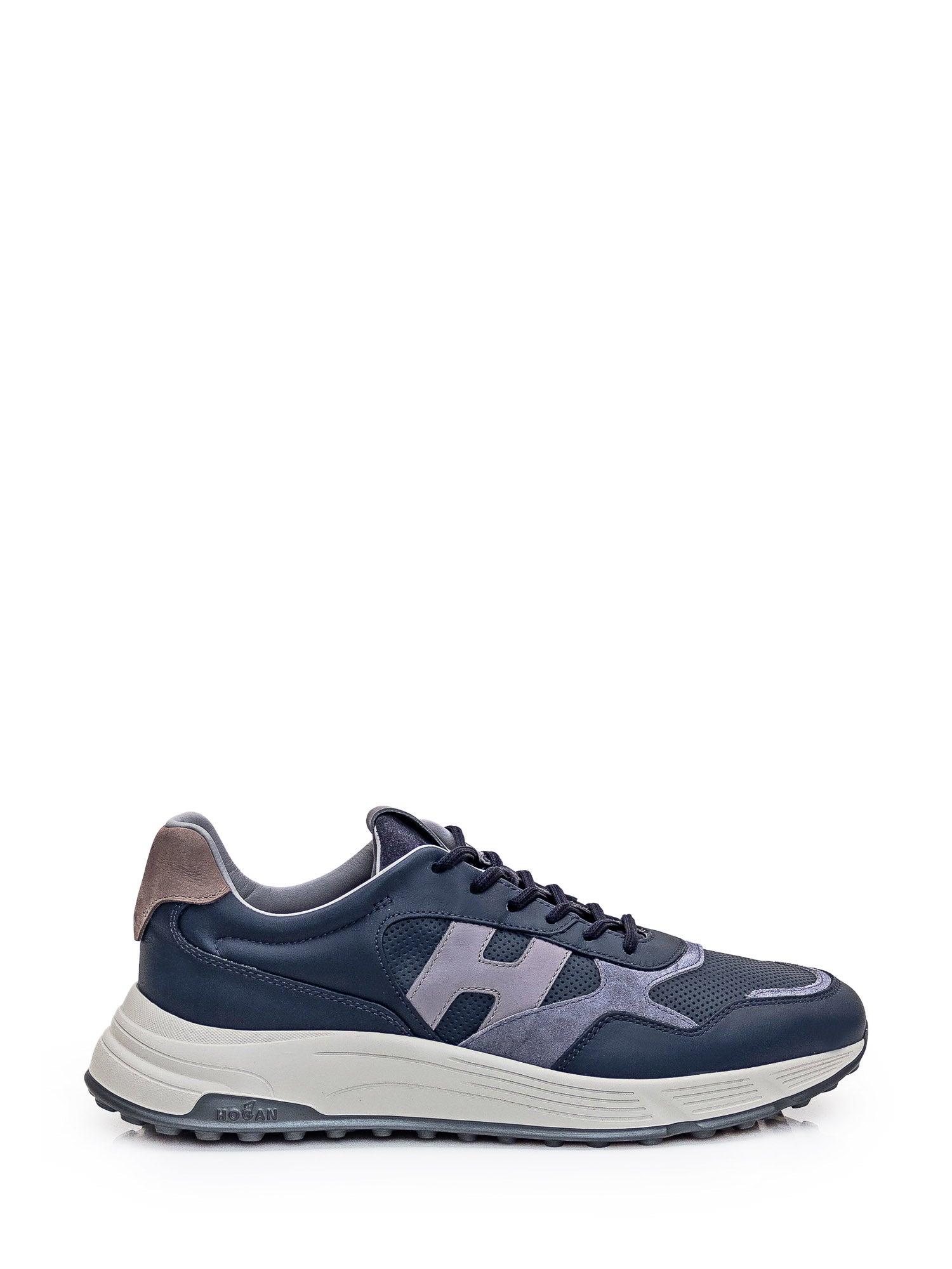 Blue leather sneaker. Perforated toe. Suede heel and tongue. Logo patch on tongue. Logo on both sides.