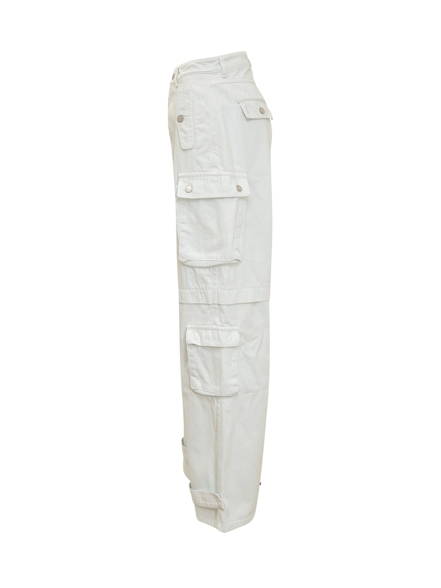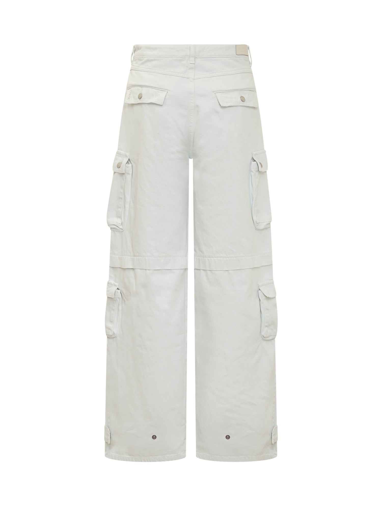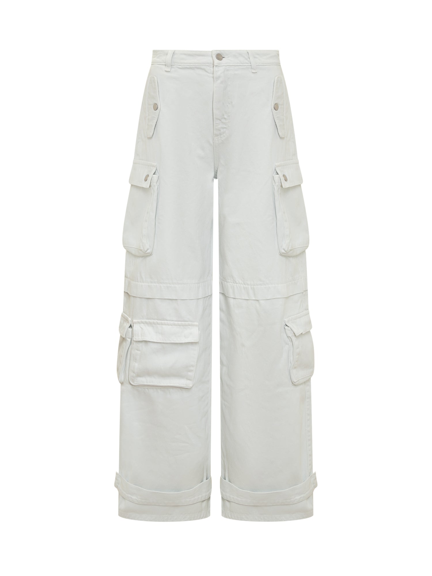 Long wide leg jeans. Zip button closure. Belt loops. Nine pockets. Patch logo on the back.