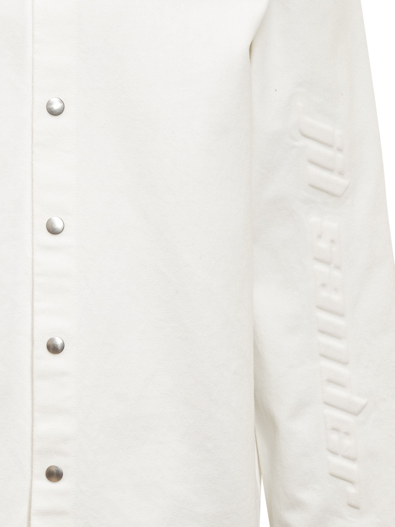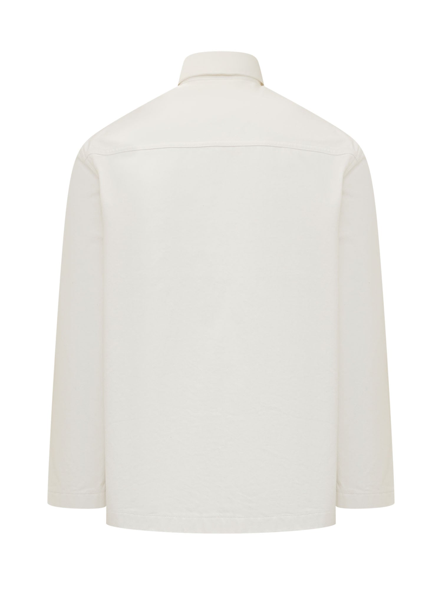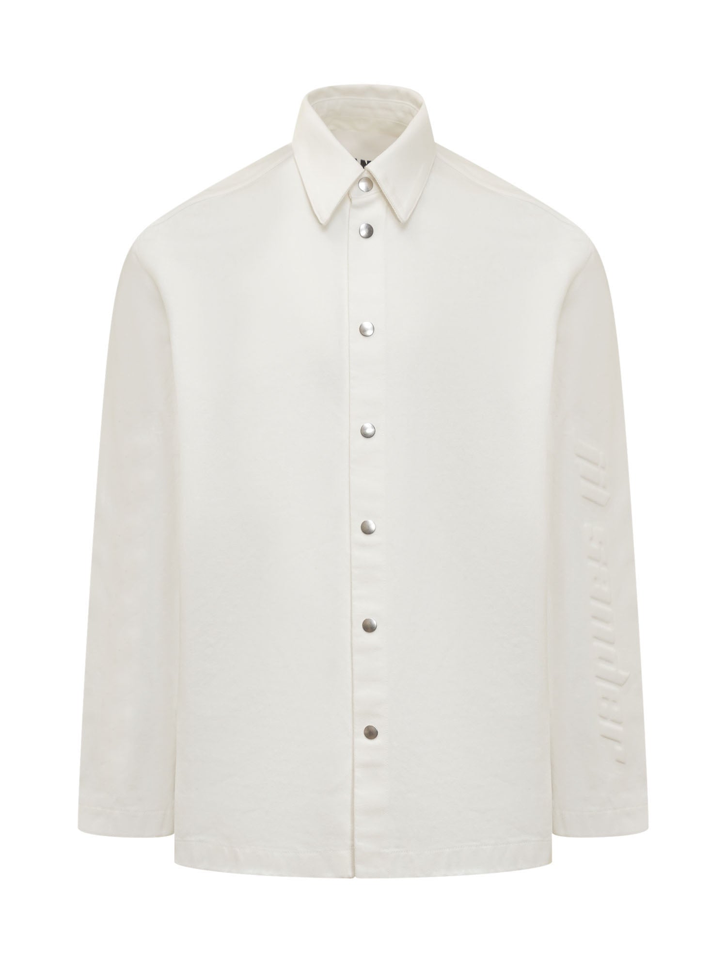 White shirt with long sleeves. Front button closure. Logo on the sleeve.