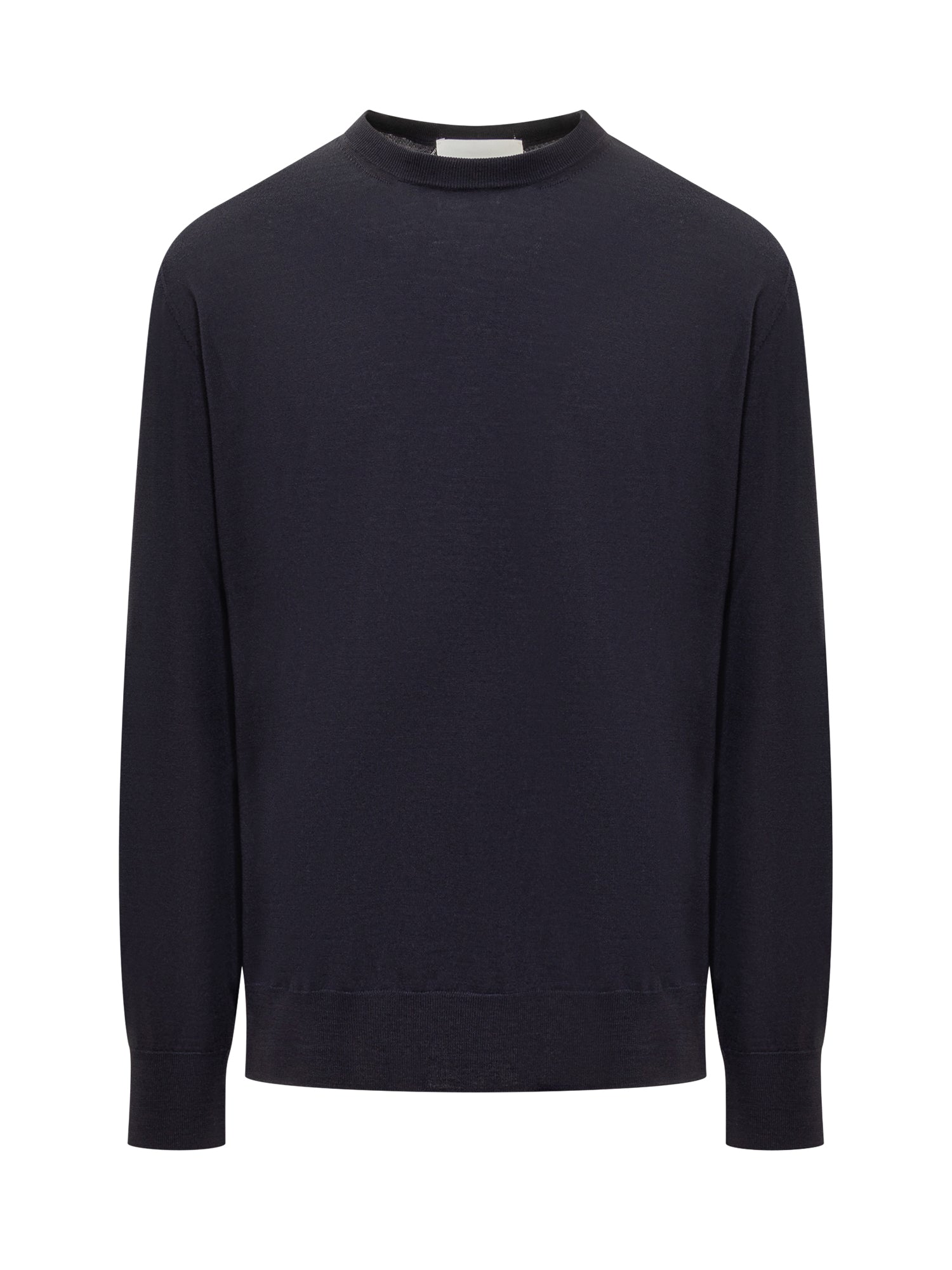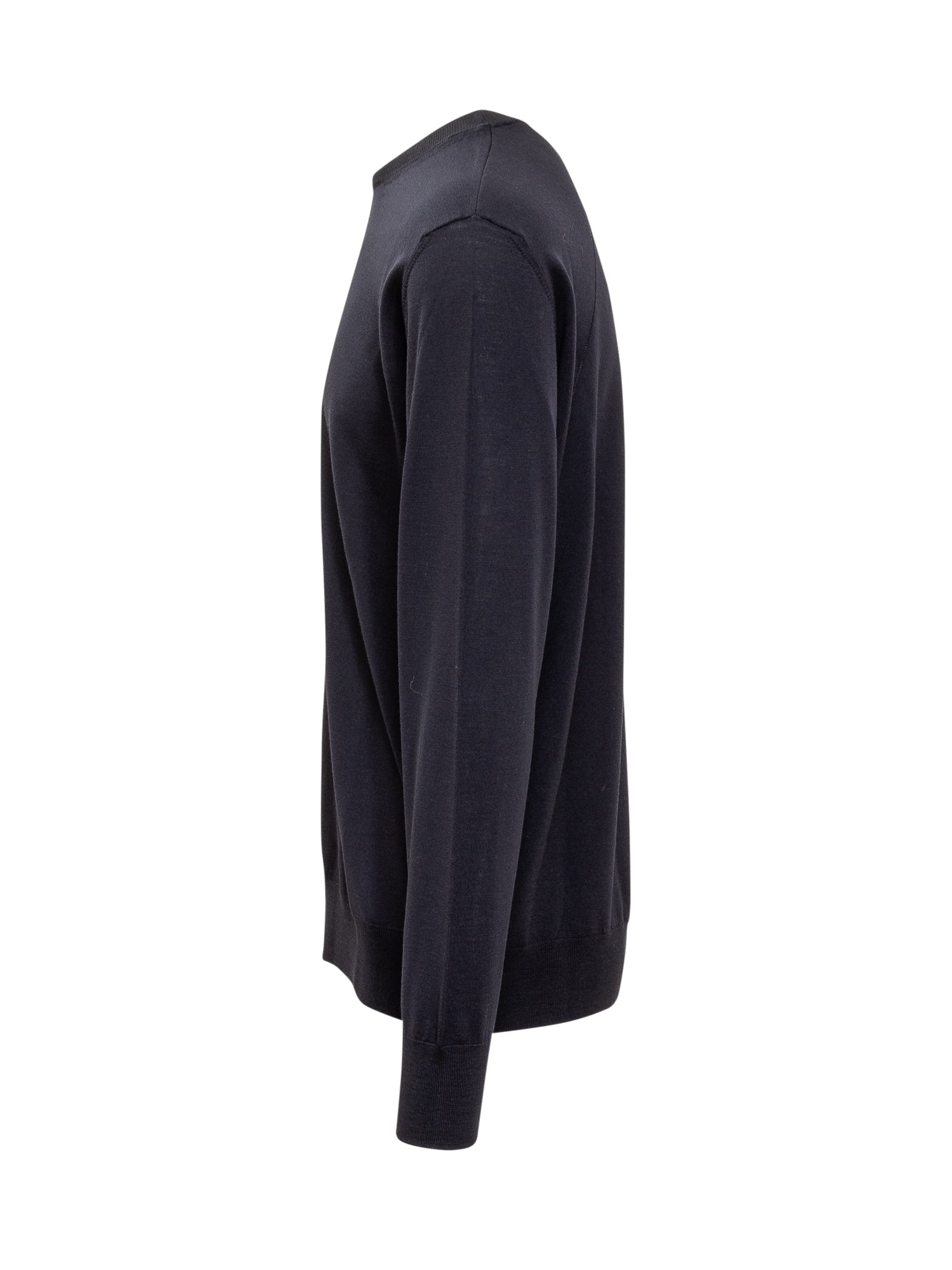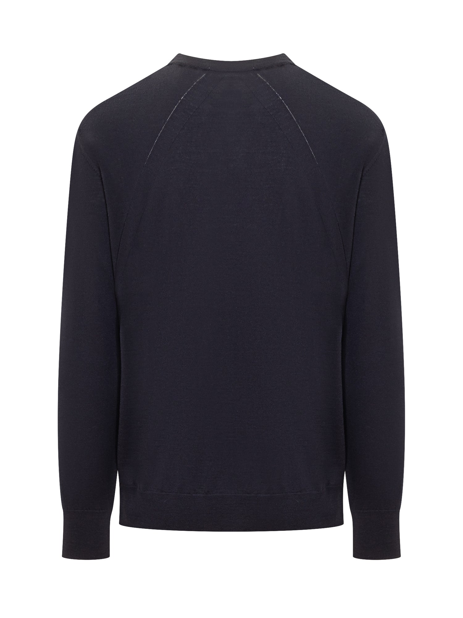 Wool sweater with long sleeves. Crew neck. Ribbed hems. Textured knit details on back.