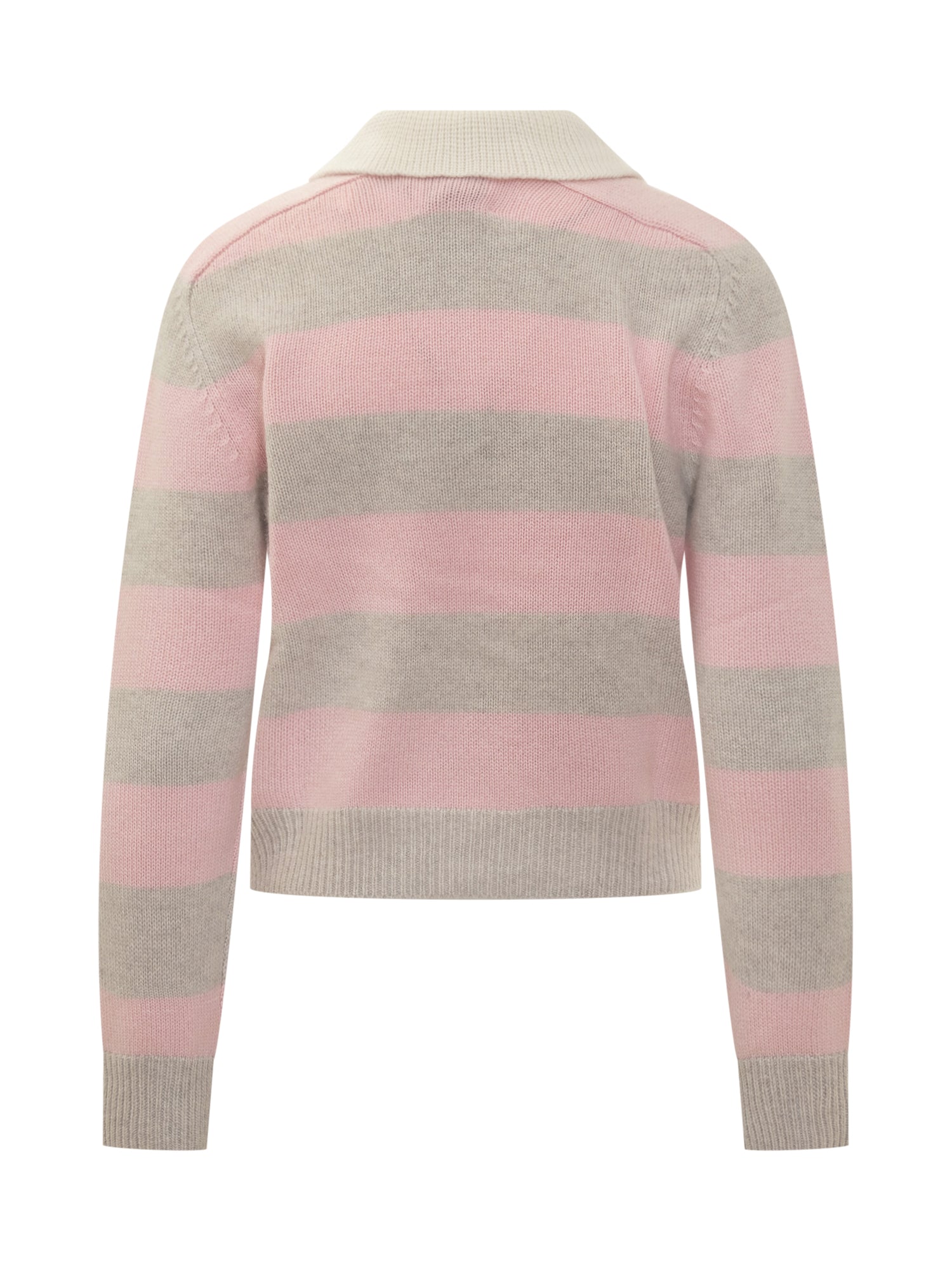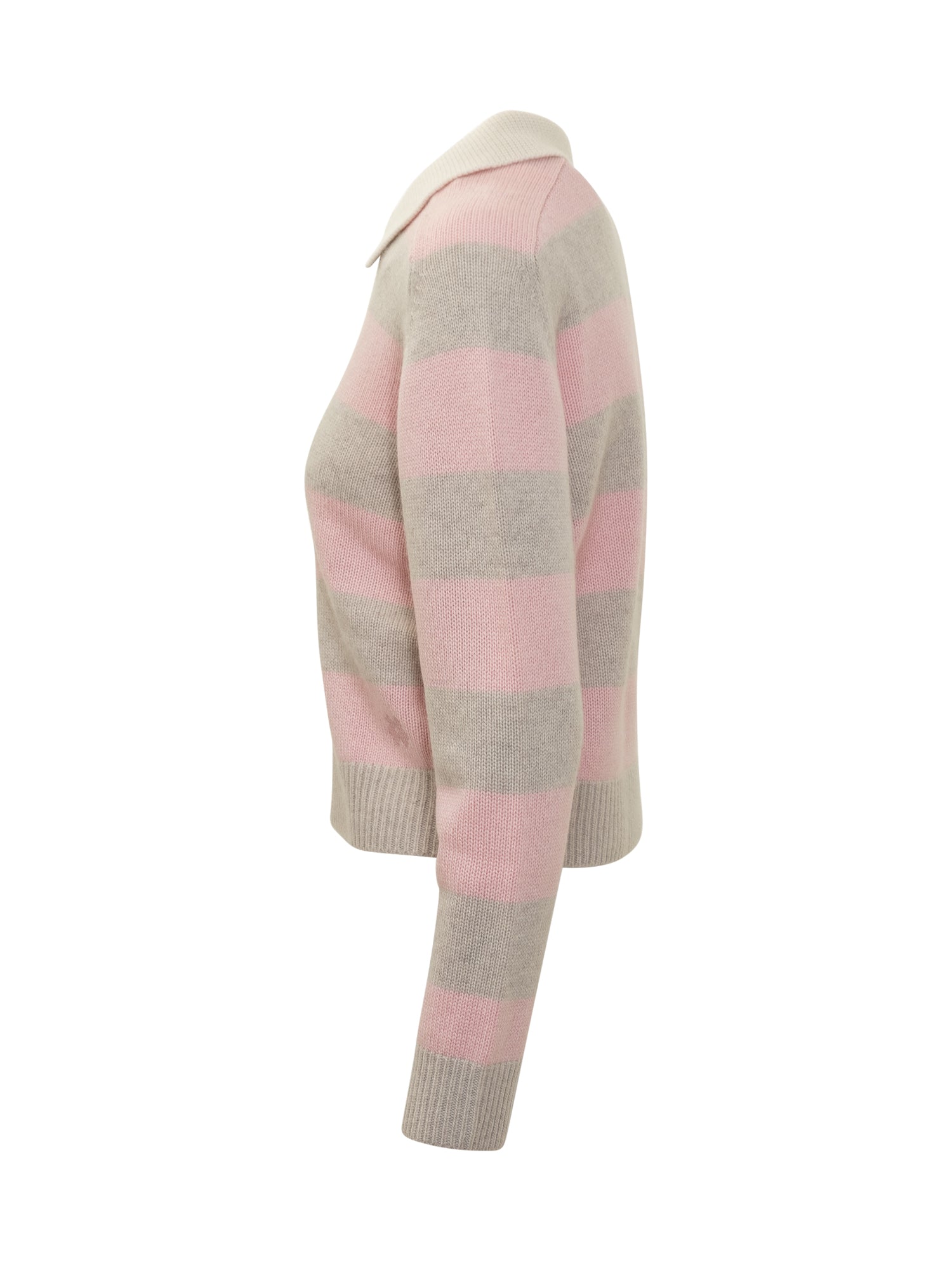 Kujten cashmere sweater with pink and grey stripes and contrasting white collar.