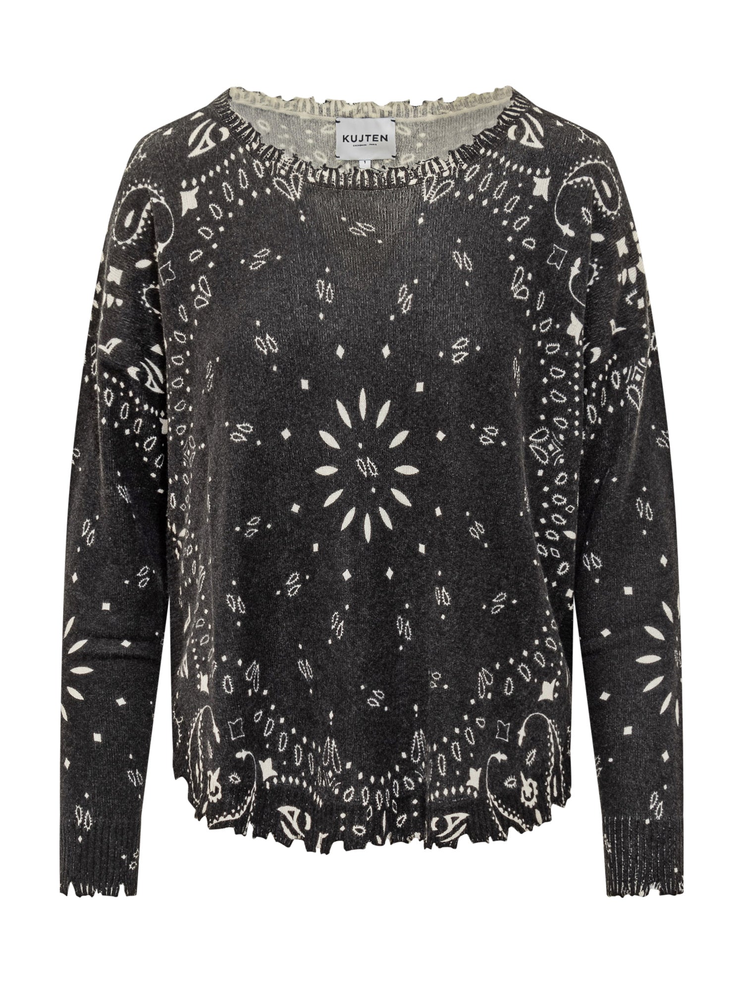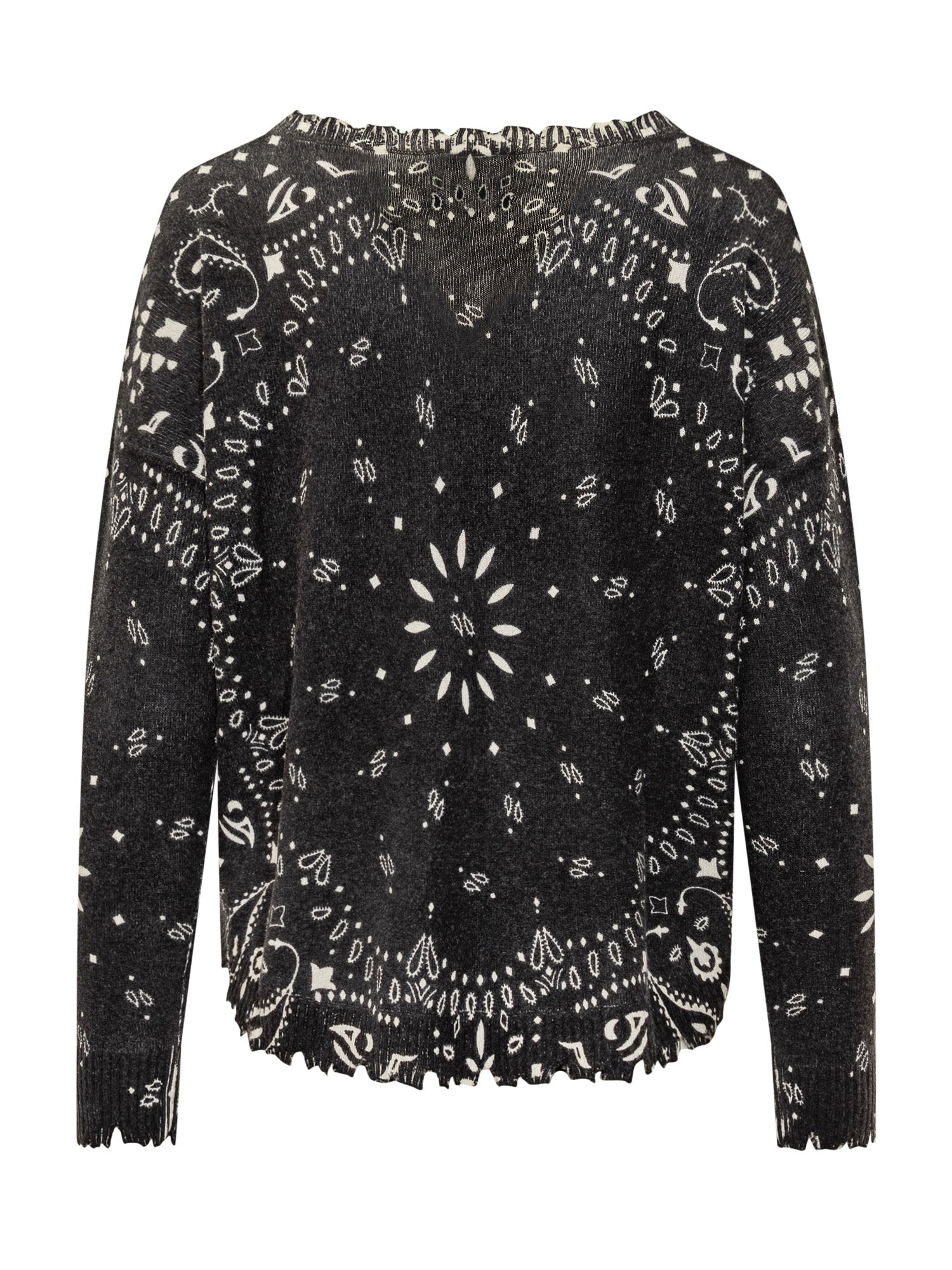 Women's anthracite cashmere sweater with white bandana print and raw-cut hems. A perfect blend of urban style and cozy elegance.