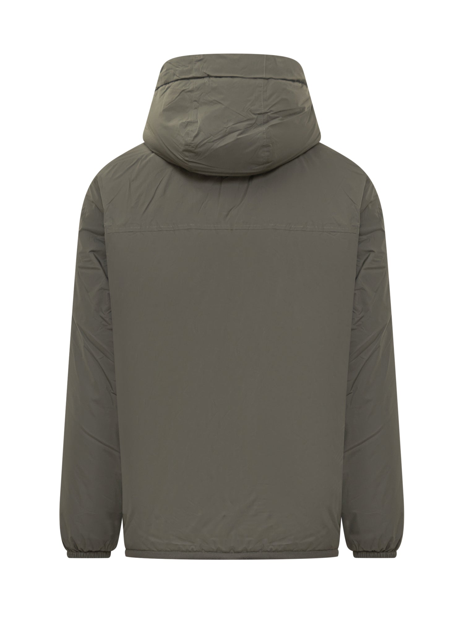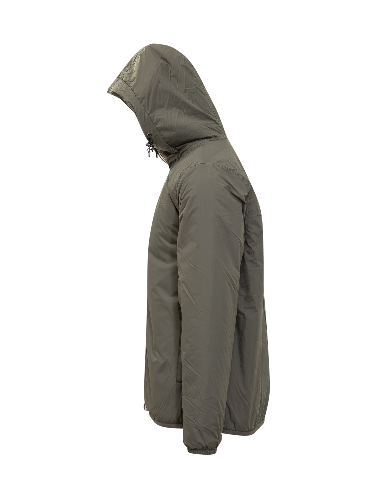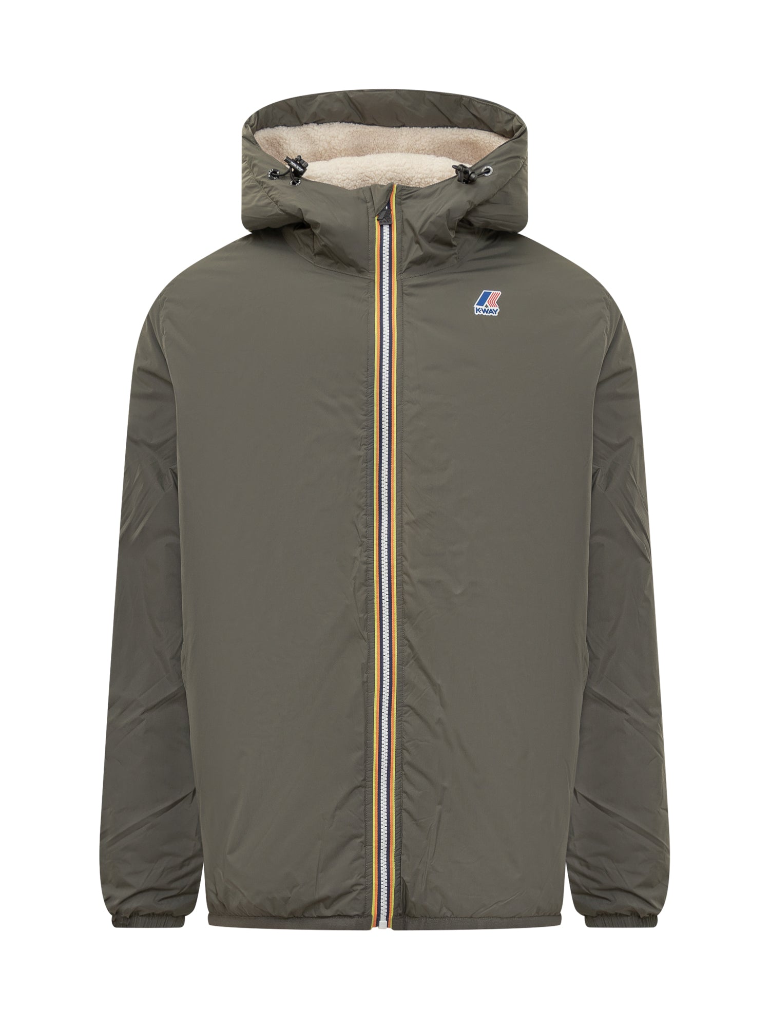 Green K-Way jacket with adjustable hood, multicolor zip and warm sherpa lining.