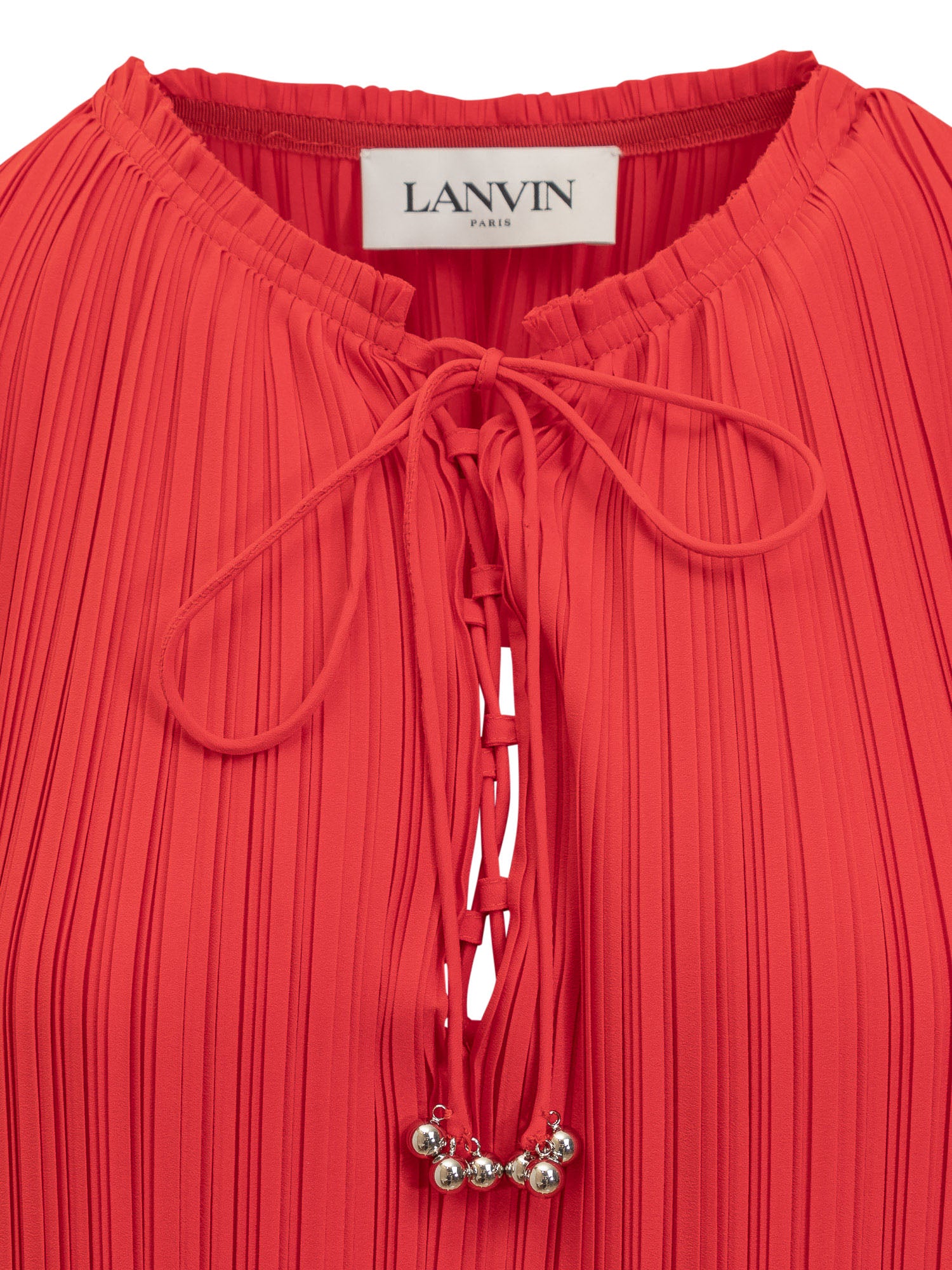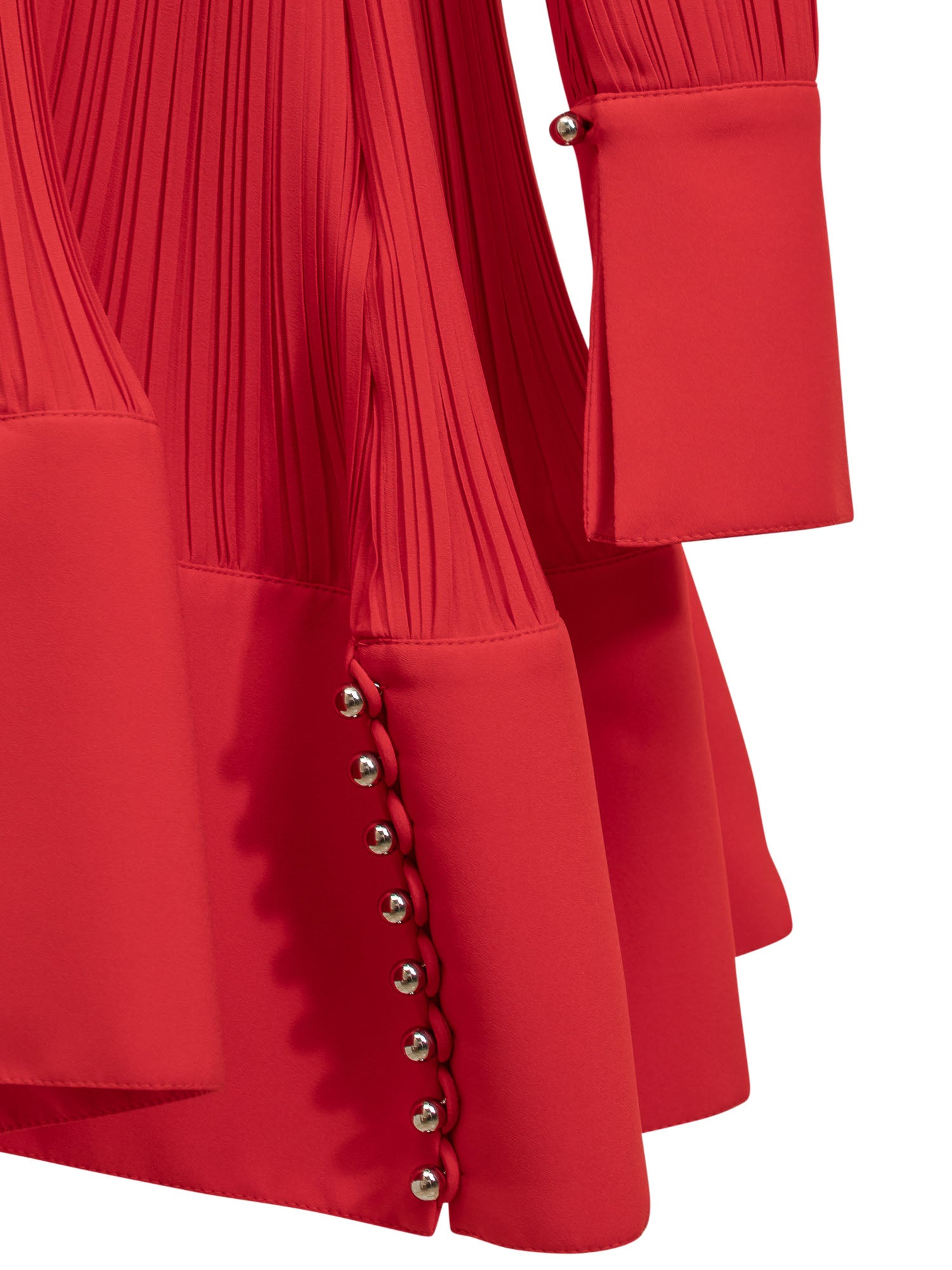 Mini dress with long sleeves. Round neck. Delicate ruffles around the neck. Closure with three buttons and thin drawstrings. Wide sleeve shirt cuff with snap buttons. Ruffles on the bottom of the dress with snap buttons on the slit.