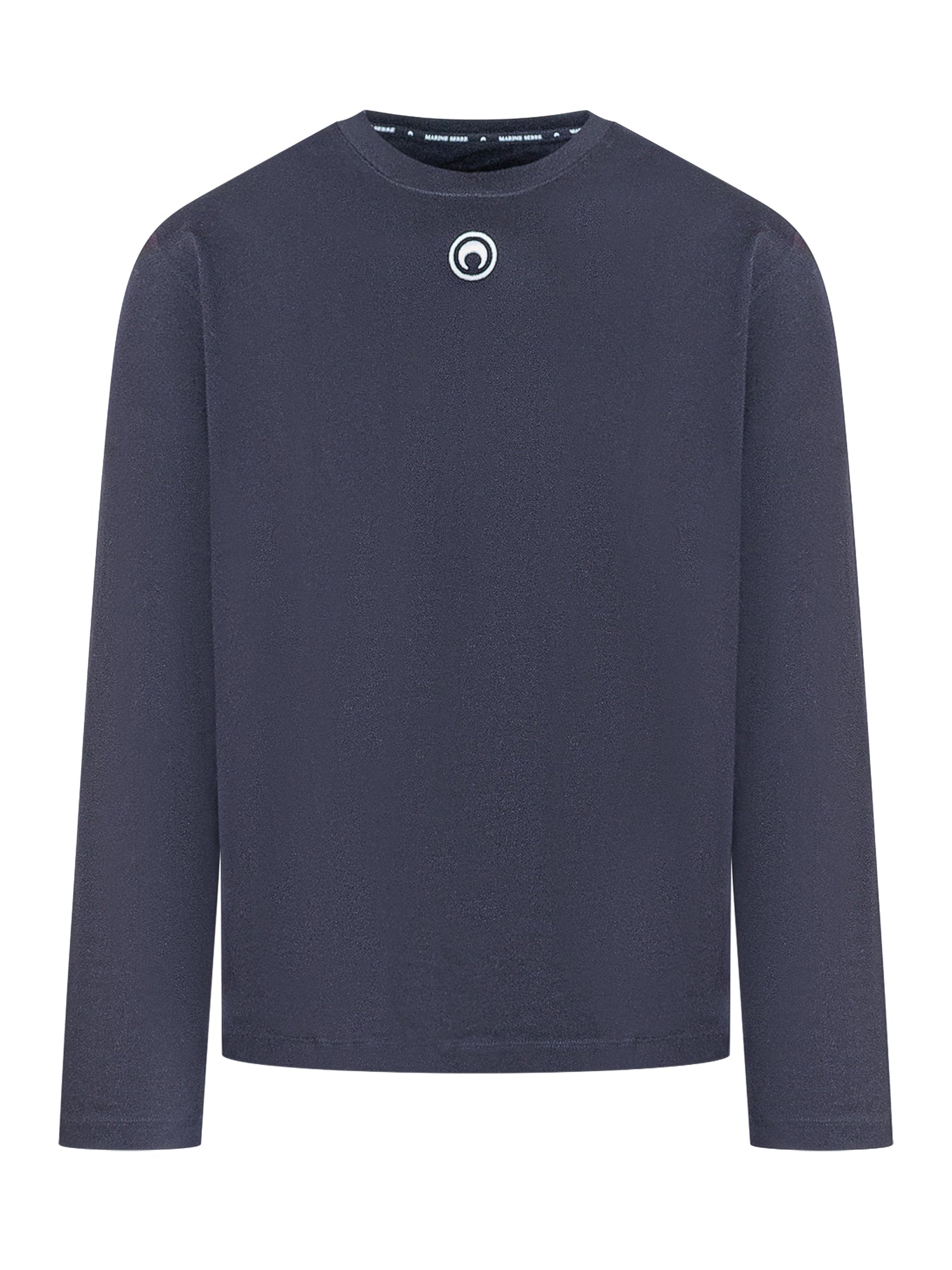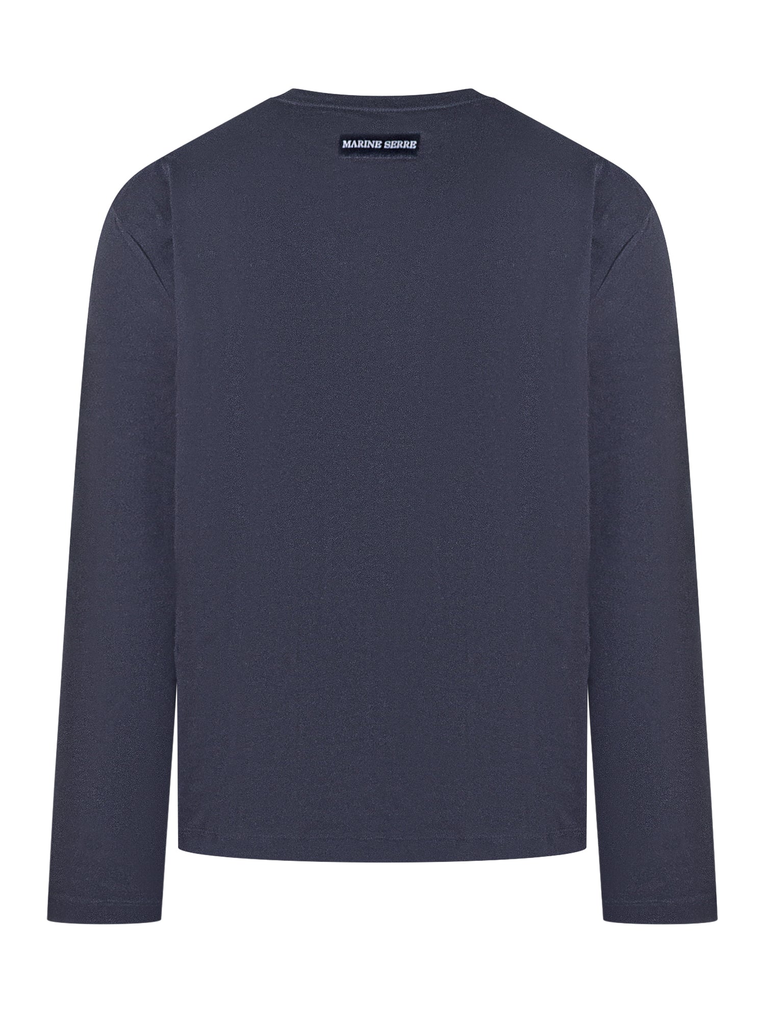 Marine Serre blue long-sleeve top featuring the iconic crescent moon logo embroidered on the chest.