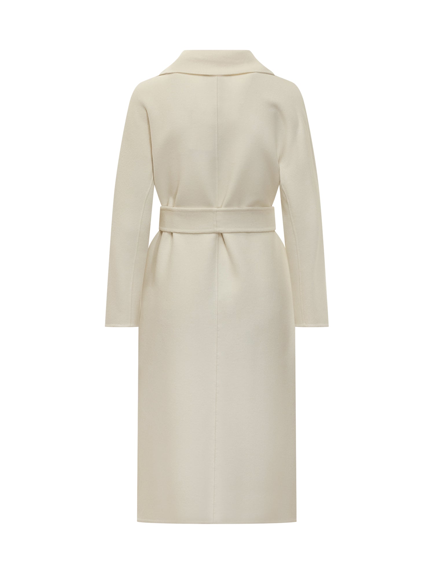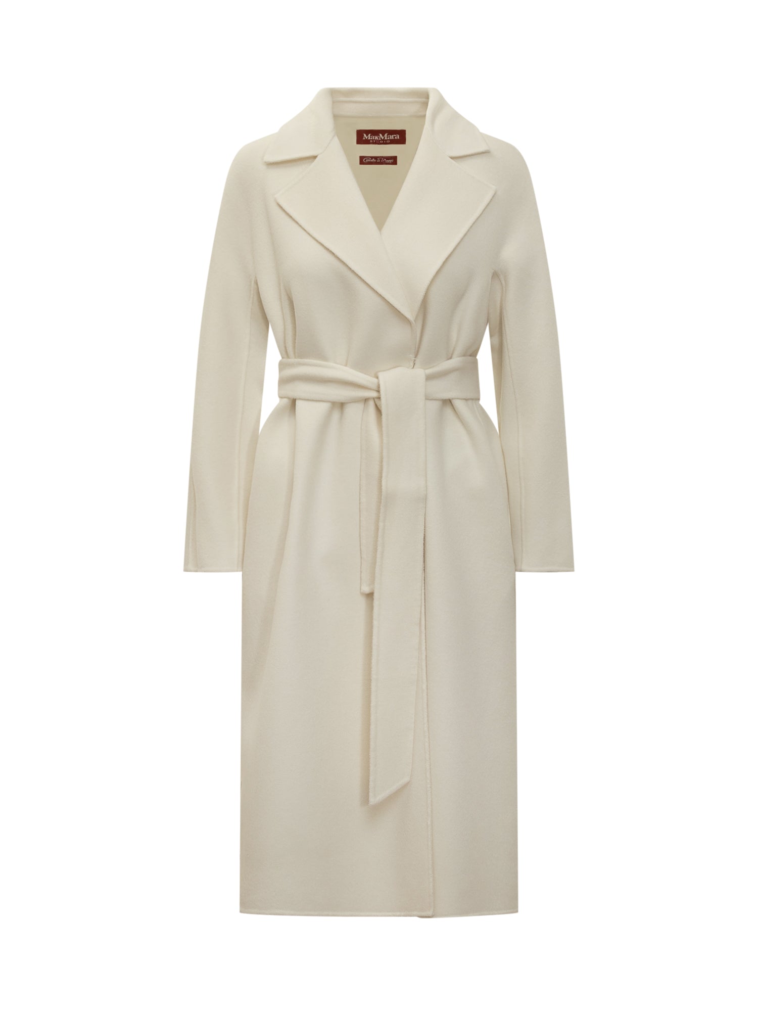 Max Mara Studio ivory wool coat with waist belt and classic lapels.