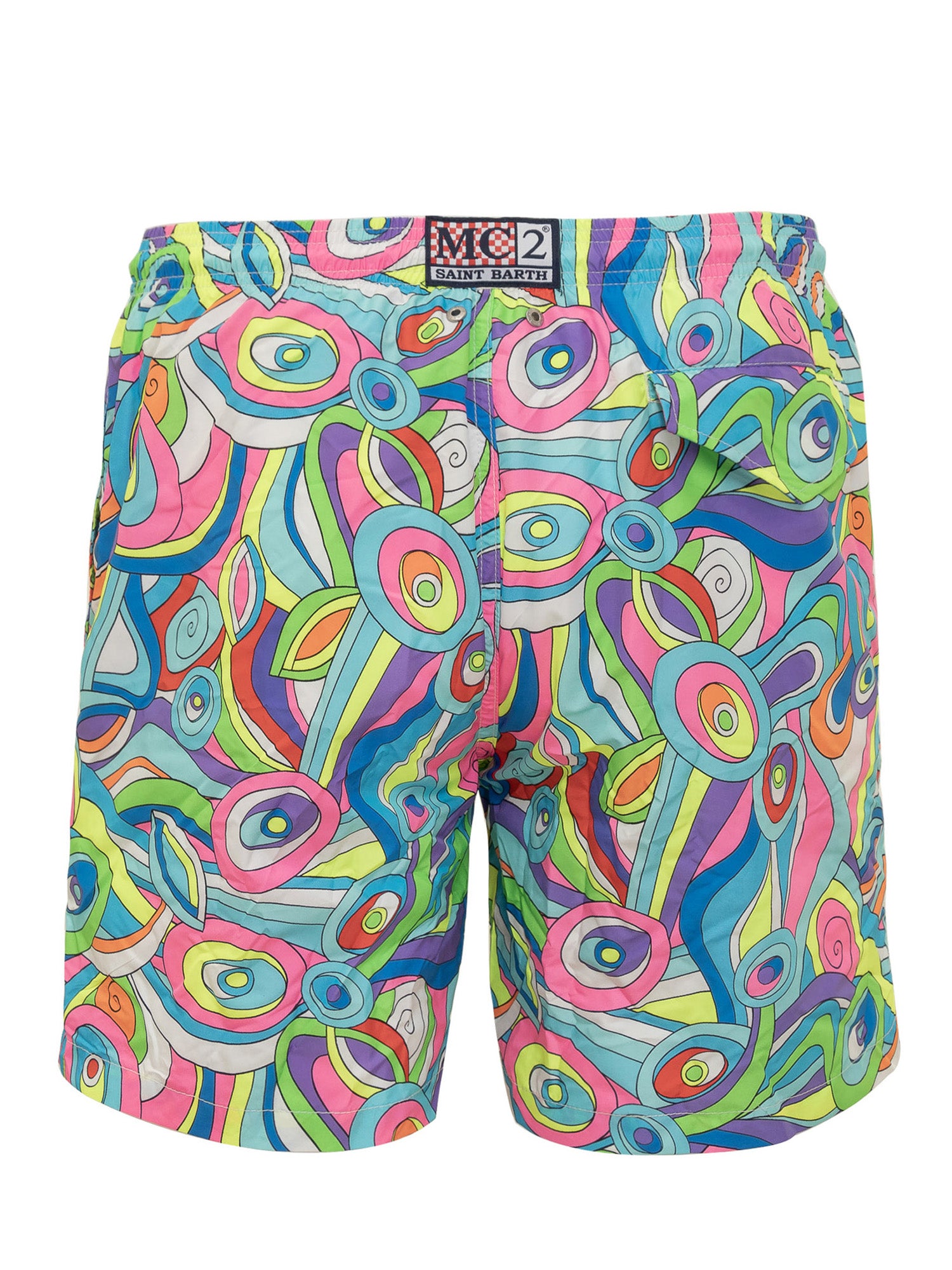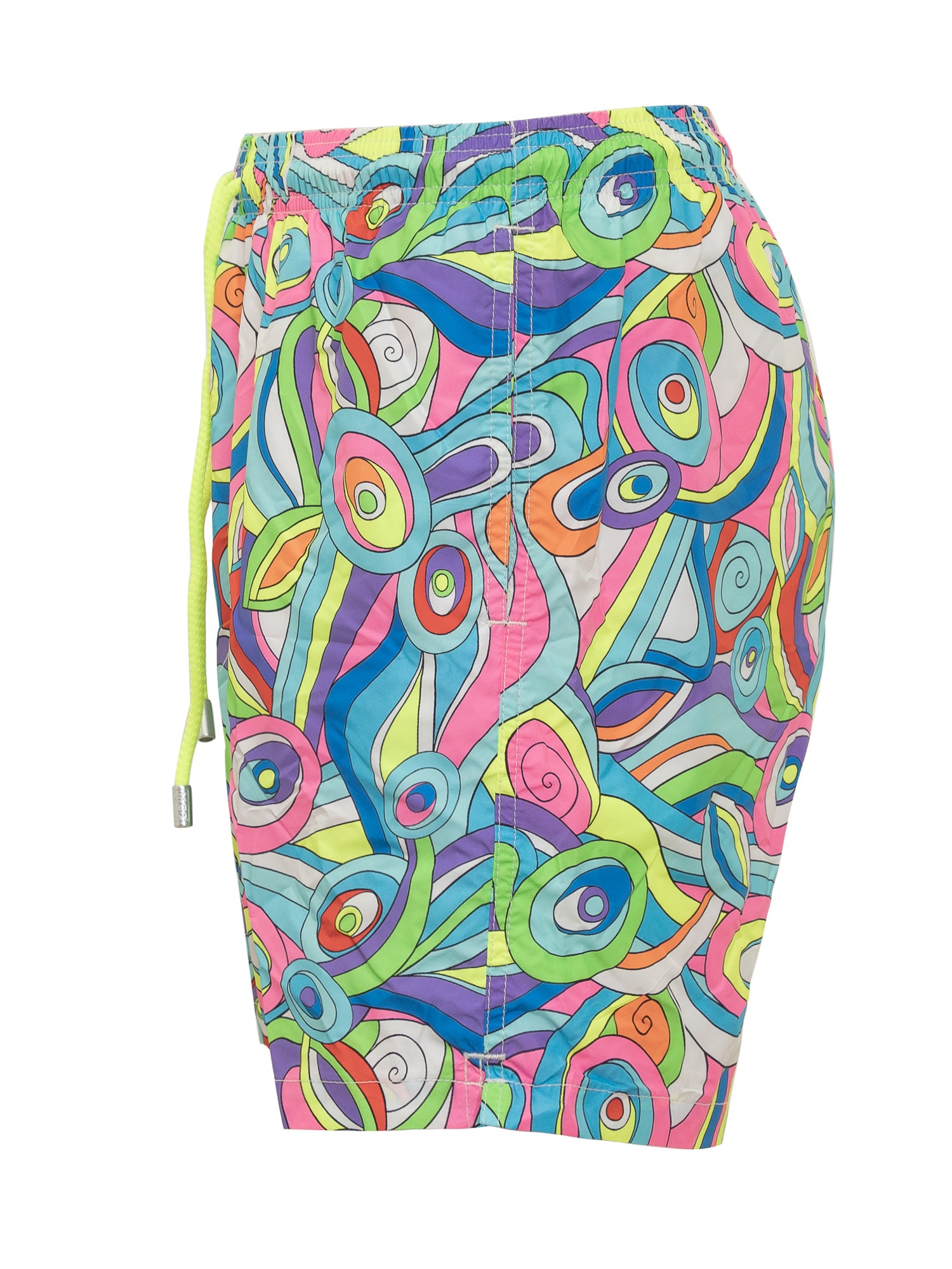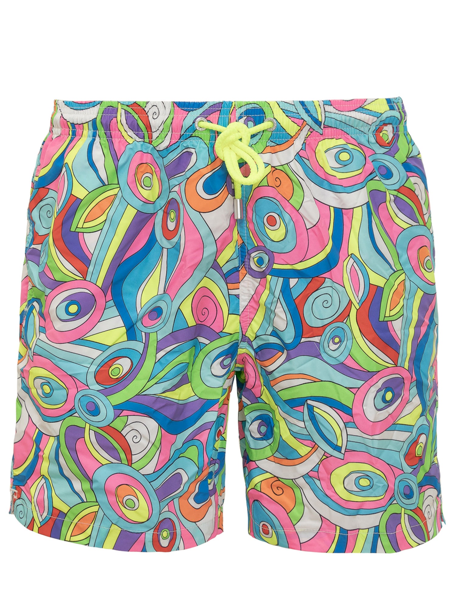 Boxer swimwear. Drawstring waist. Inner mesh. Side welt pockets. Back pocket with flap. Logo on the back. All over pattern.