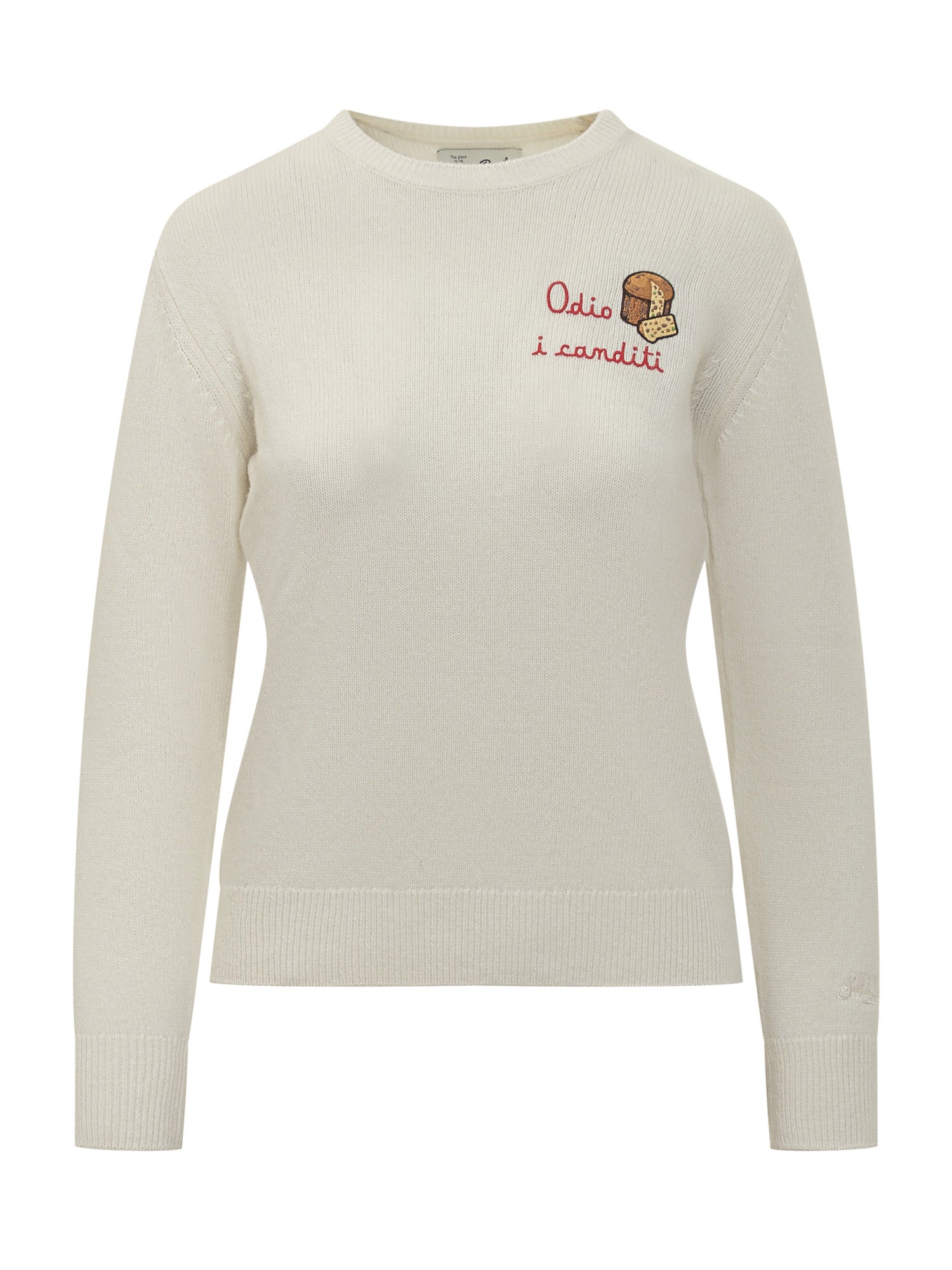 MC2 Saint Barth New Queen Embry sweater in cream wool featuring Odio i canditi embroidery. Crew neck design with a relaxed fit.