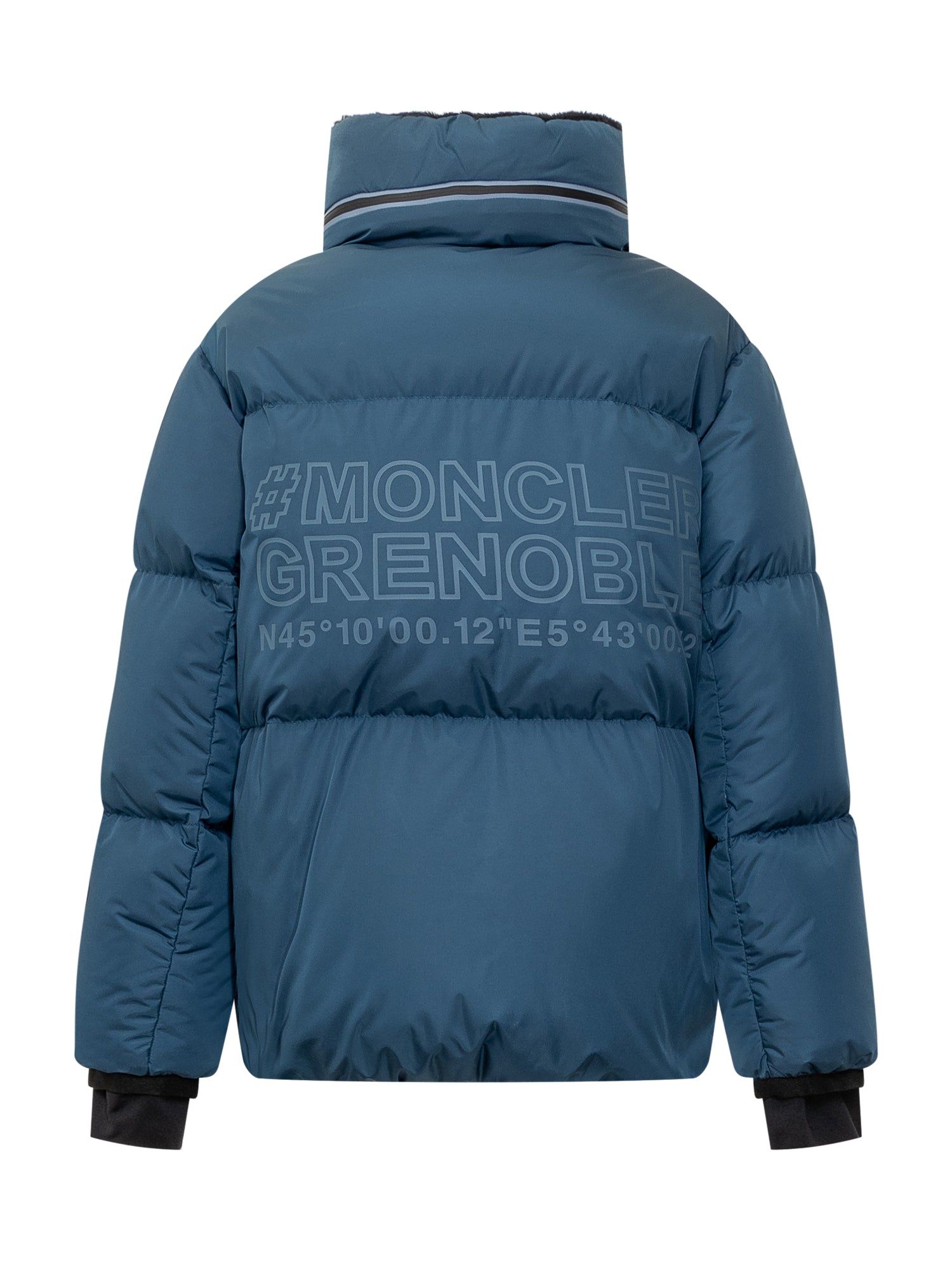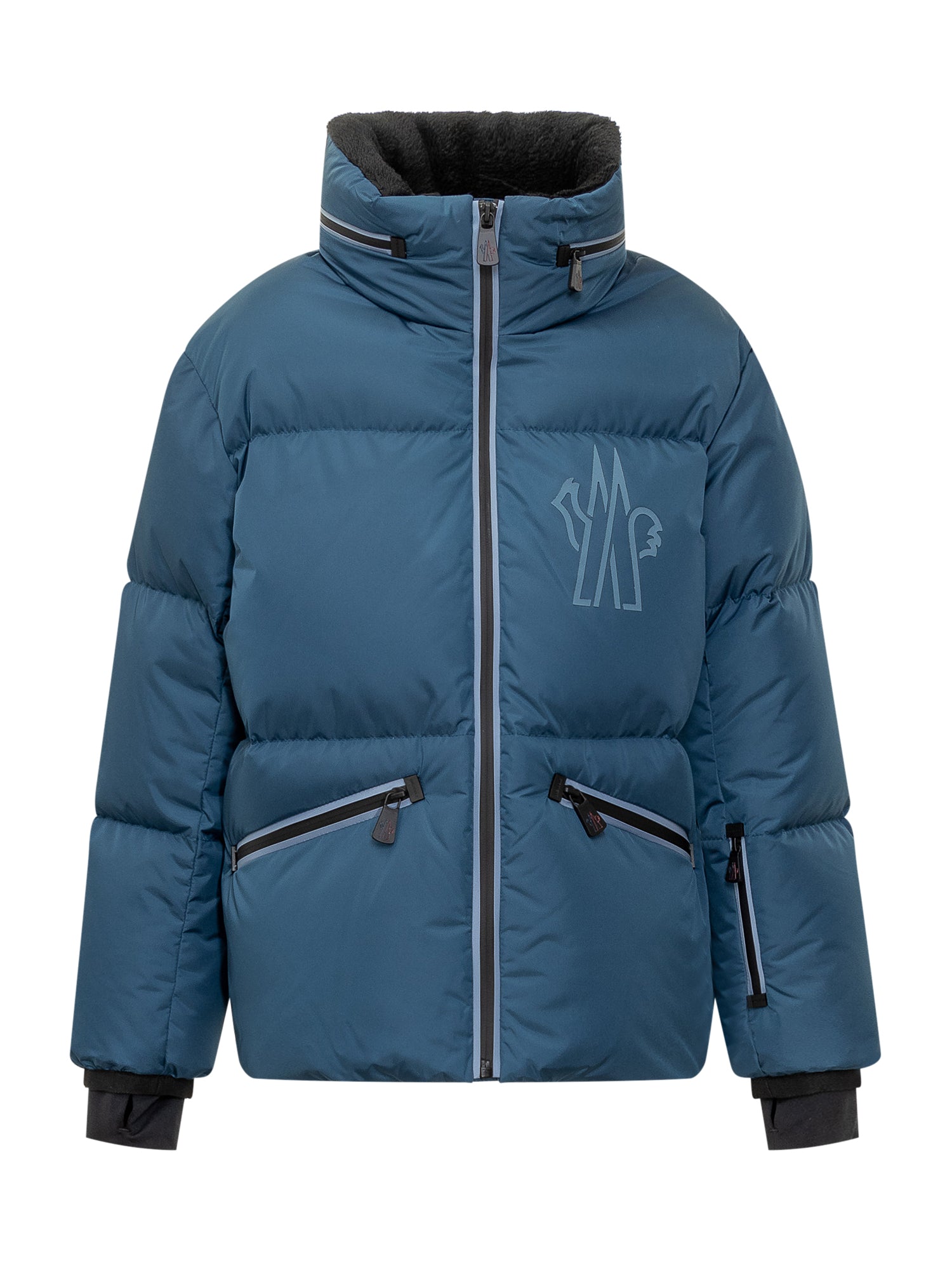 Down jacket with hood and high collar. Zipper closure. Elasticized hems. Two pockets. Logo on front.