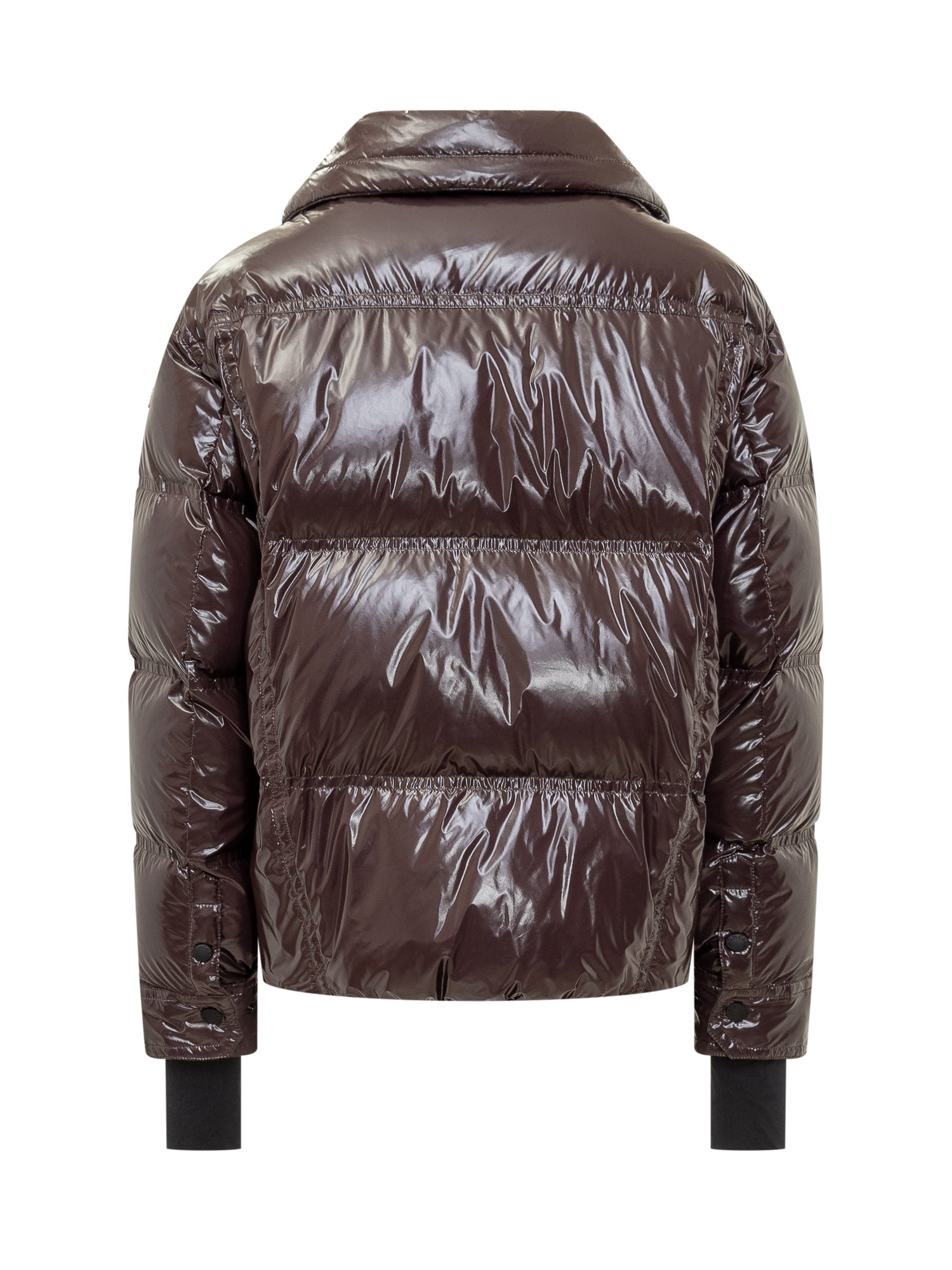 Long-sleeved down jacket. High neck. Zip and button fastening. Two pockets with button on the front. Two flap pockets with button on the chest. Cuffs with holes. Zip pocket on the sleeve. Logo patch on the sleeve.