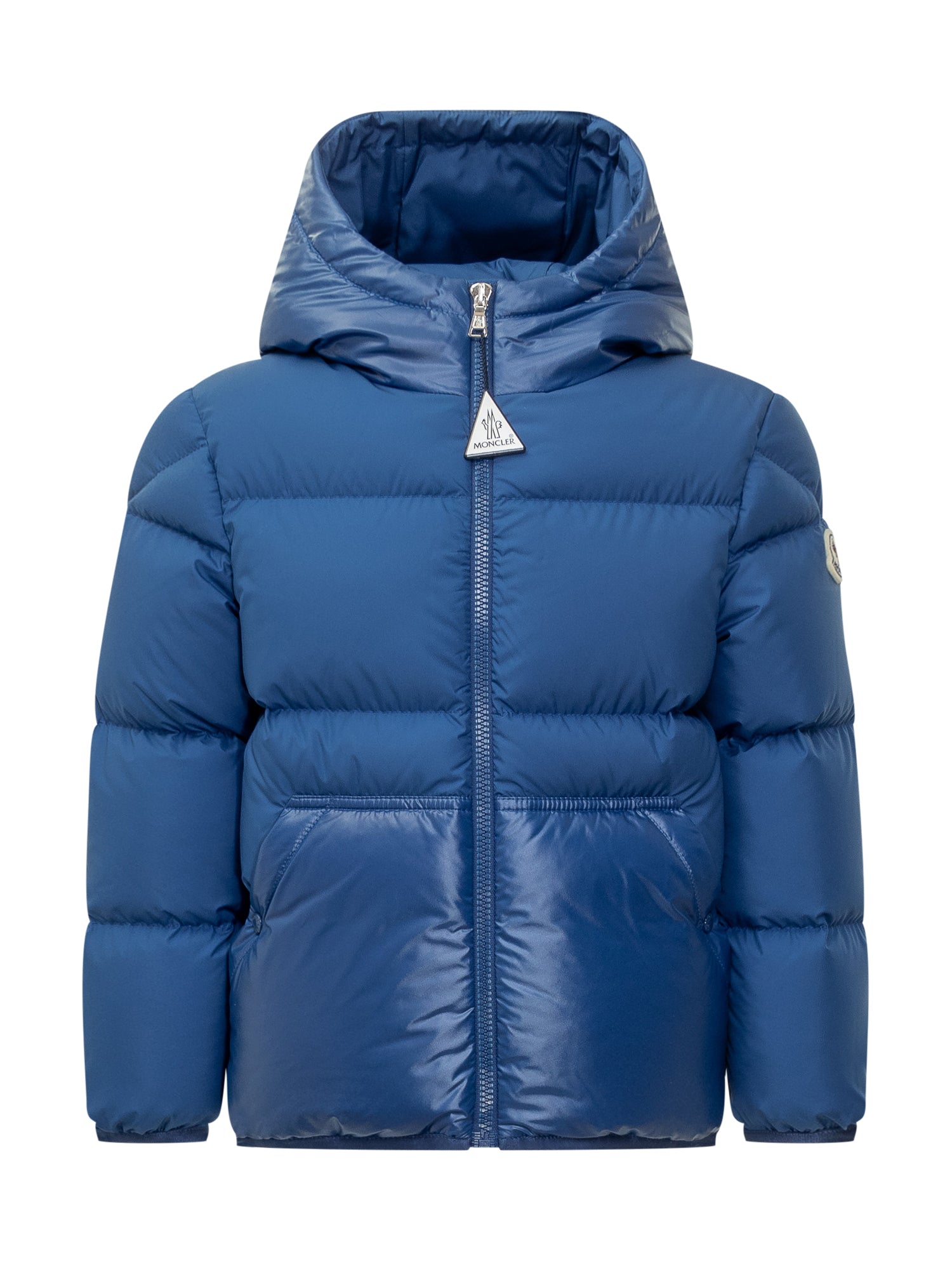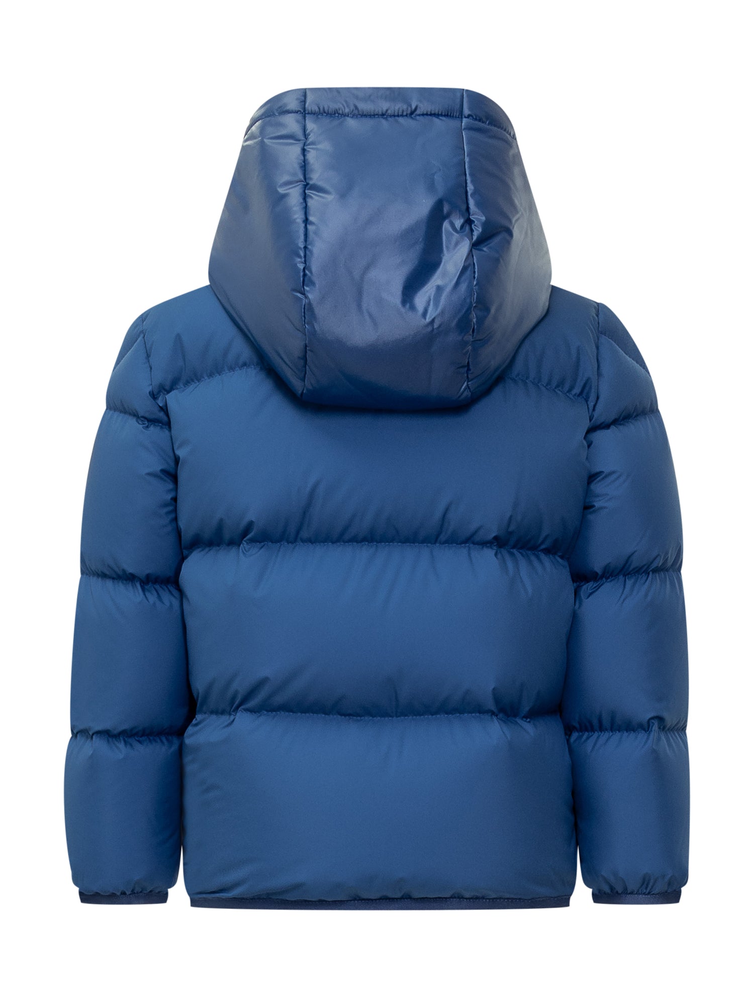 Down jacket with hood and high collar. Zipper closure. Elasticized hems. Two pockets. Logo on sleeve.