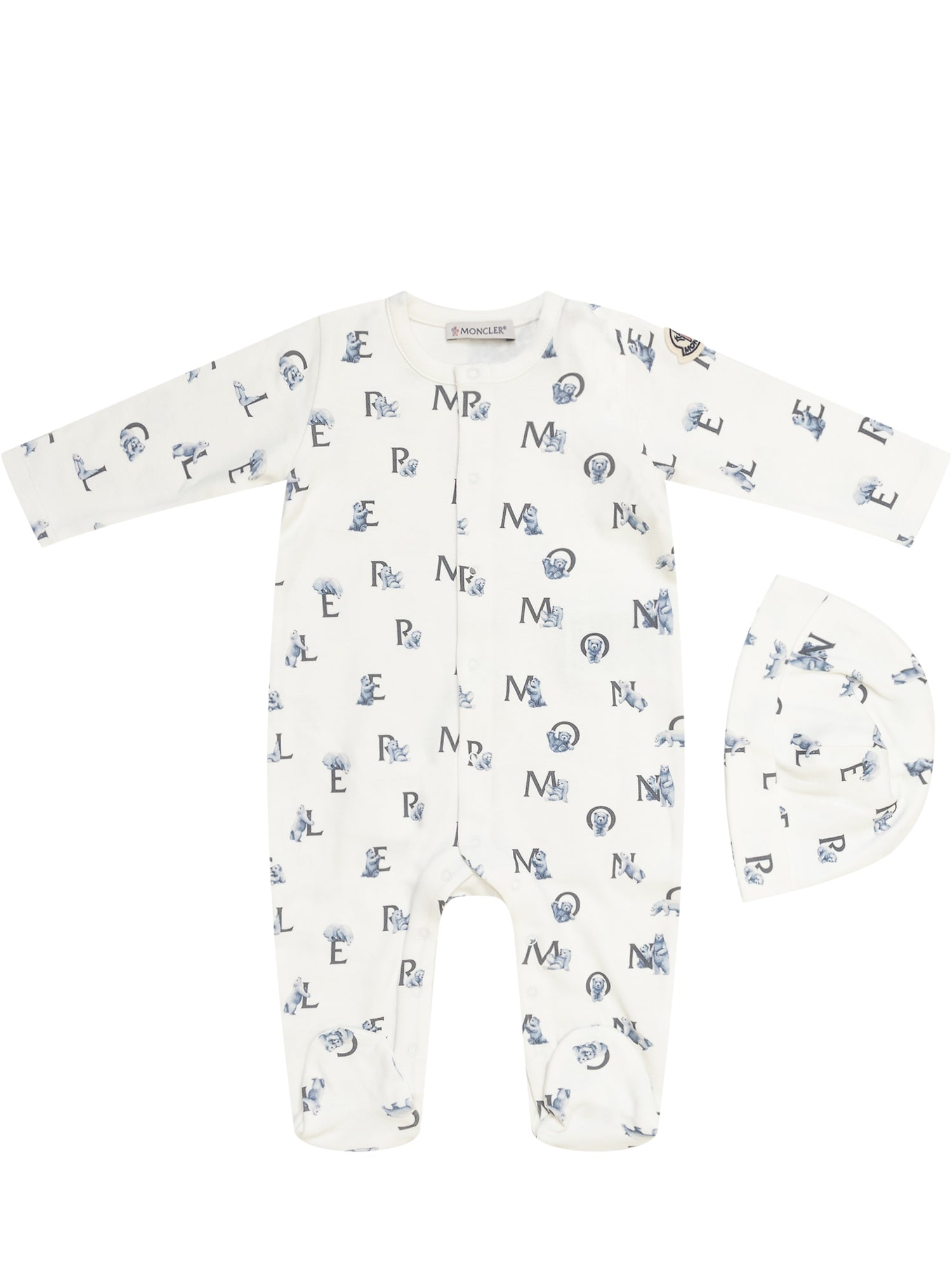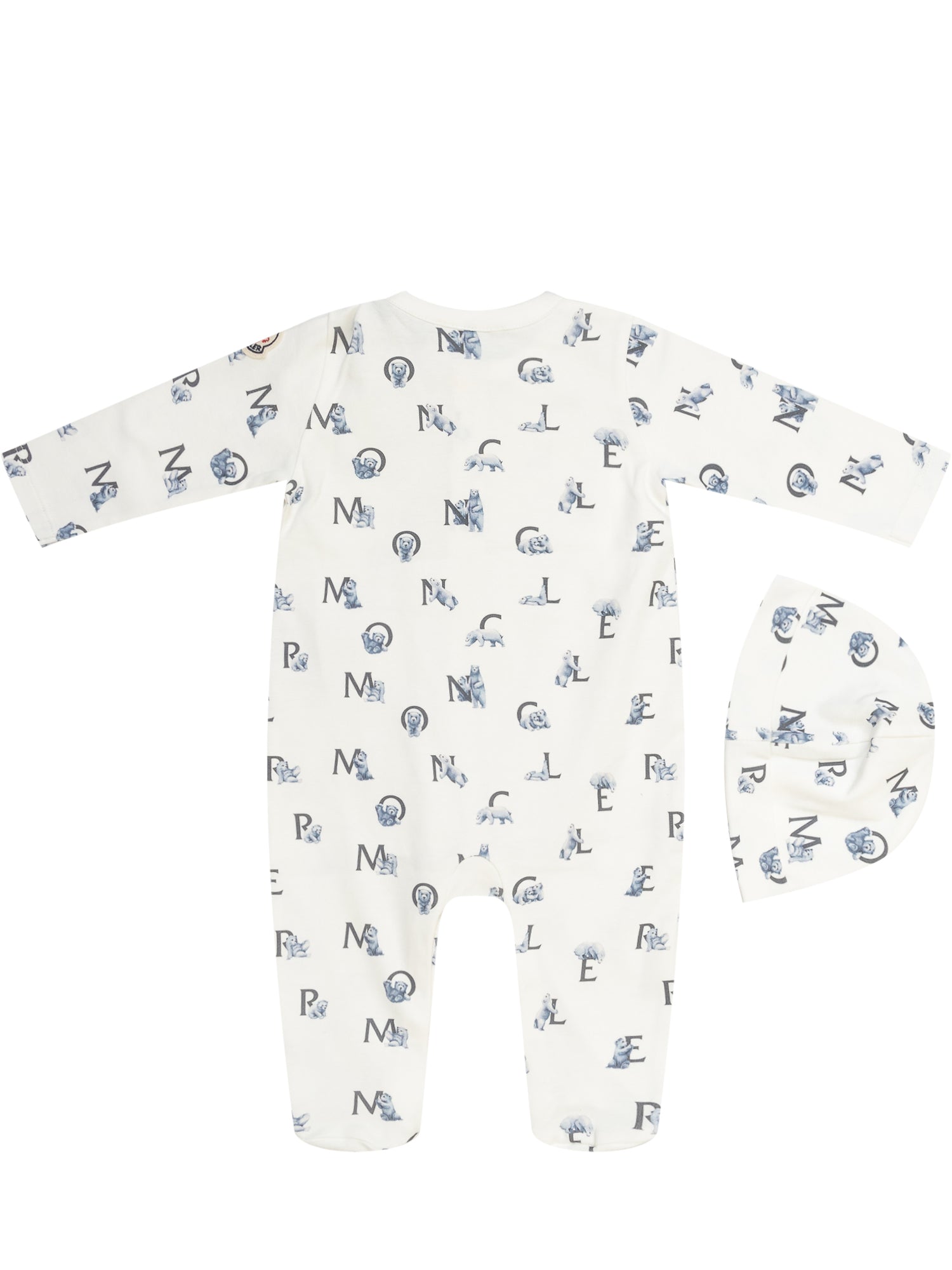 Moncler cotton babygrow with matching hat. All-over print with blue letters and characters. Soft and comfortable, perfect for newborns.