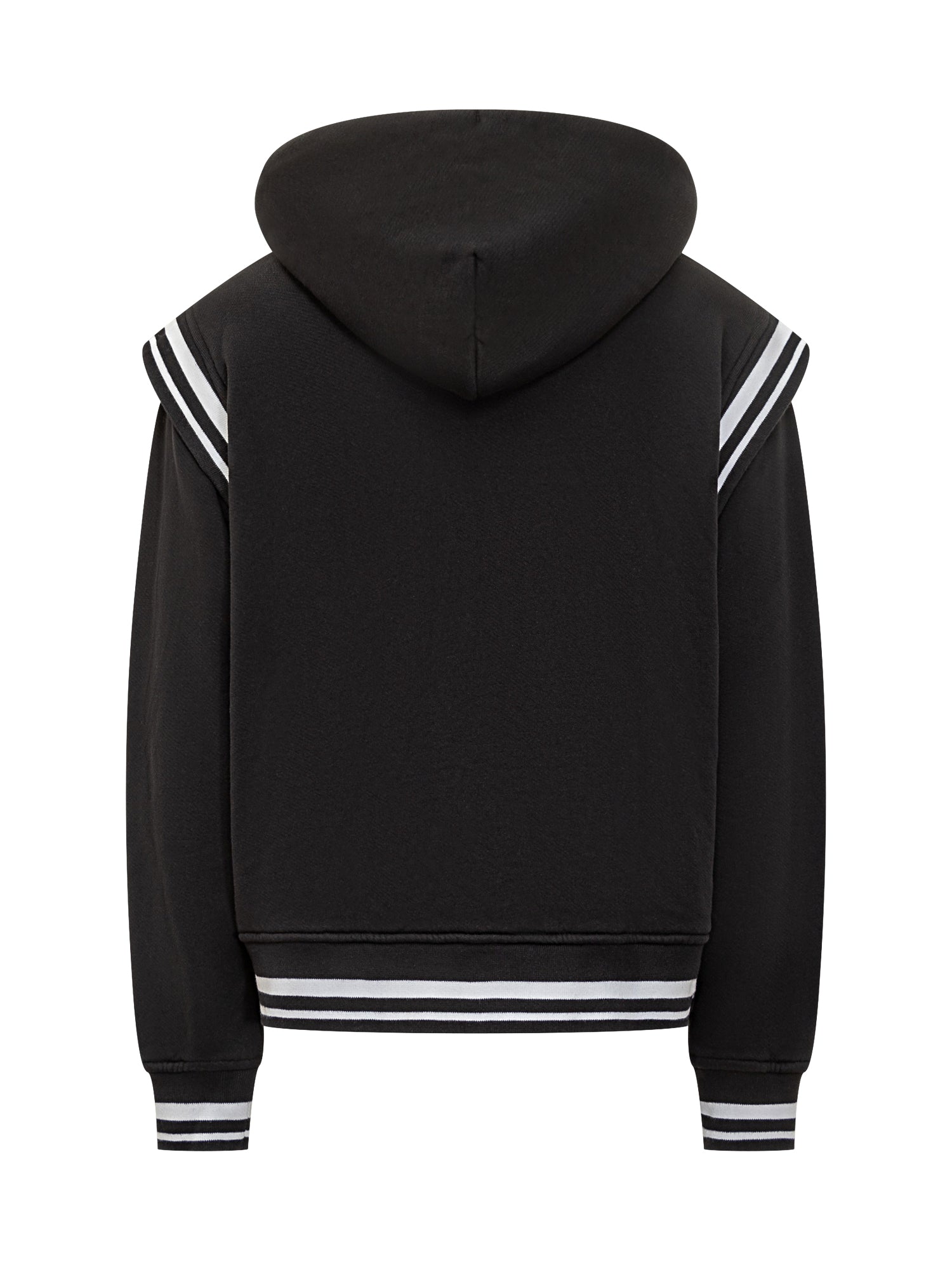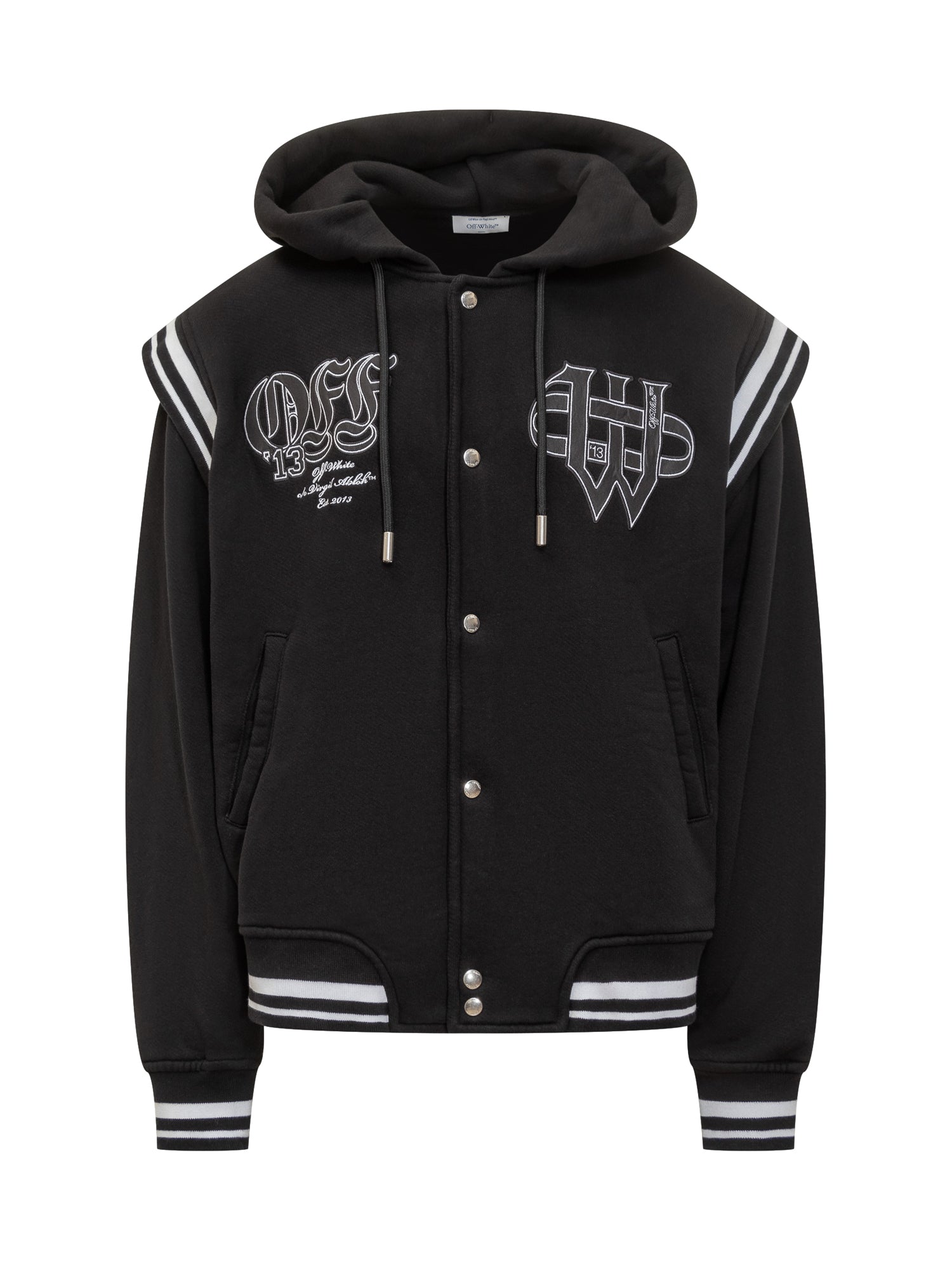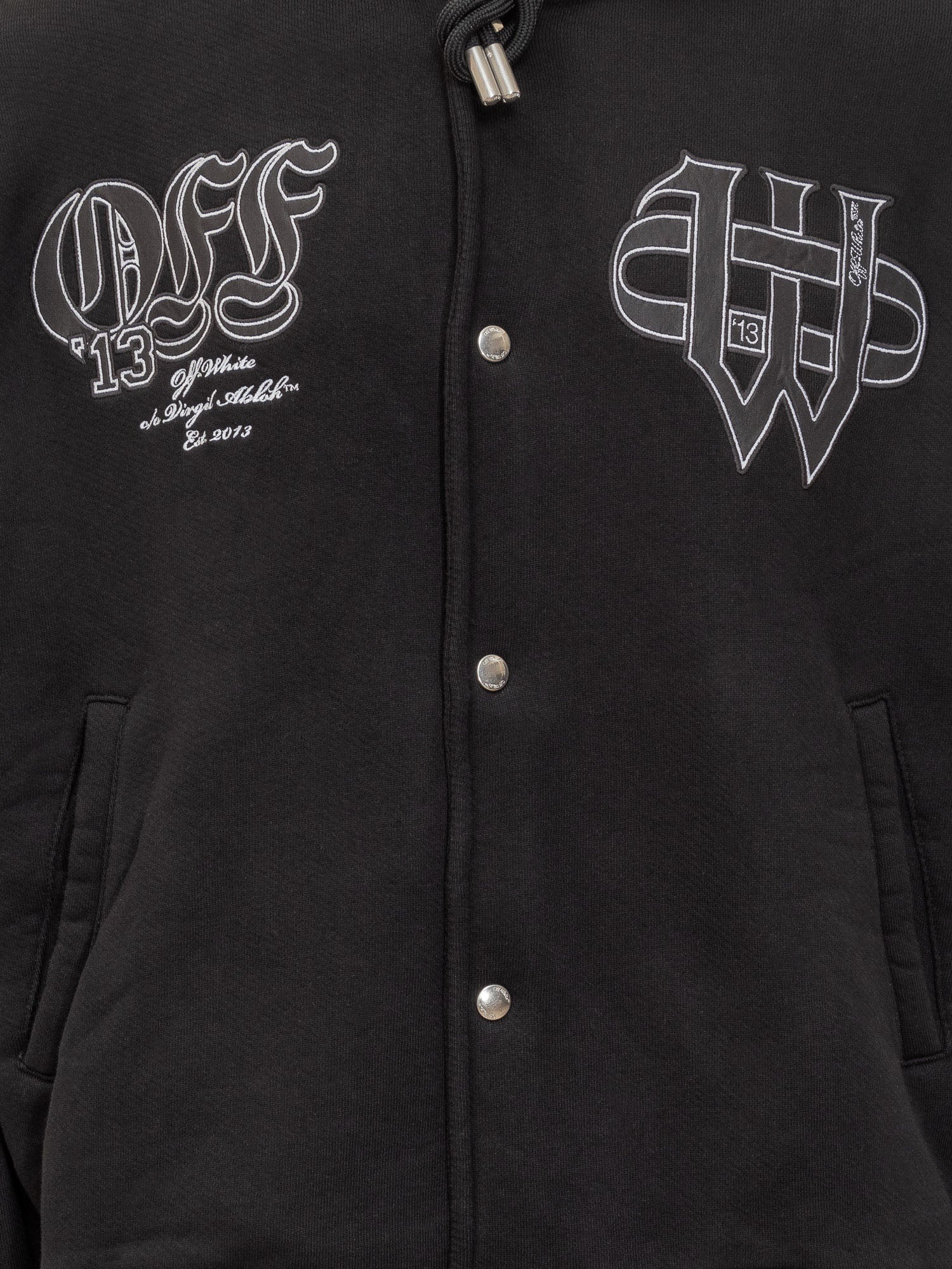 Off-White black varsity hoodie with snap buttons and gothic embroidery on the chest.