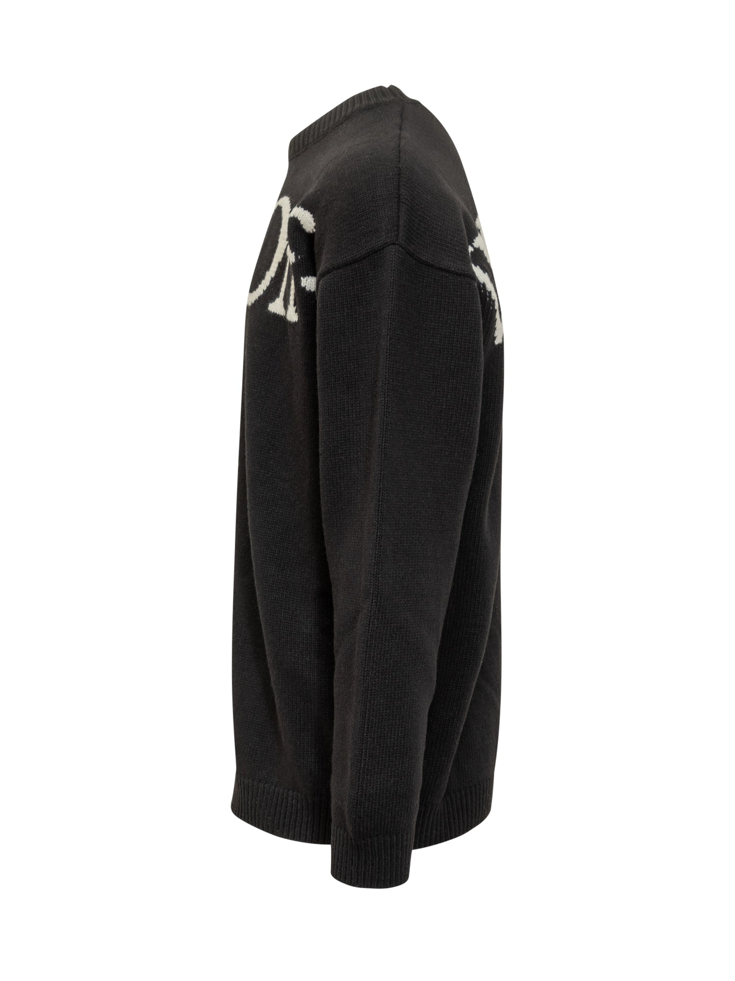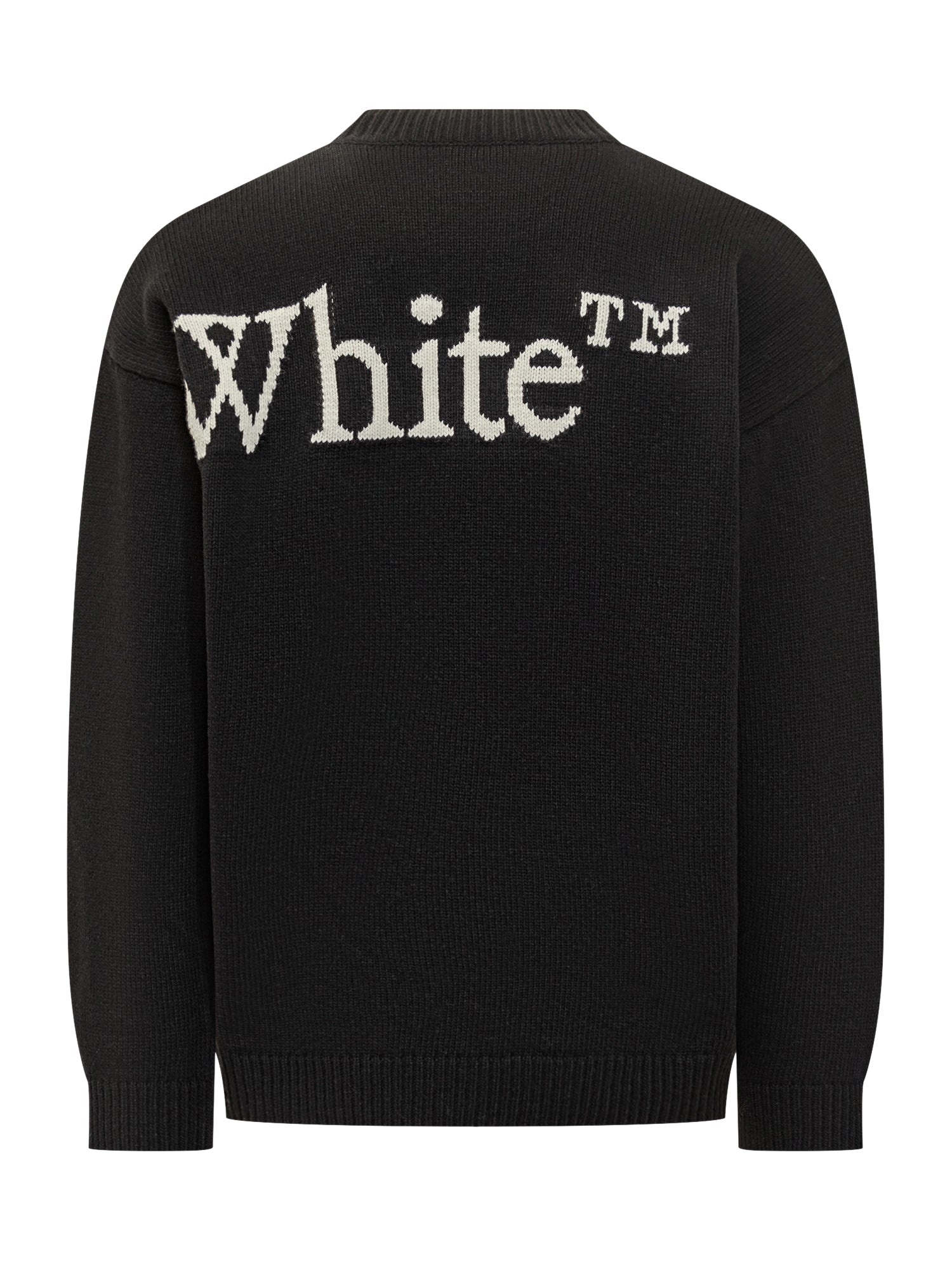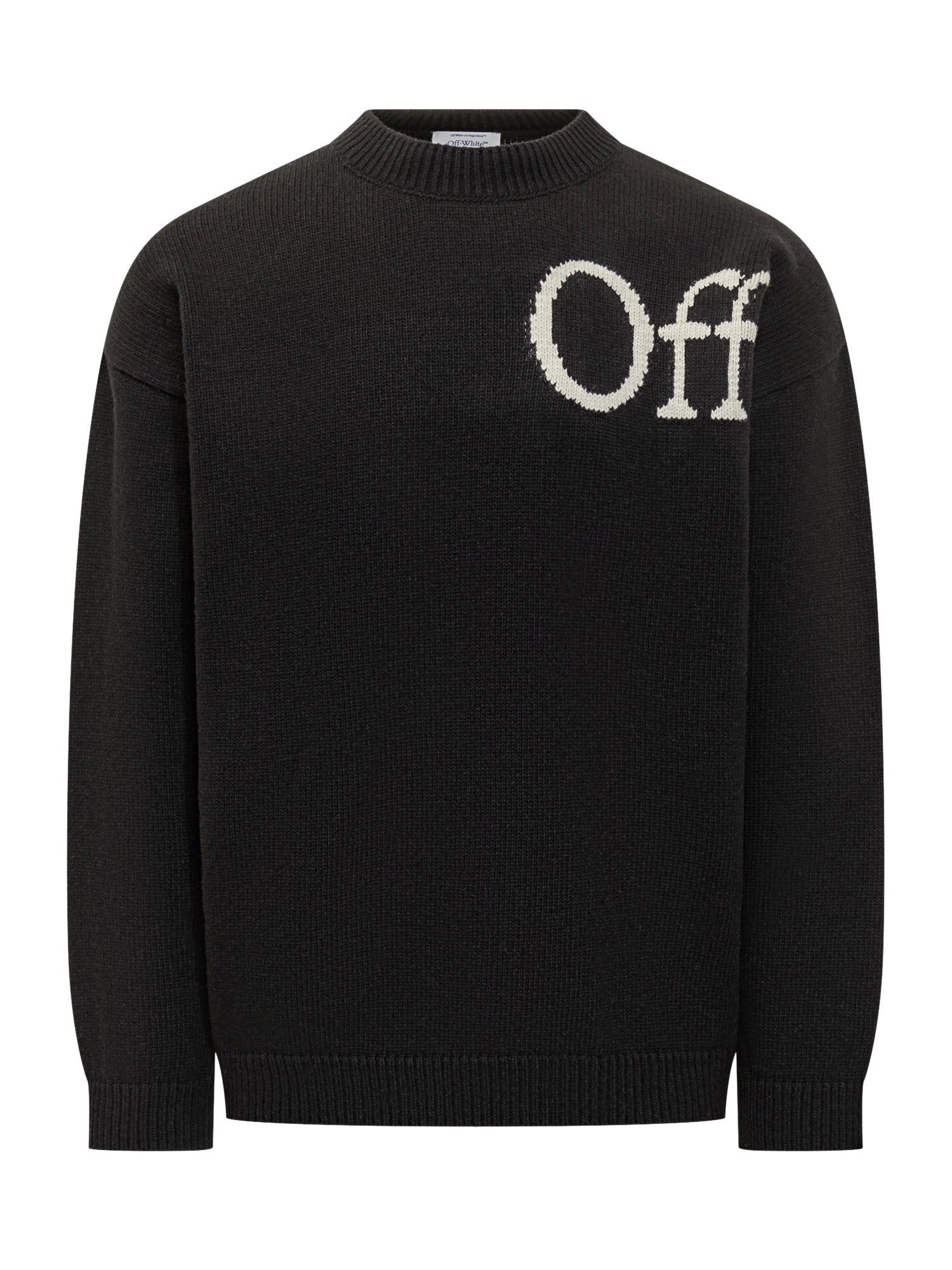 Off-White wool sweater with intarsia design, featuring bold logo details on front and back. Crafted with a regular fit and crew neck.