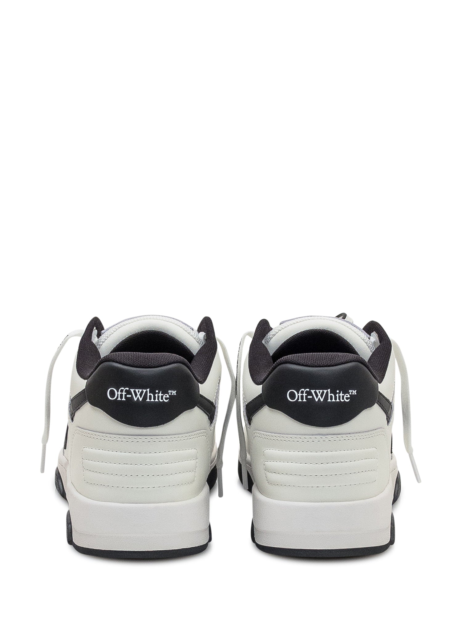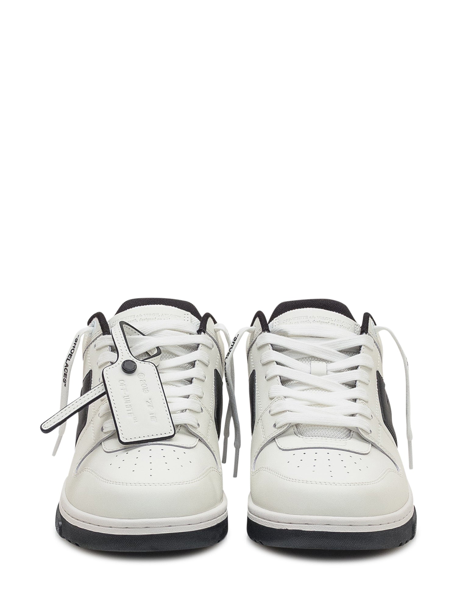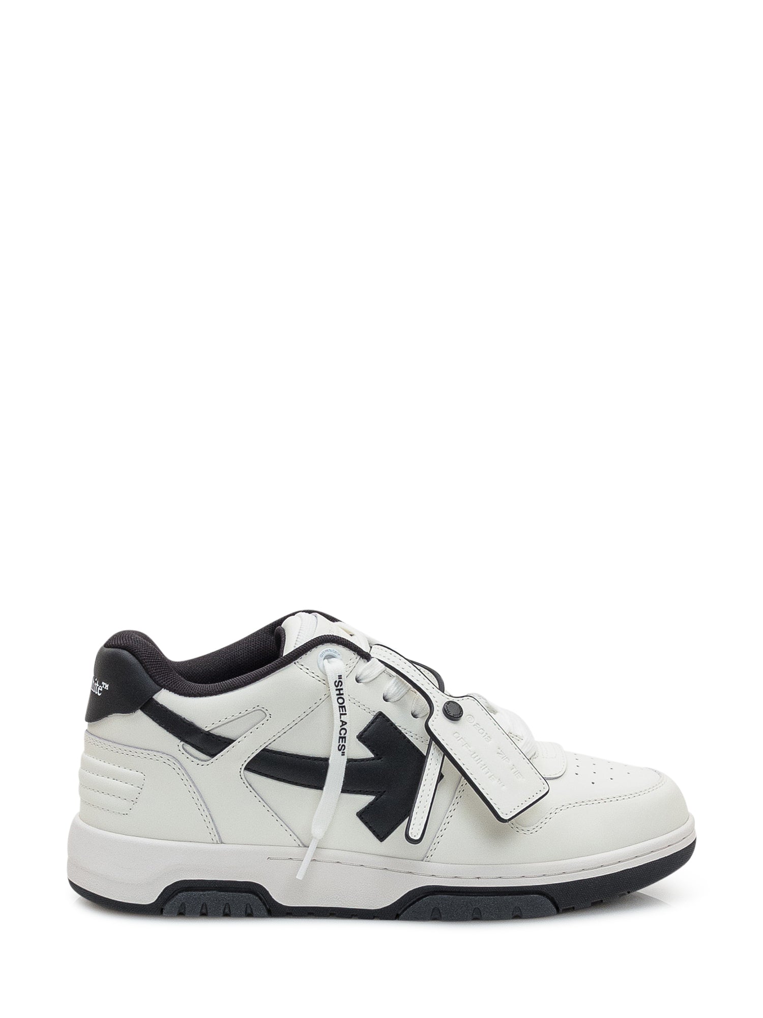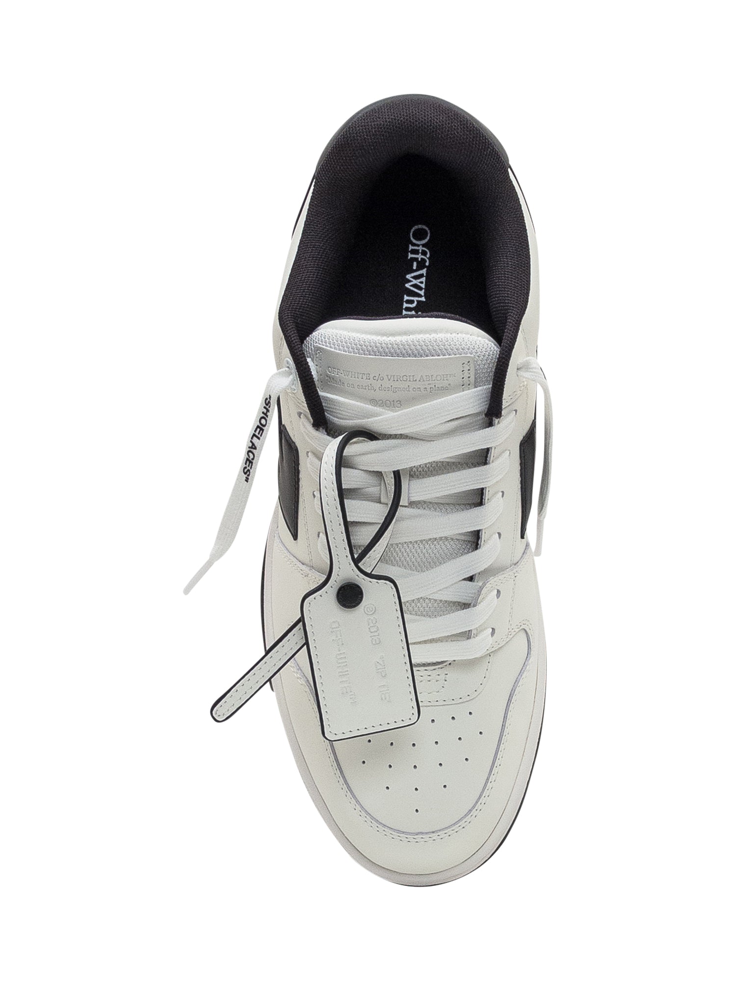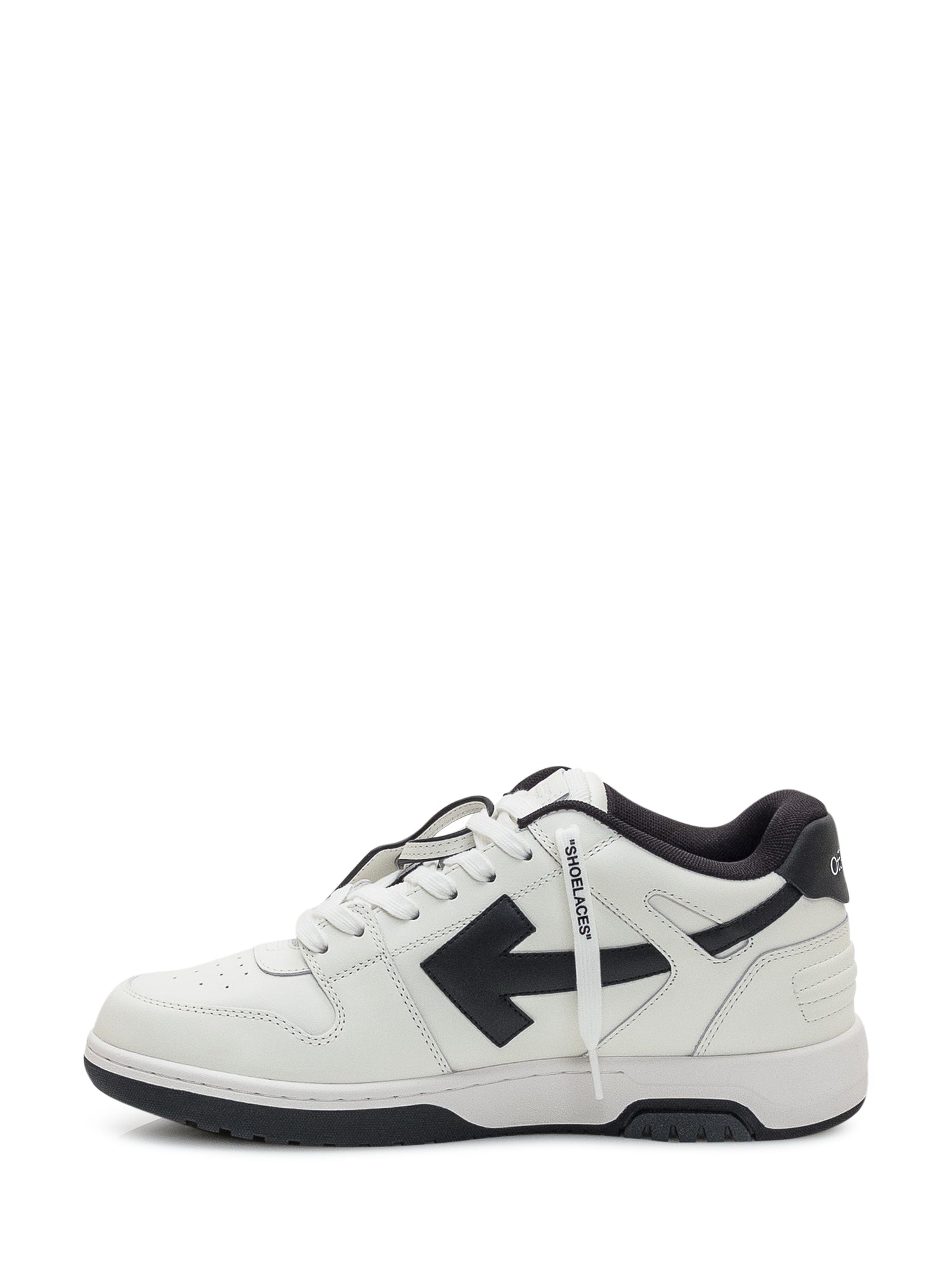 Off-White white sneakers with black details, crafted in leather with signature zip-tie tag and Shoelaces print. Rubber sole and minimal design for a modern streetwear vibe.