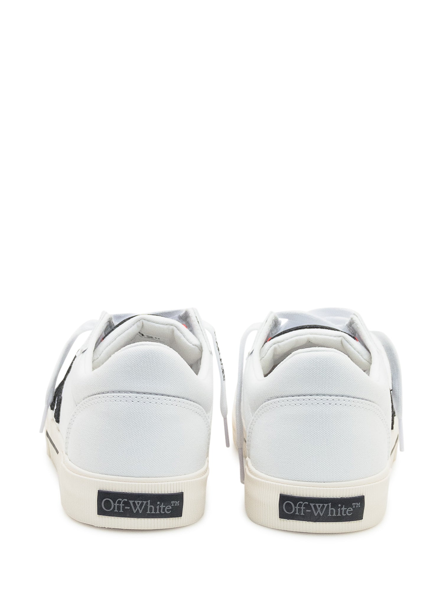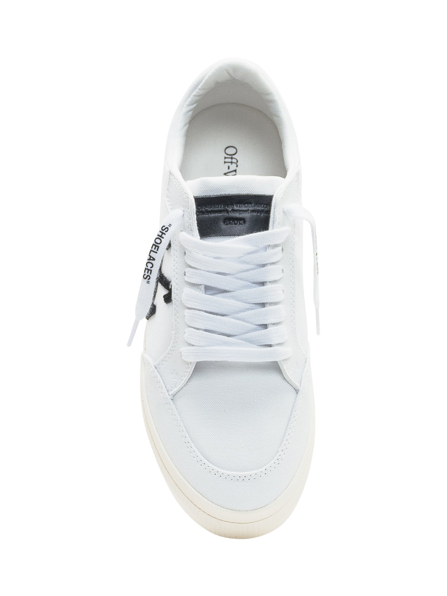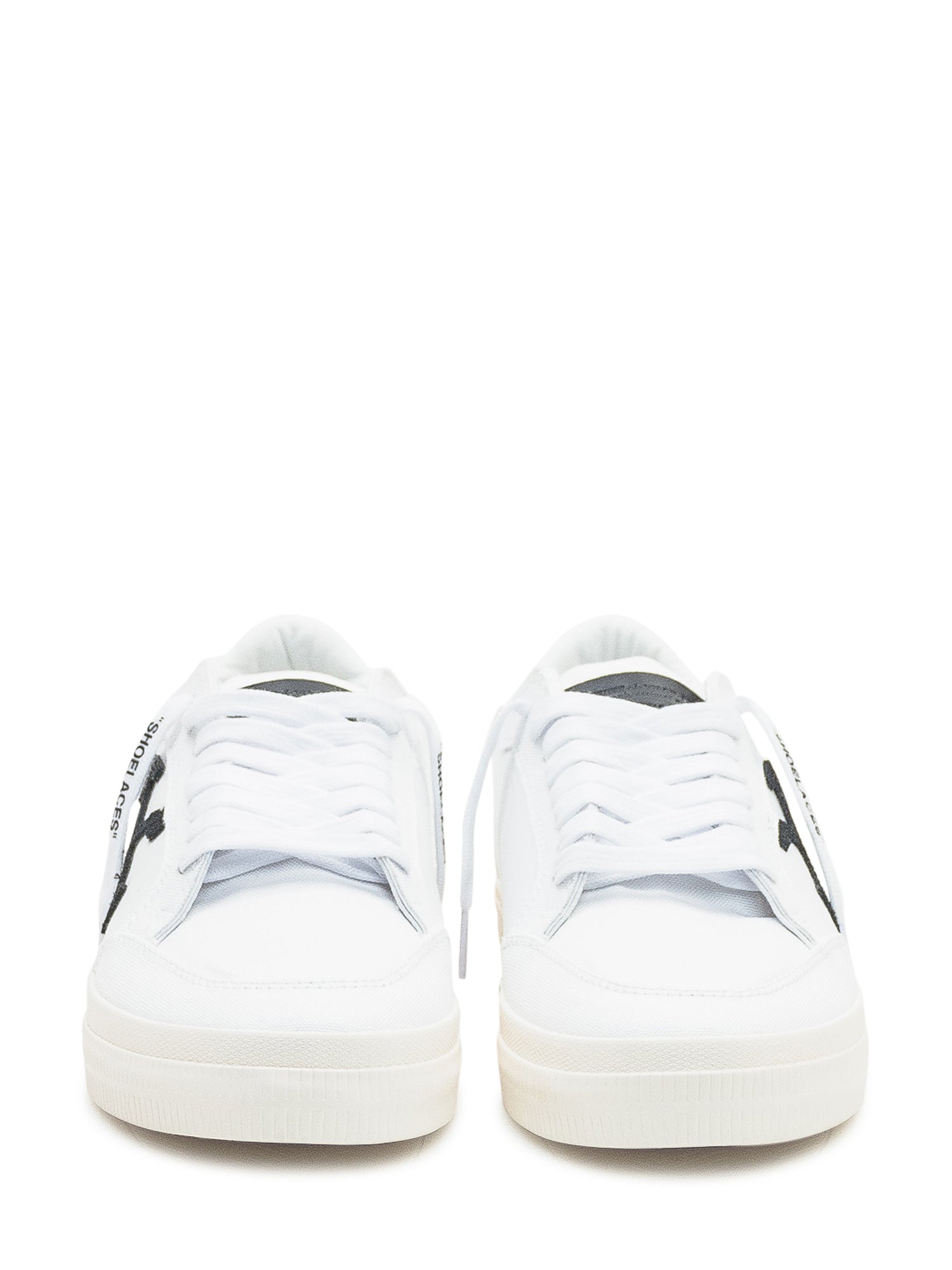 Off-White white canvas sneakers with black embroidered side arrow and printed lace details.