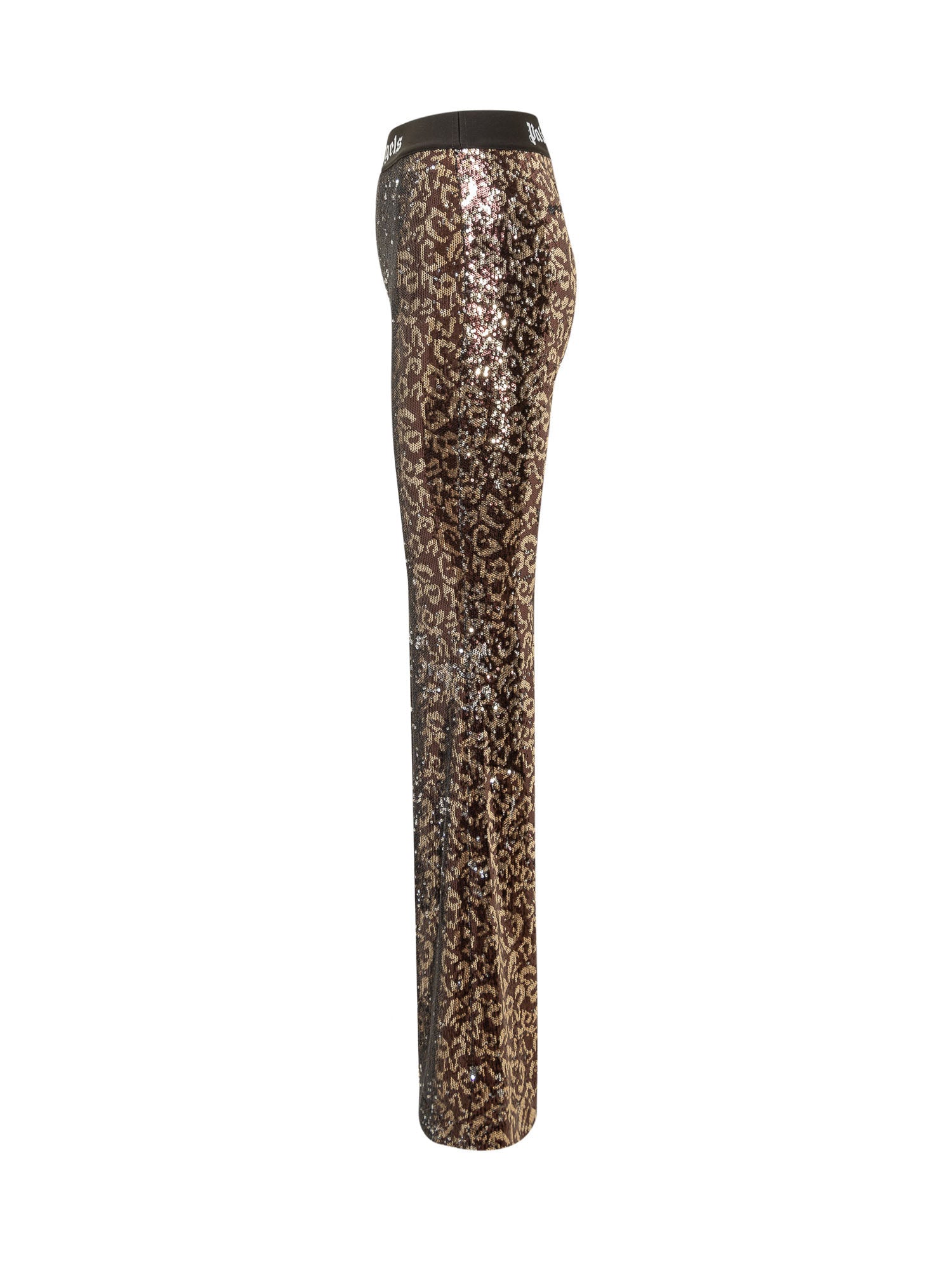 Long trousers. Flared bottom. Elastic waist with logo. Sequins all-over.