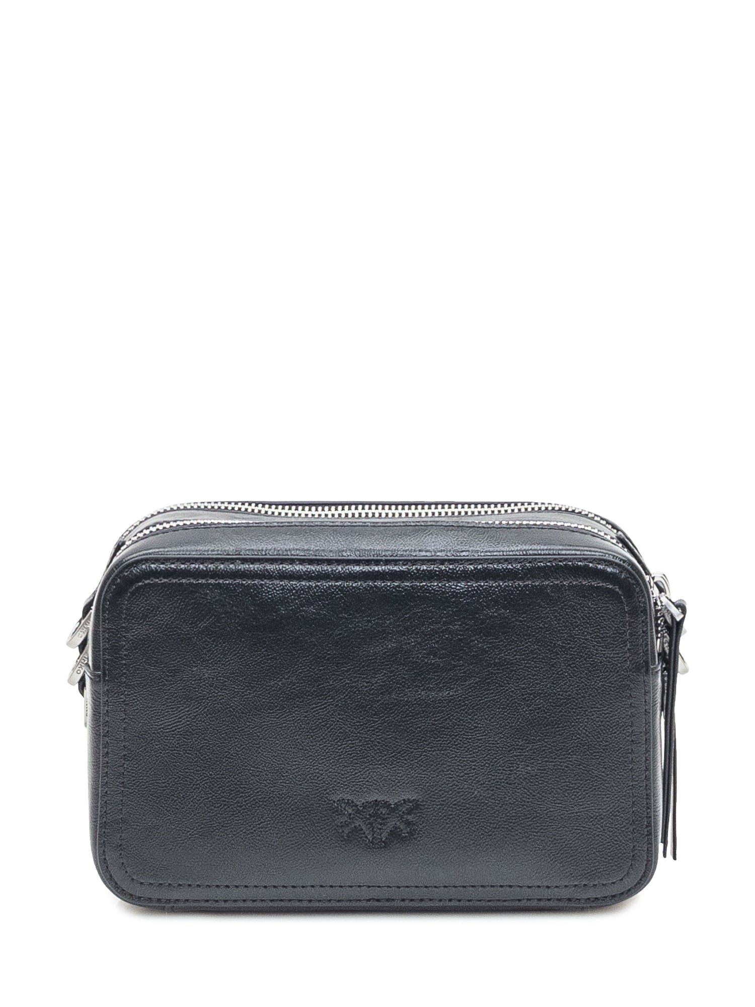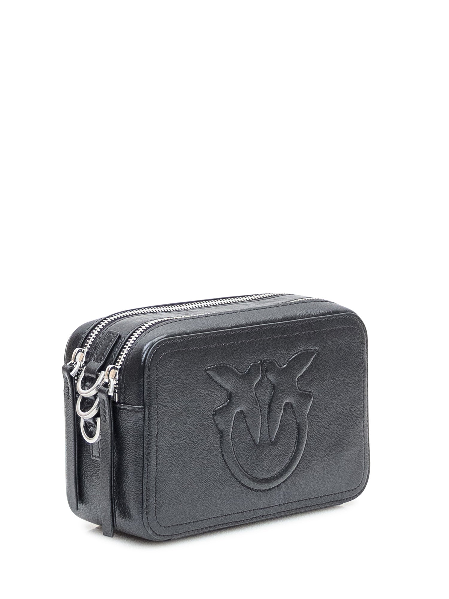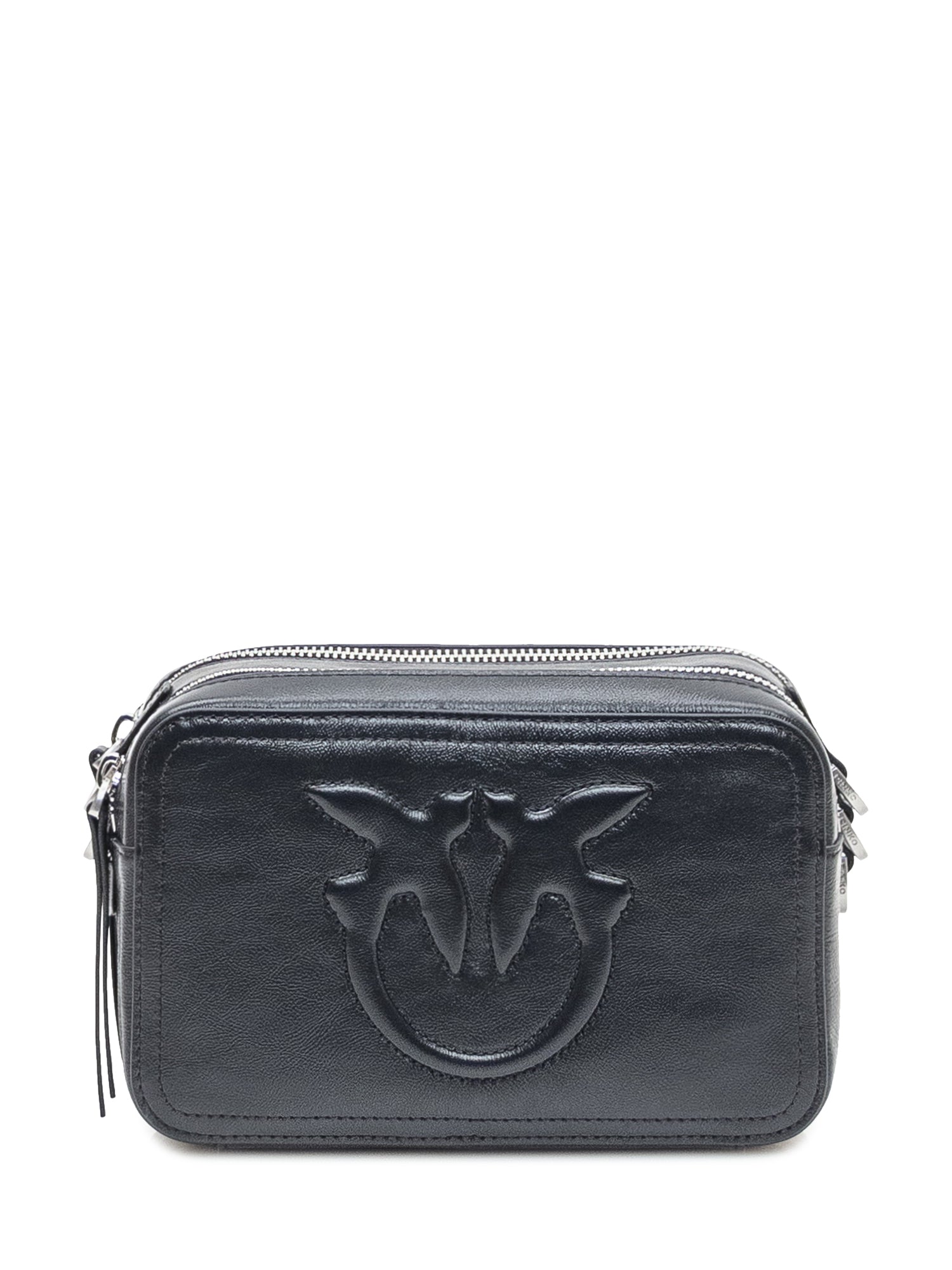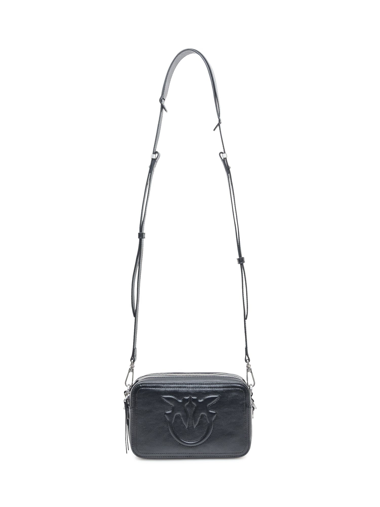 Bag style camera bag, soft and rectangular shape. Made of glossy leather, with a special glossy texture with maxi logo personalization Love Birds in relief. The bag is complete with leather shoulder strap, adjustable and removable with small metal carabiners. The interior is organized in two compartments, lined with cotton drill and closed with zip, leather zipper.