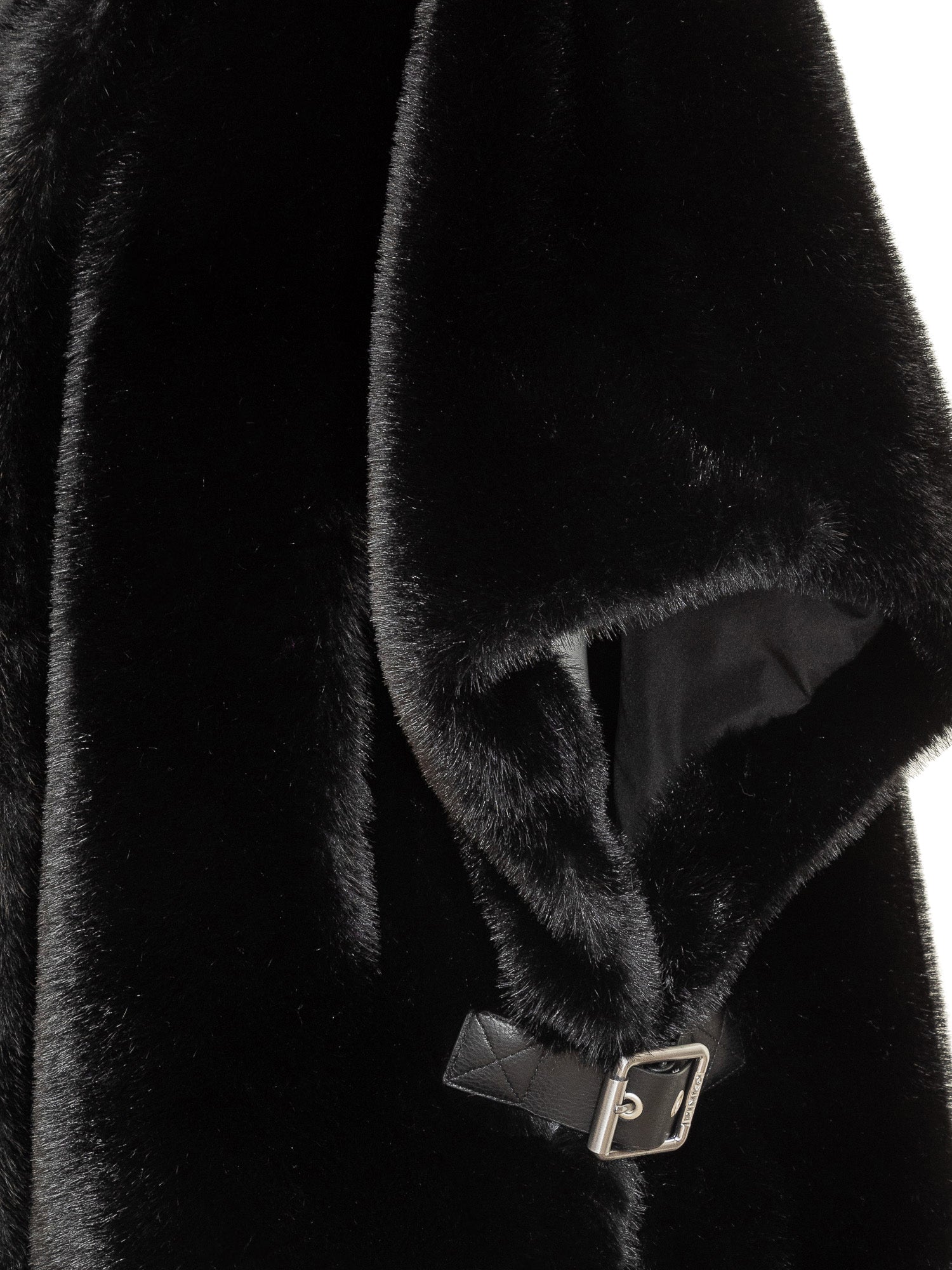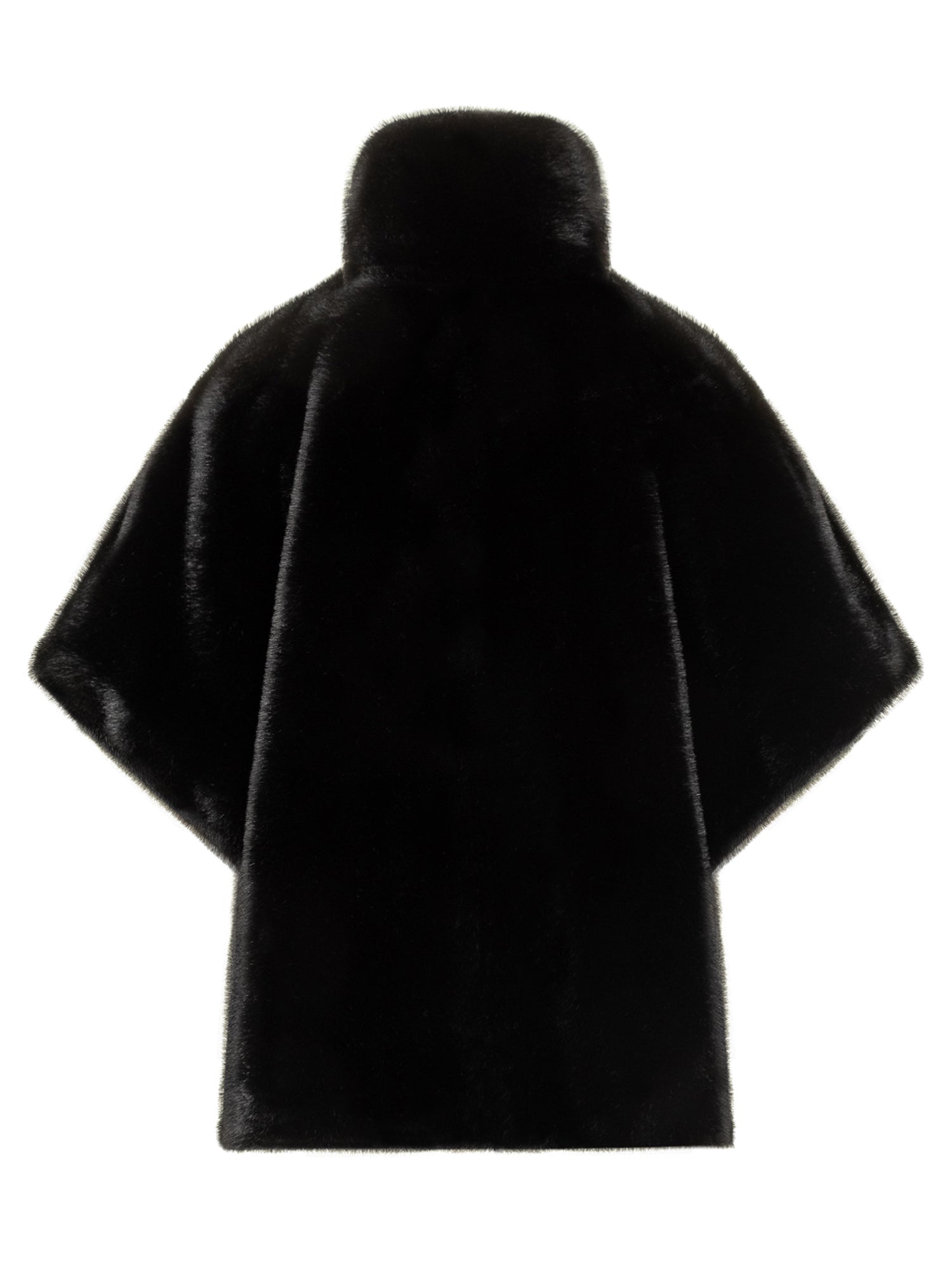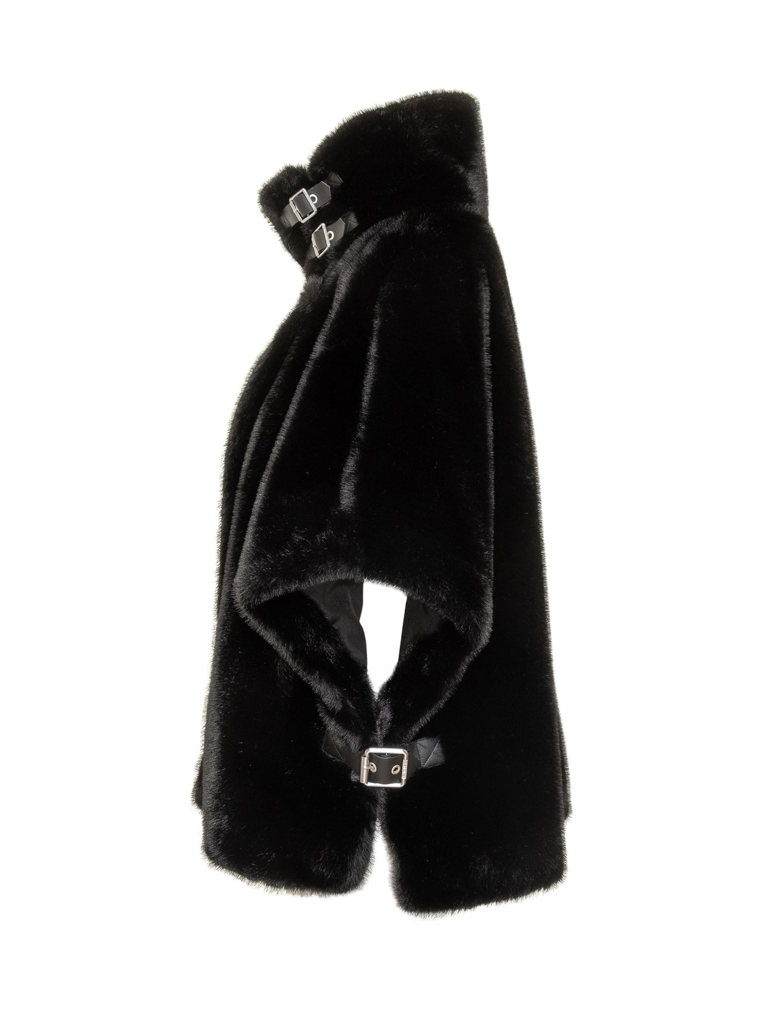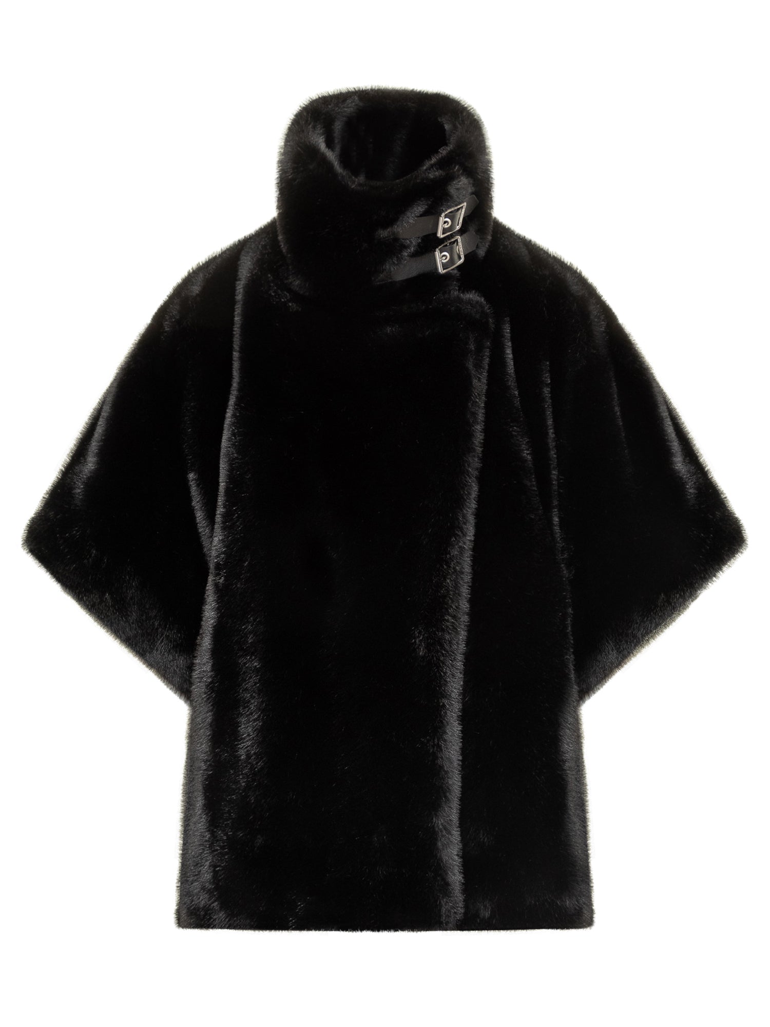 Black faux fur cape with structured high neck and double side buckle. Warm and elegant, perfect for a sophisticated winter look.