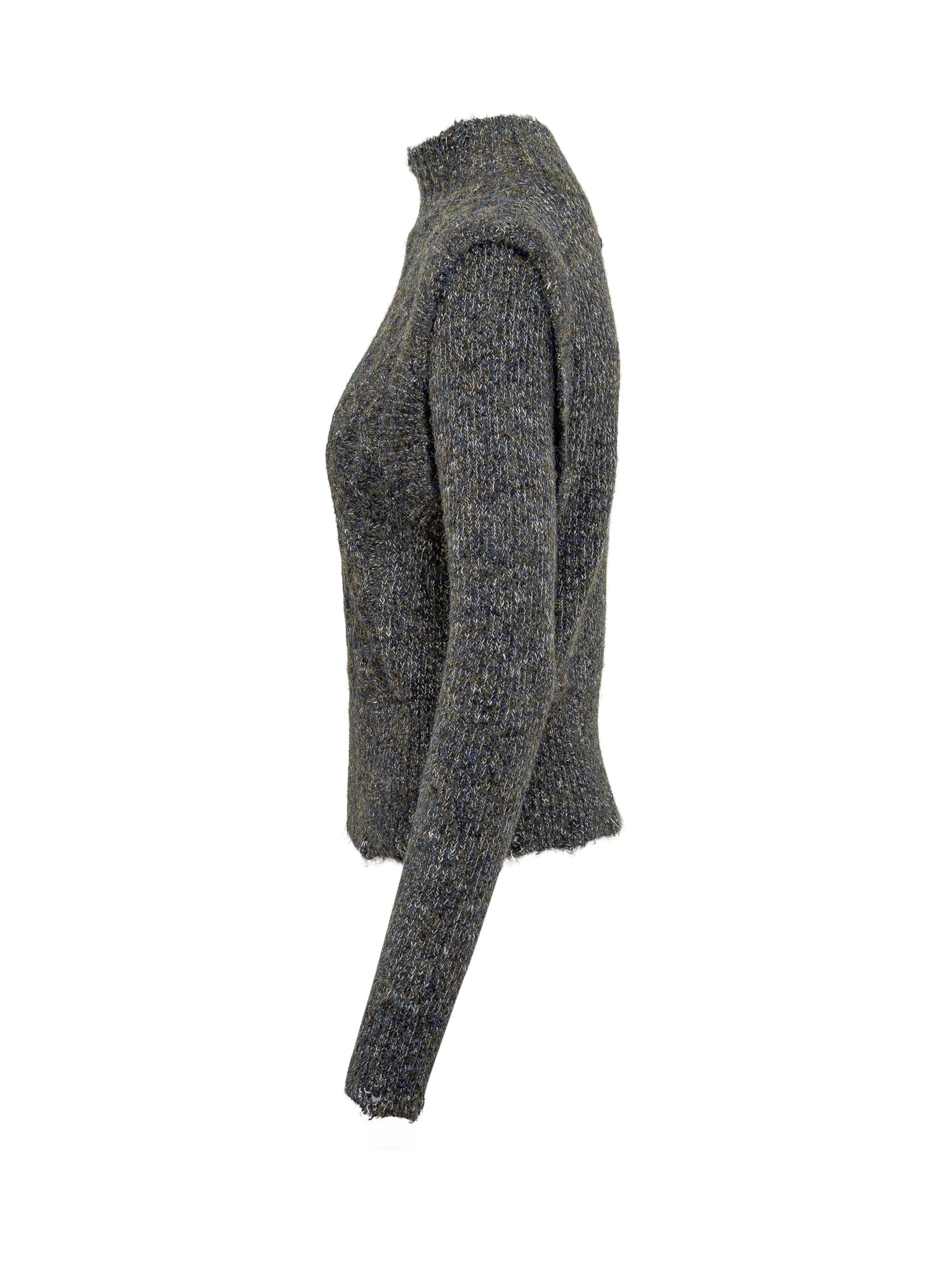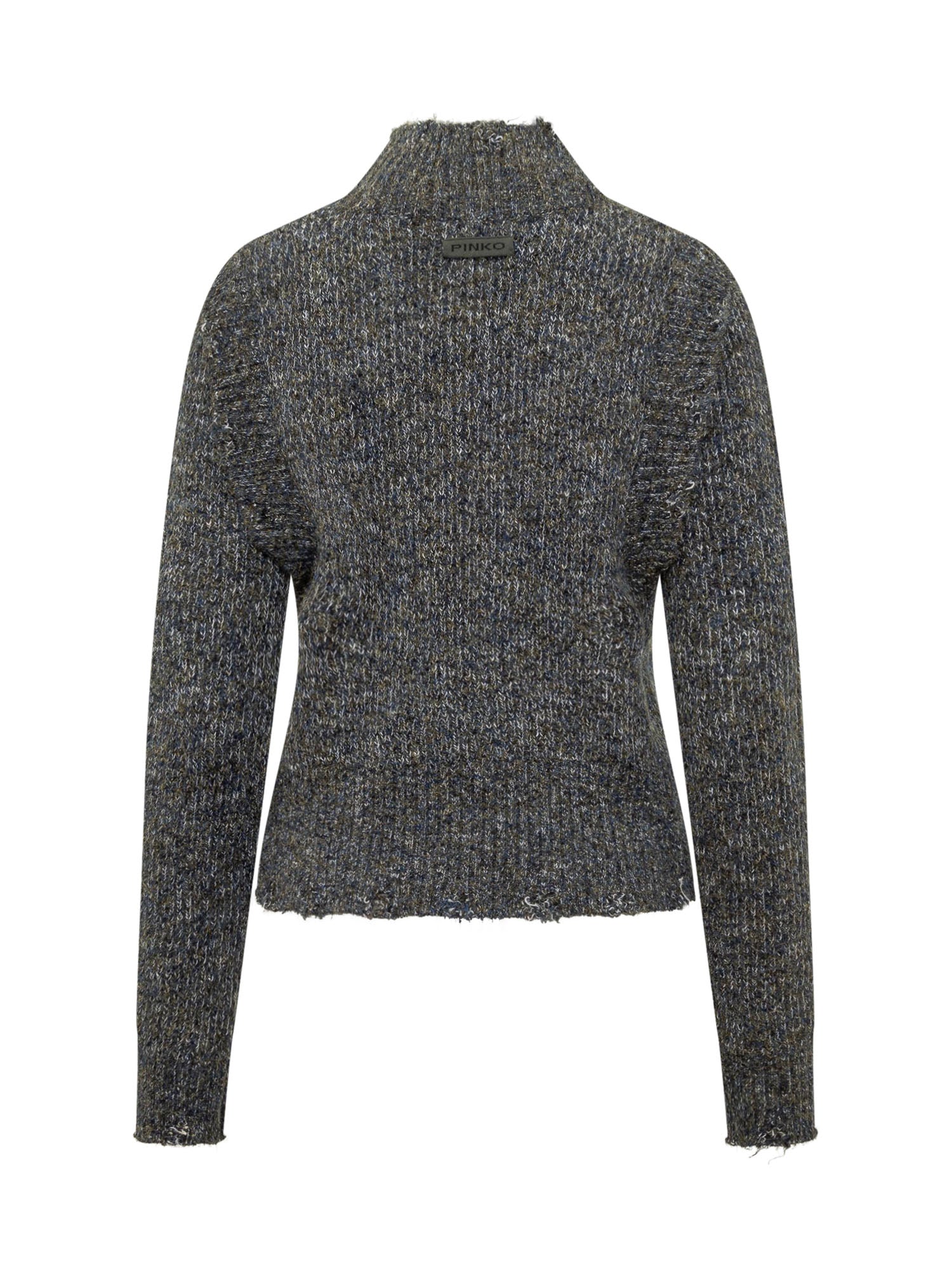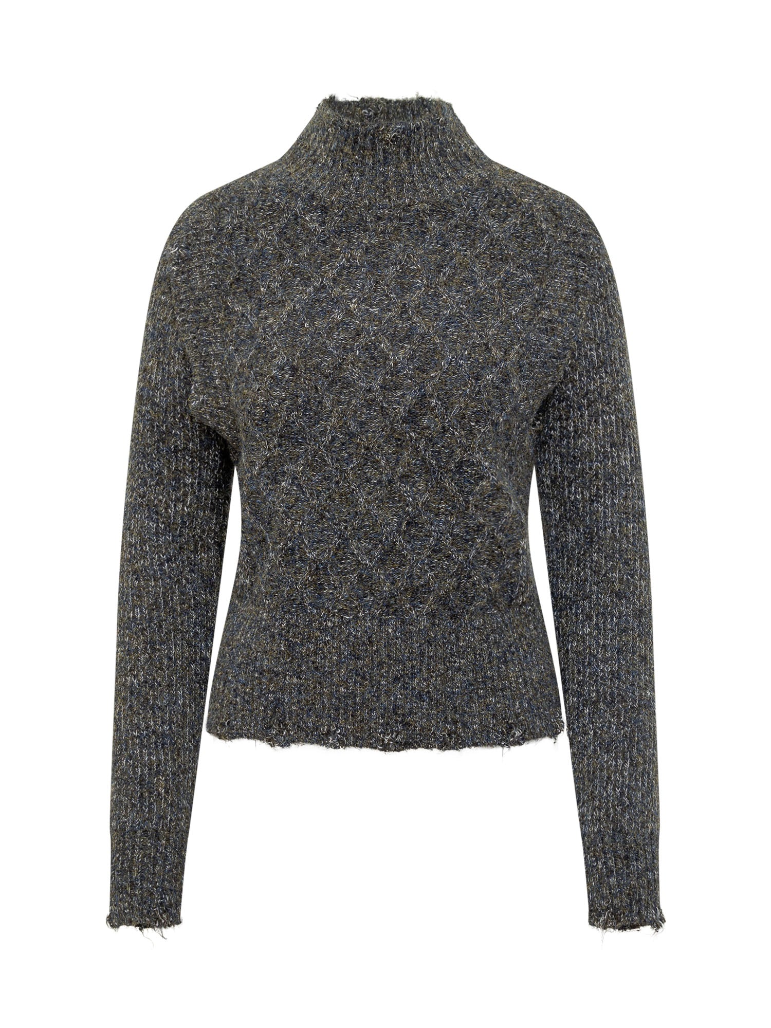 Grey Pinko sweater with lurex details and high neck. Diamond-knit pattern and frayed finishes.