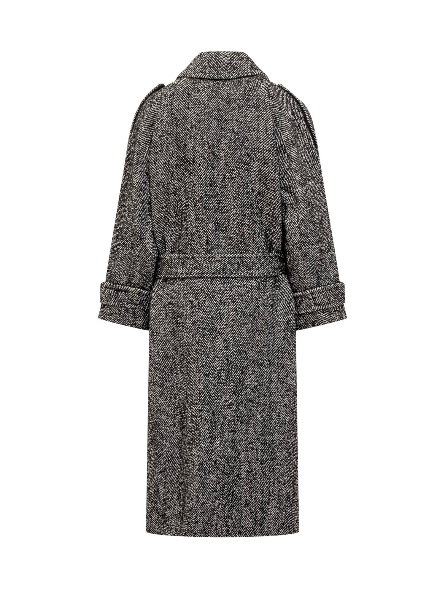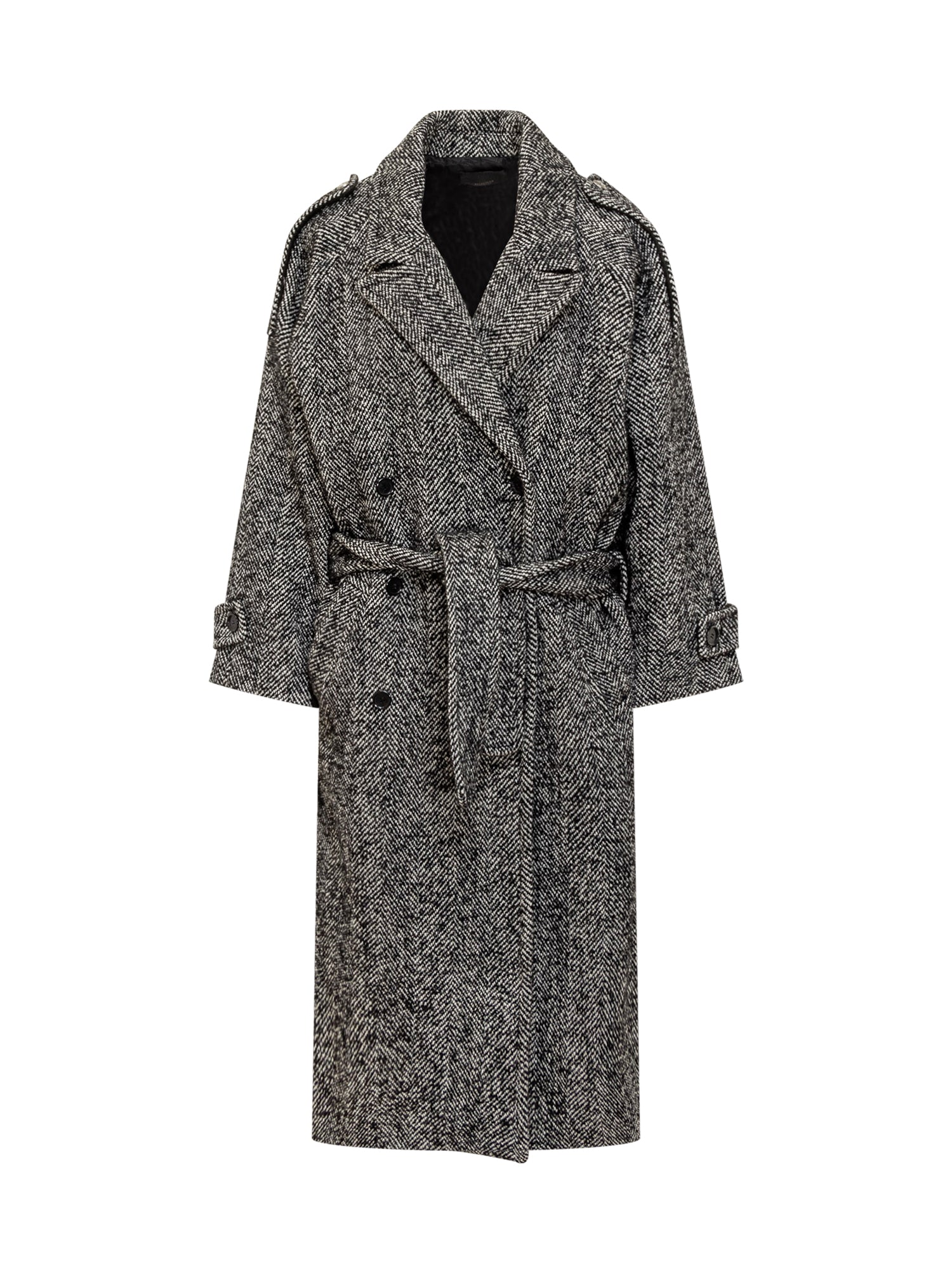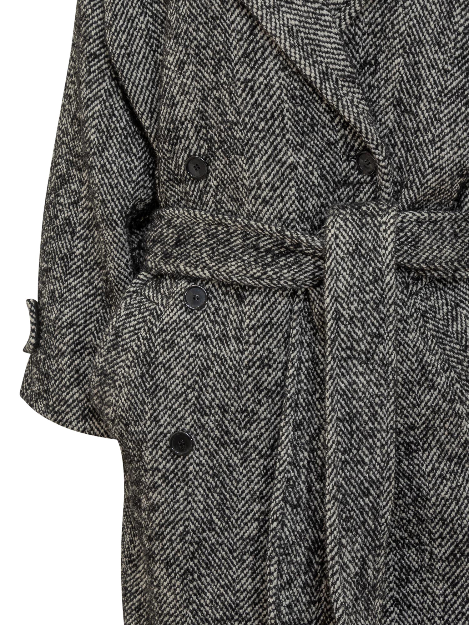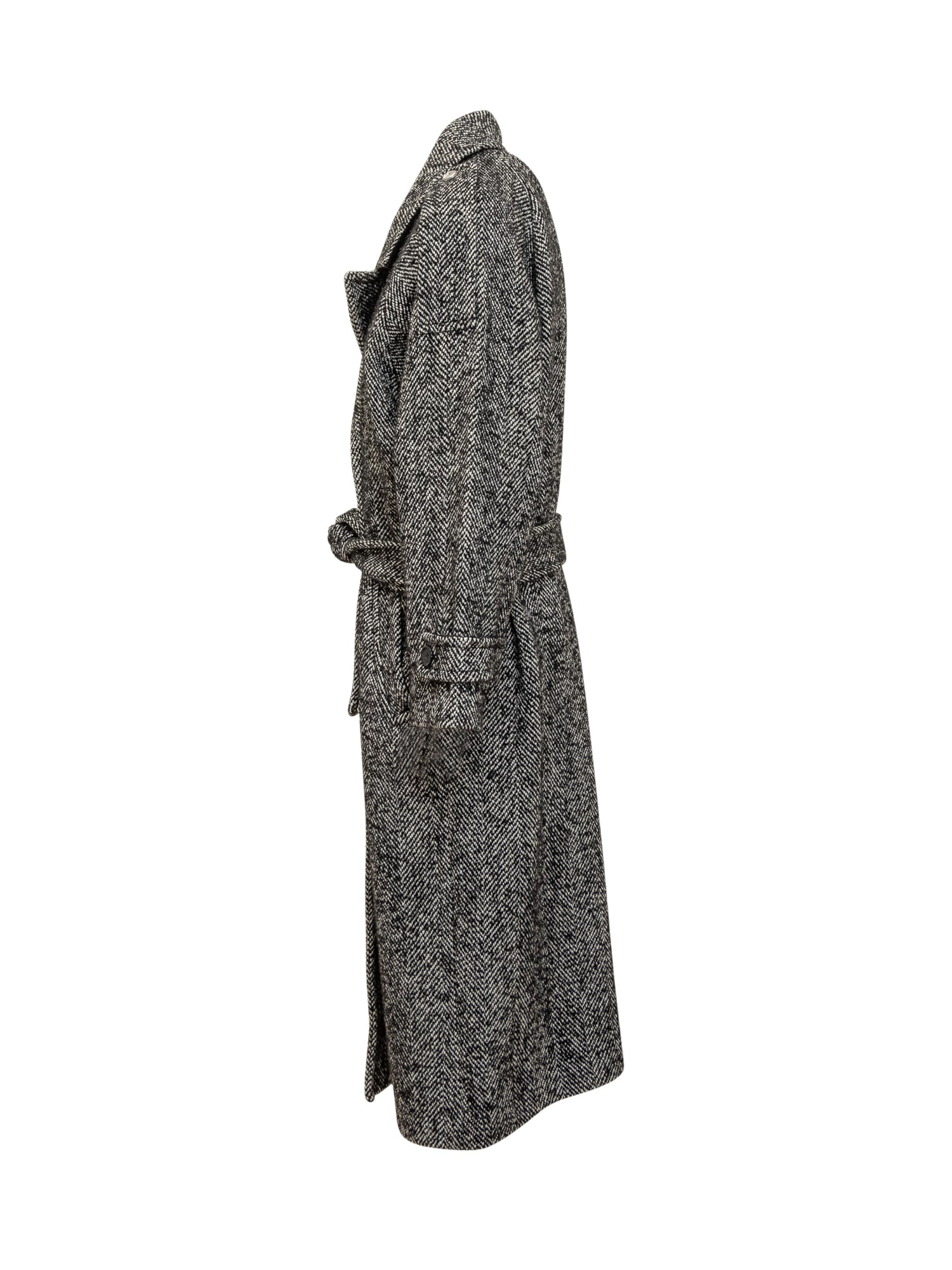 Pinko long wool coat in black and white chevron pattern. Double-breasted design with waist belt and wide lapels.