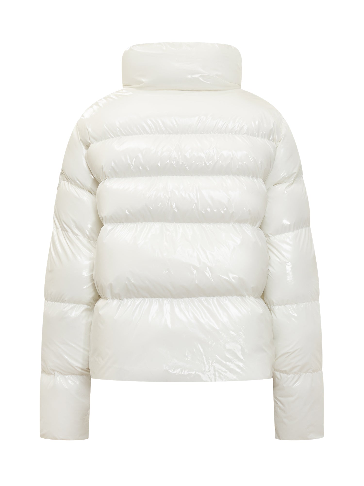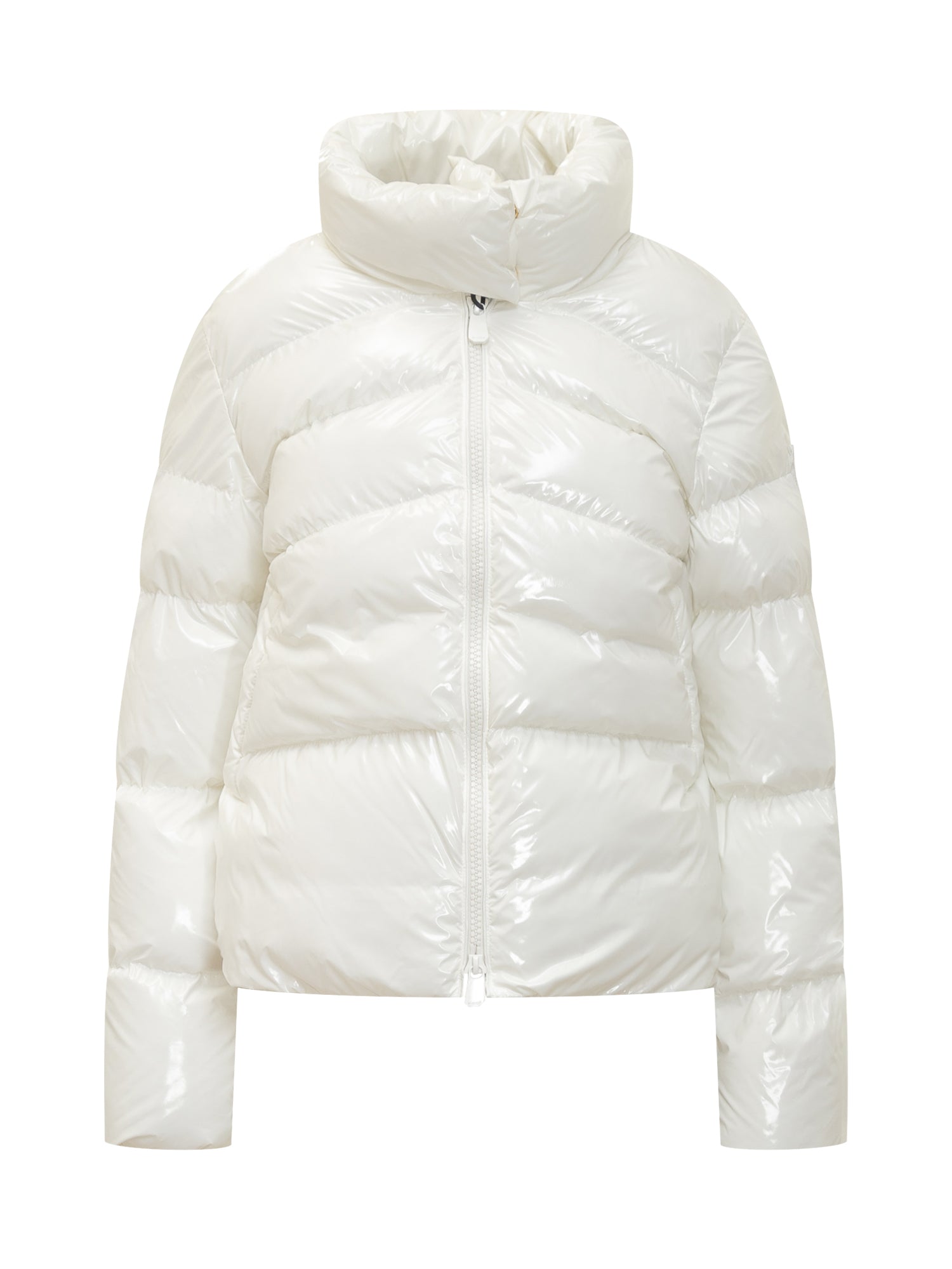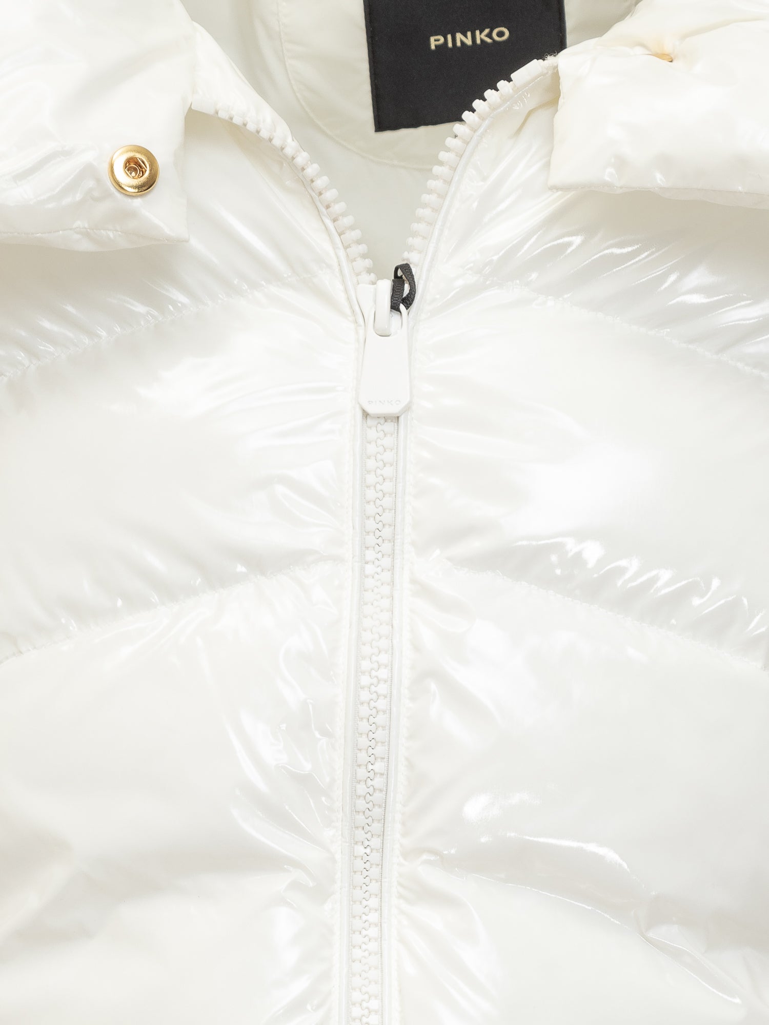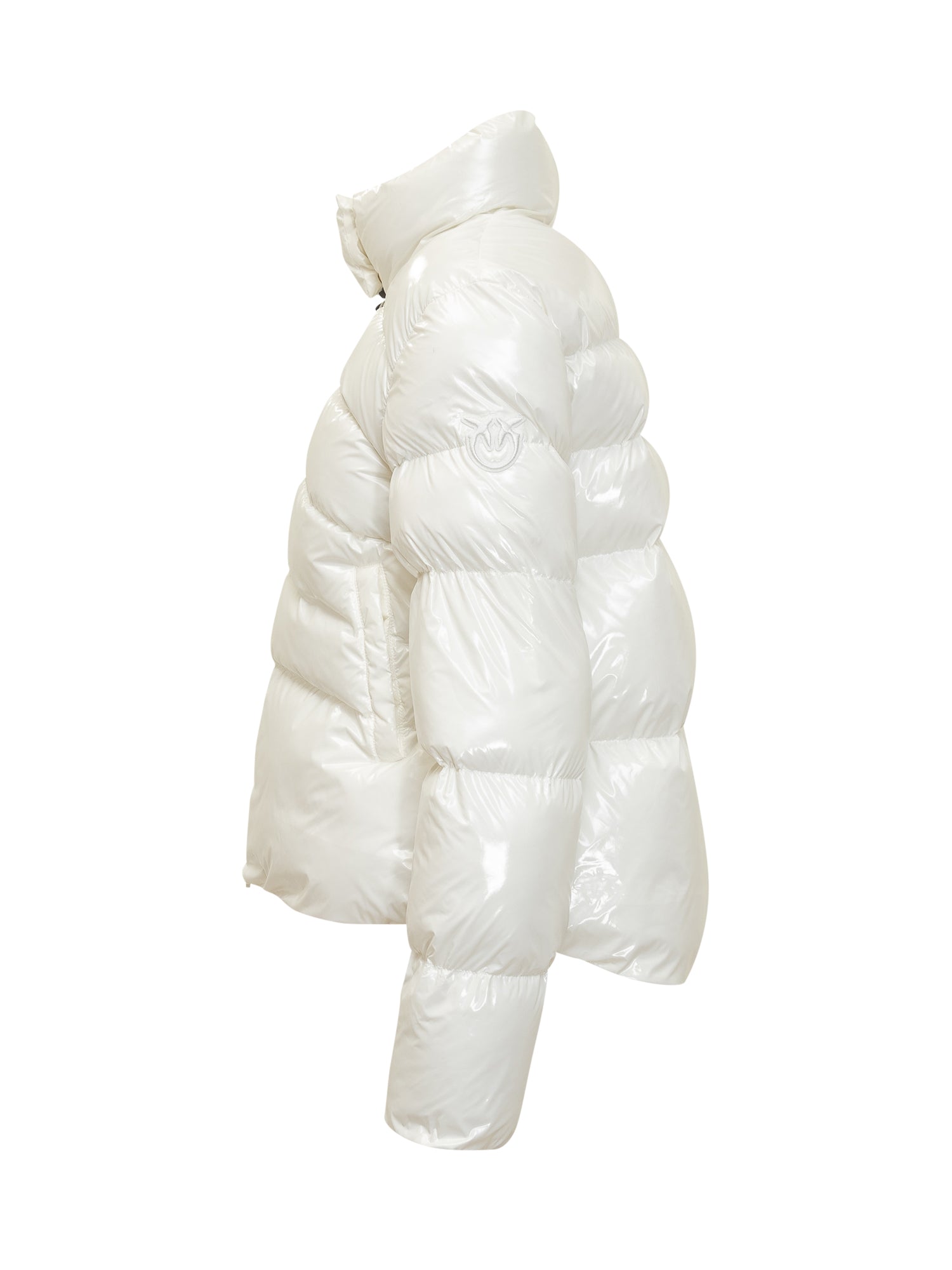 Short Micro Caban puffer by Pinko in glossy white vinyl-effect fabric. Features a high neck, zip closure, and warm padding.
