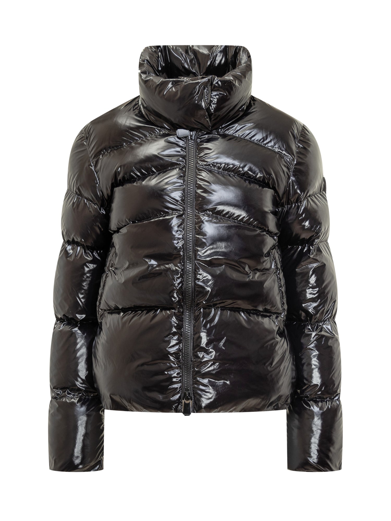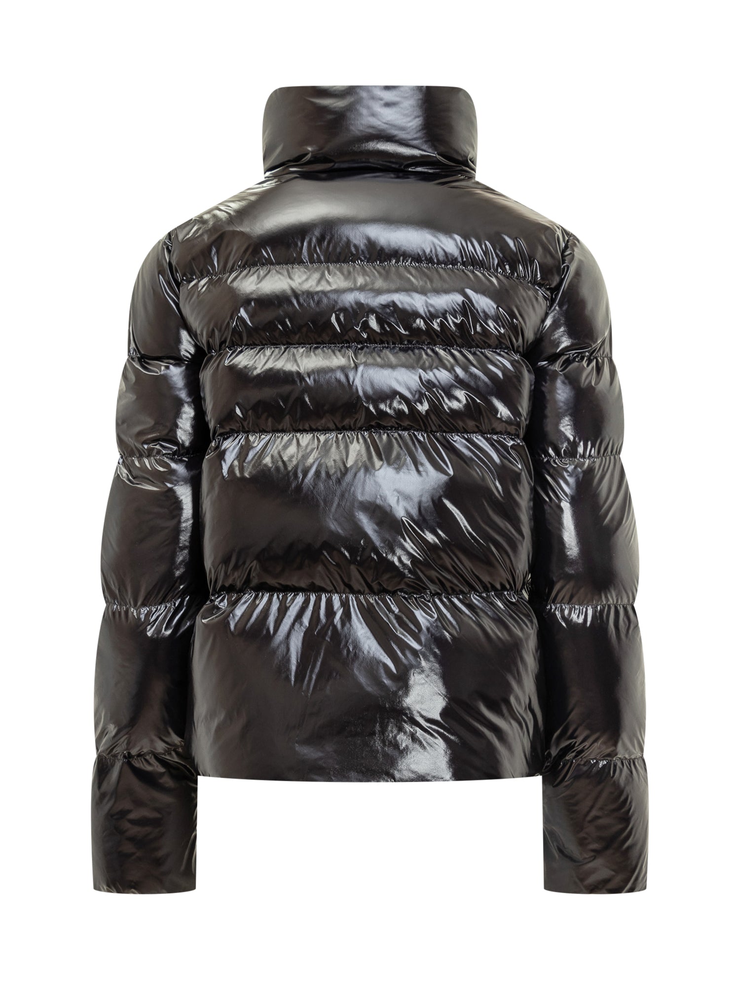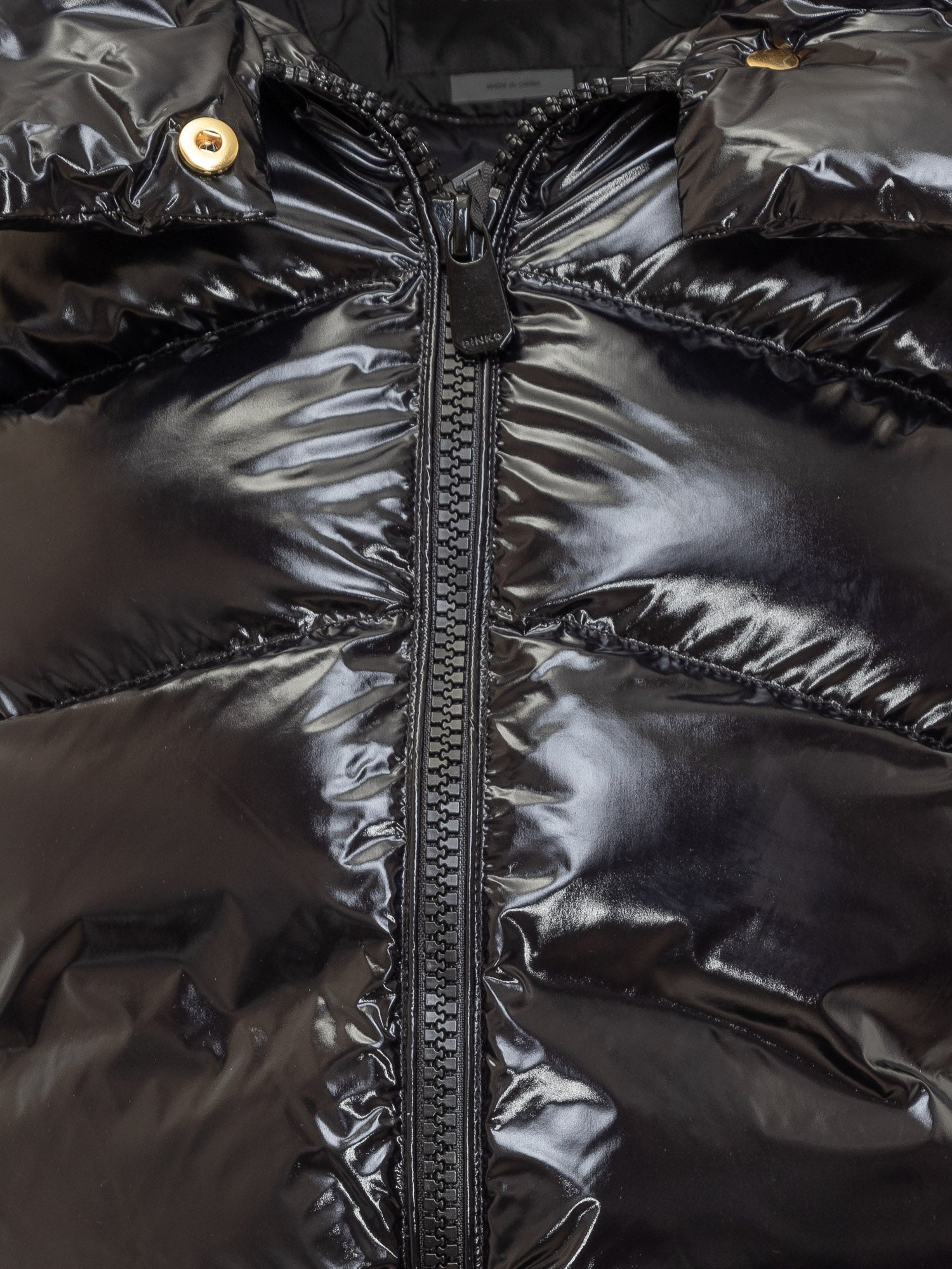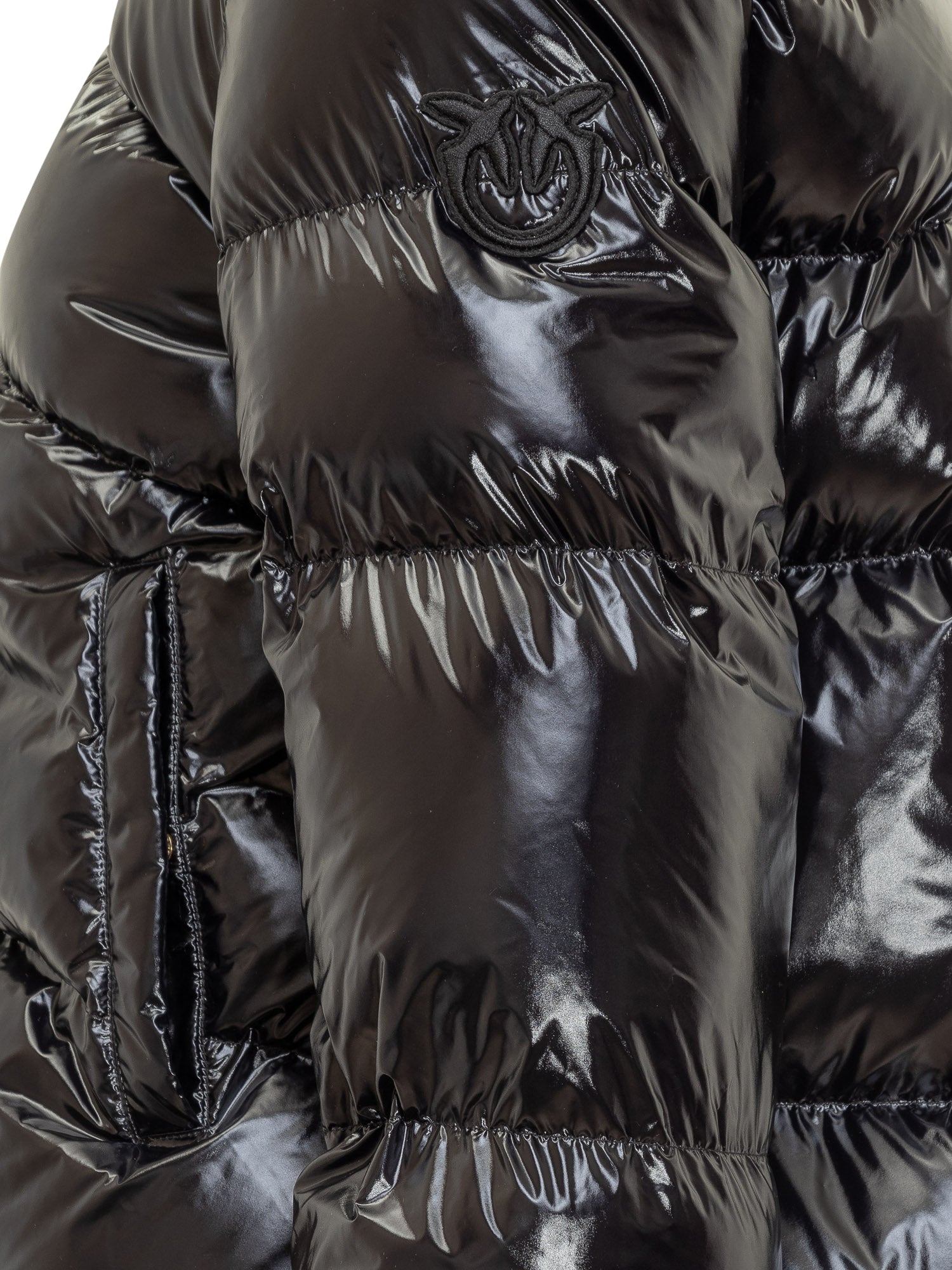 Short Micro Caban puffer by Pinko in glossy vinyl-effect fabric. Features a high funnel neck, front zip closure and warm padding.