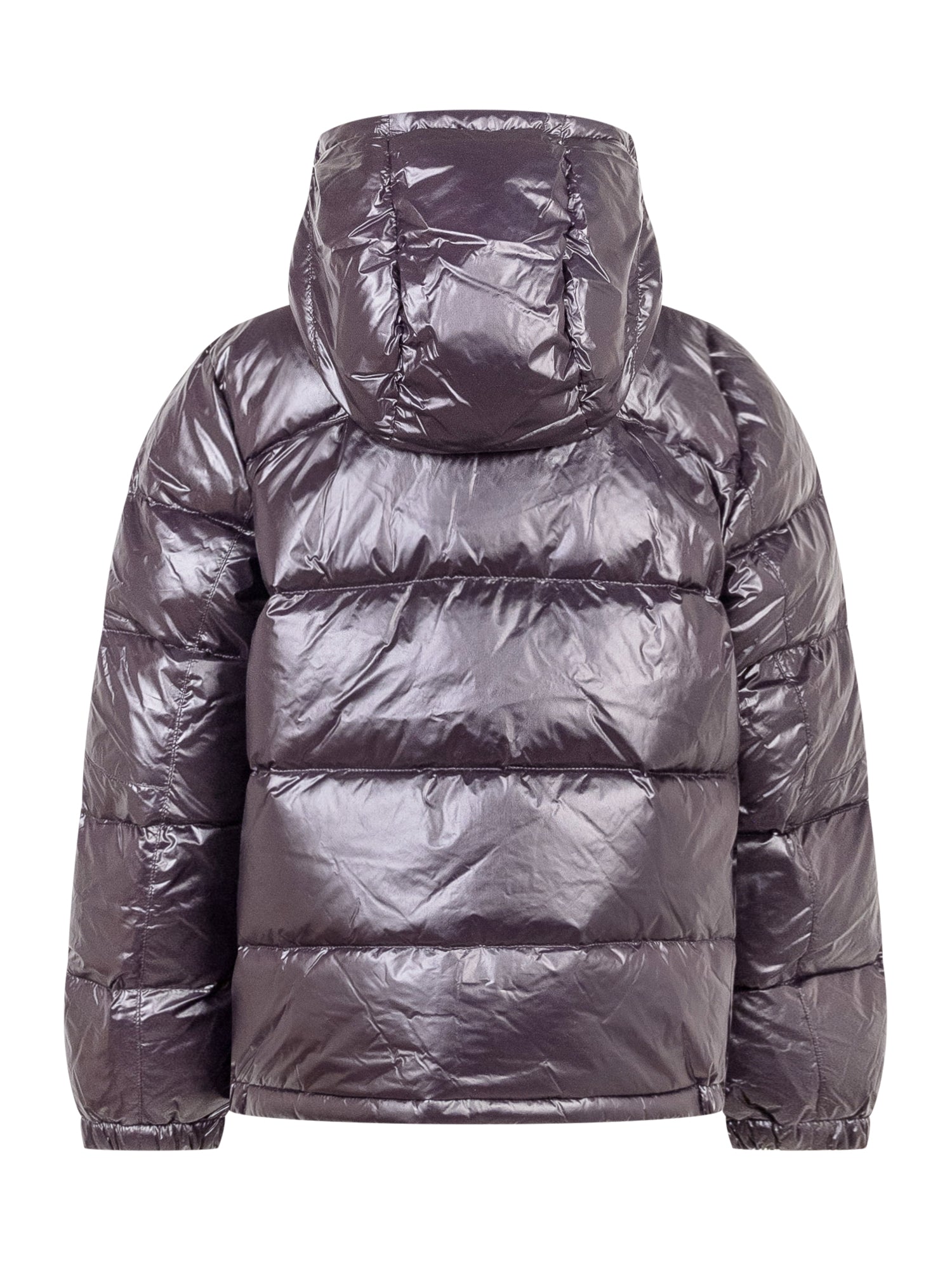 Polo Ralph Lauren shiny purple puffer jacket with hood and red embroidered logo.