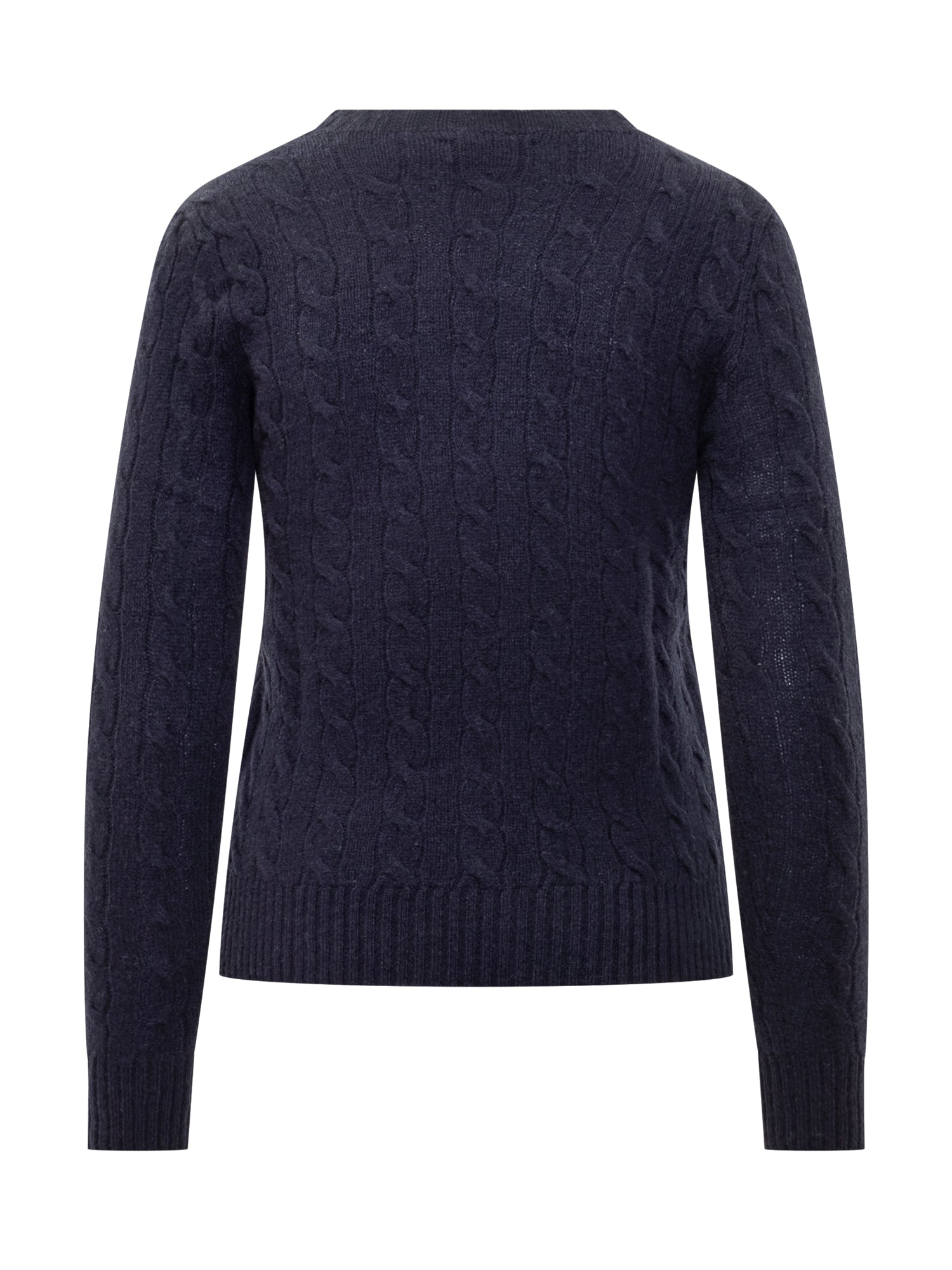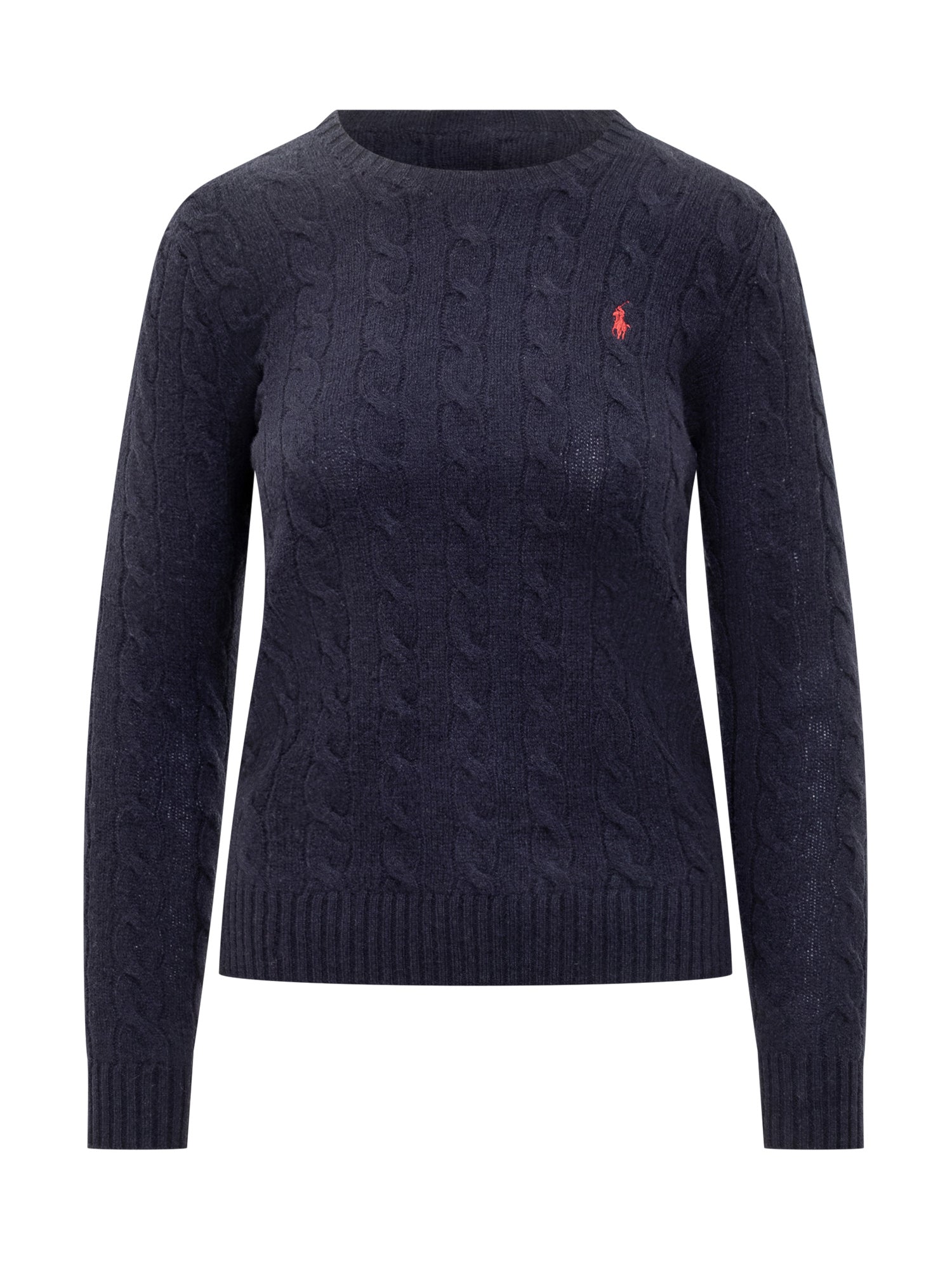 Women's navy wool sweater with cable-knit design, crewneck and red embroidered logo.